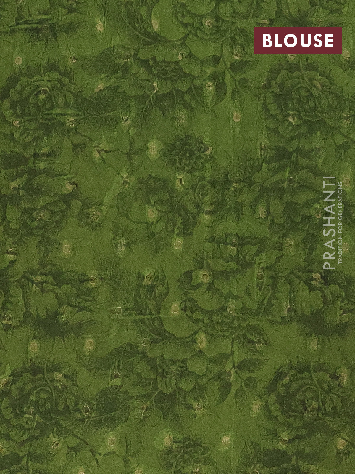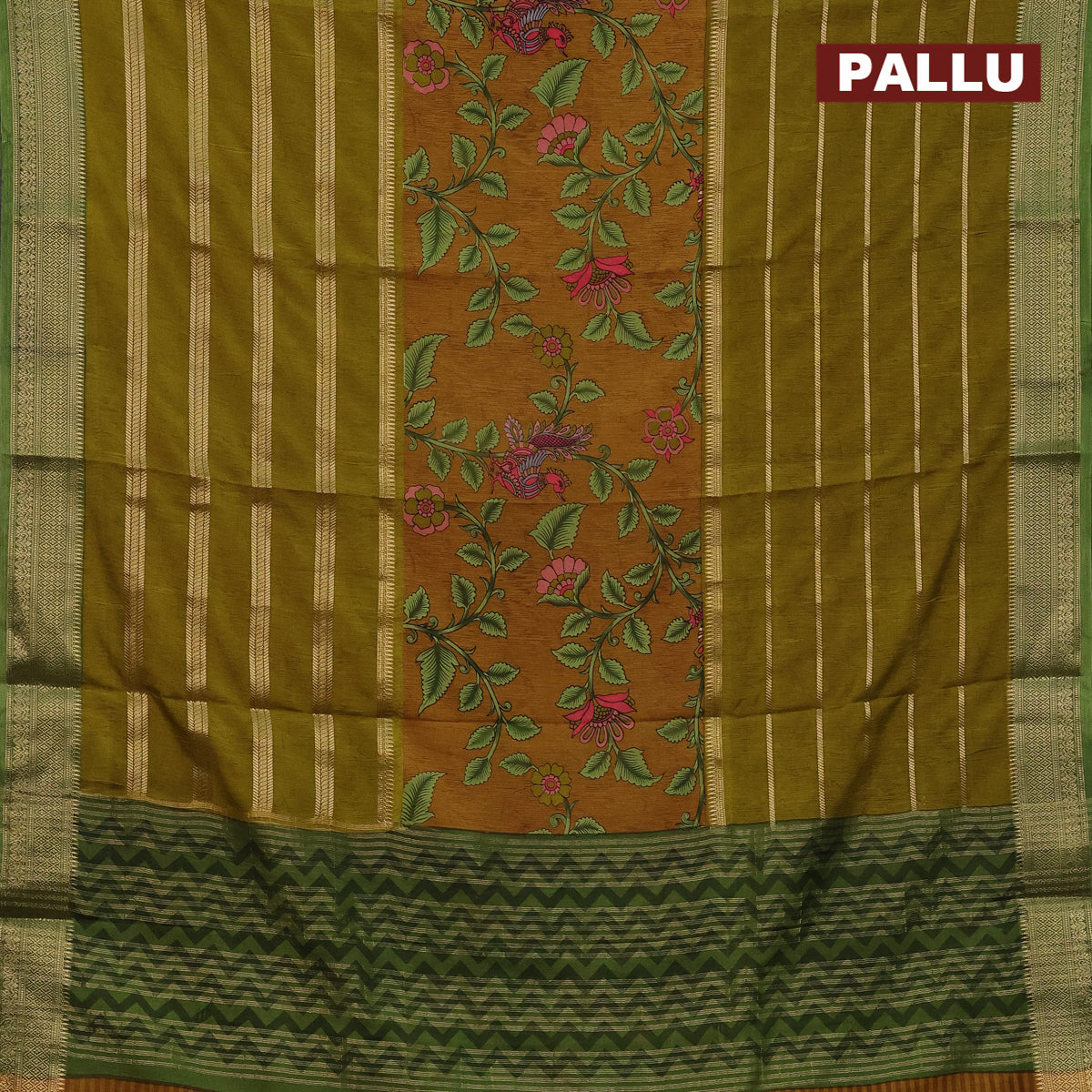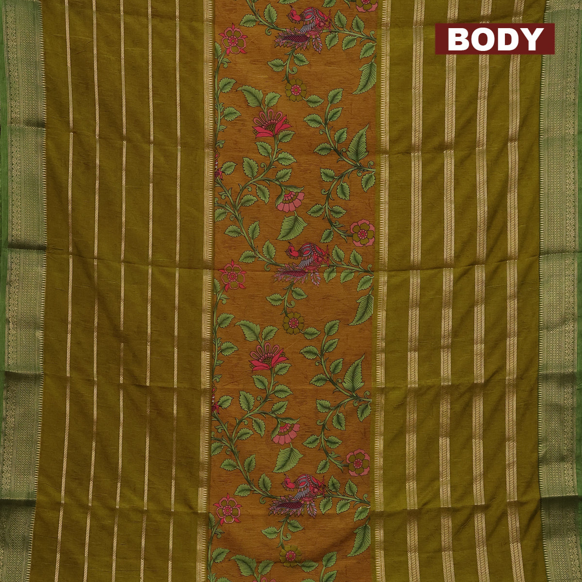 Semi crepe saree mustard shade and mehendi green with kalamkari prints and long zari woven simple border