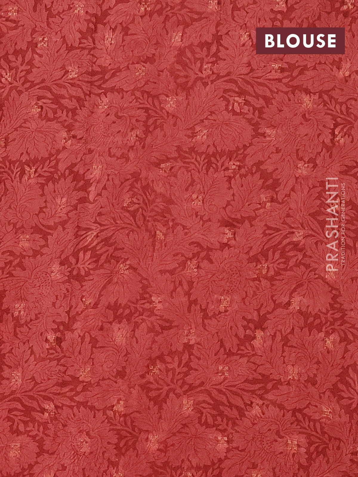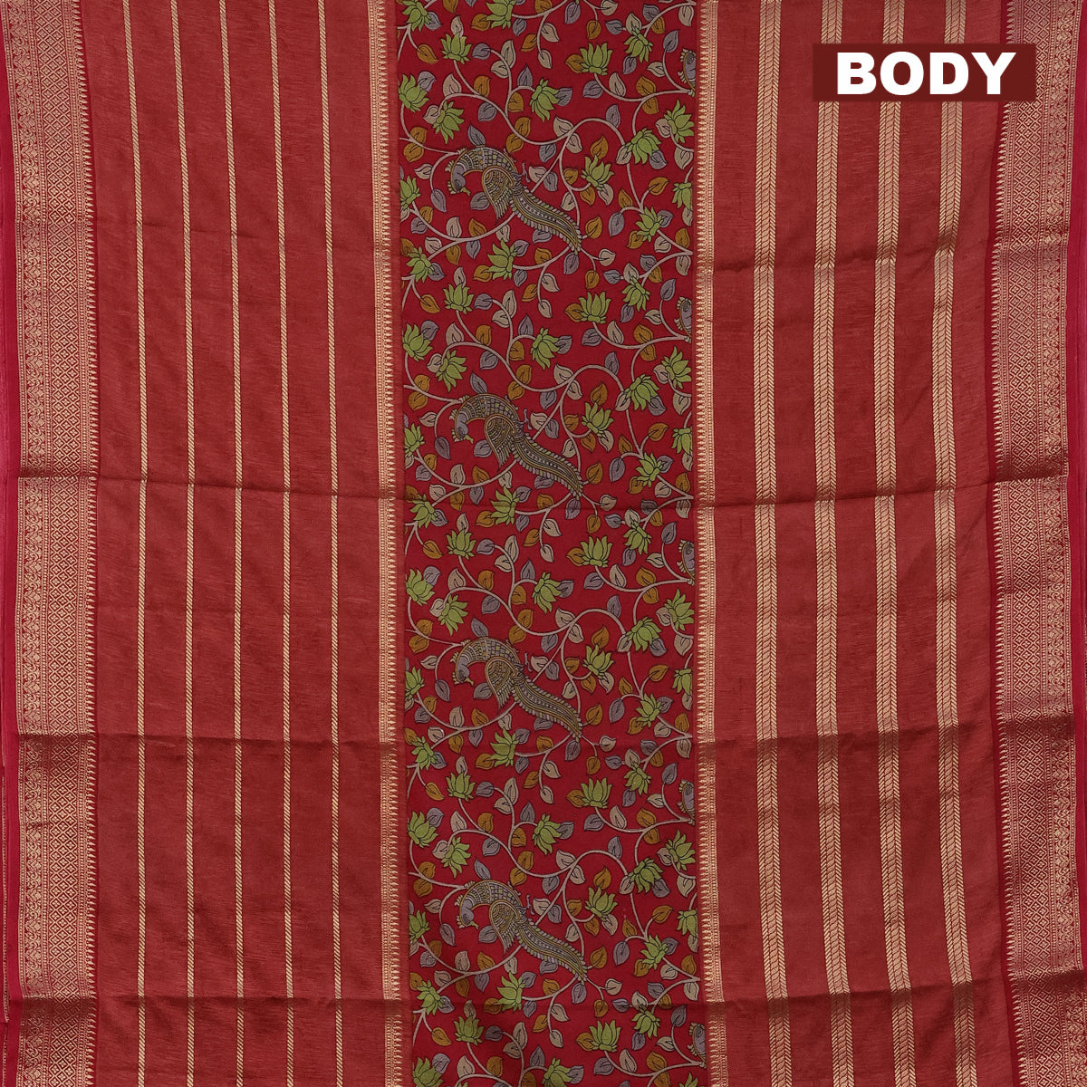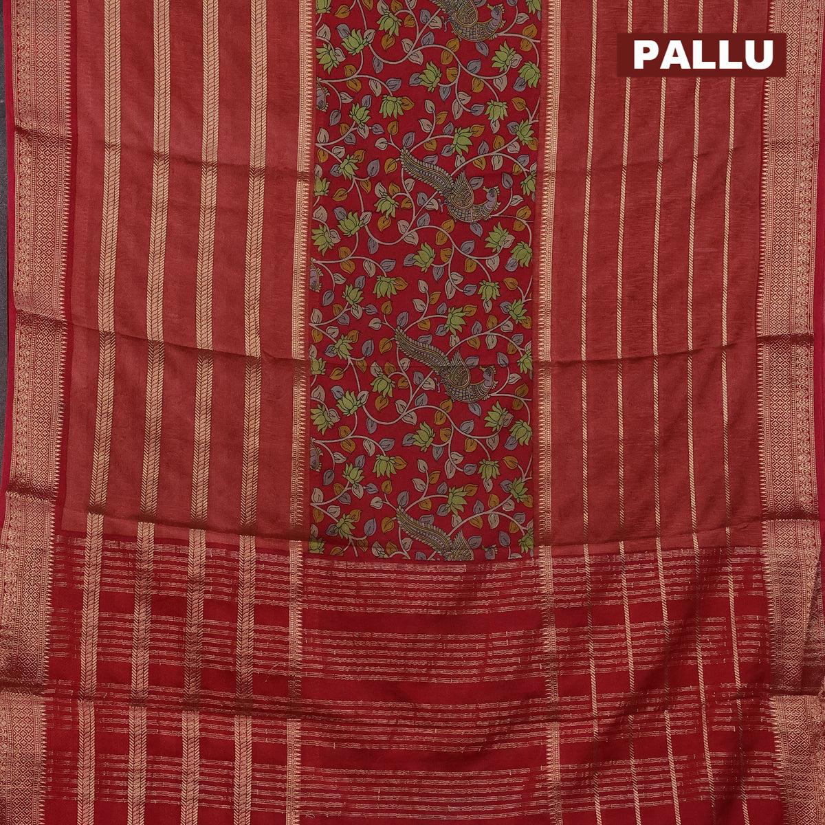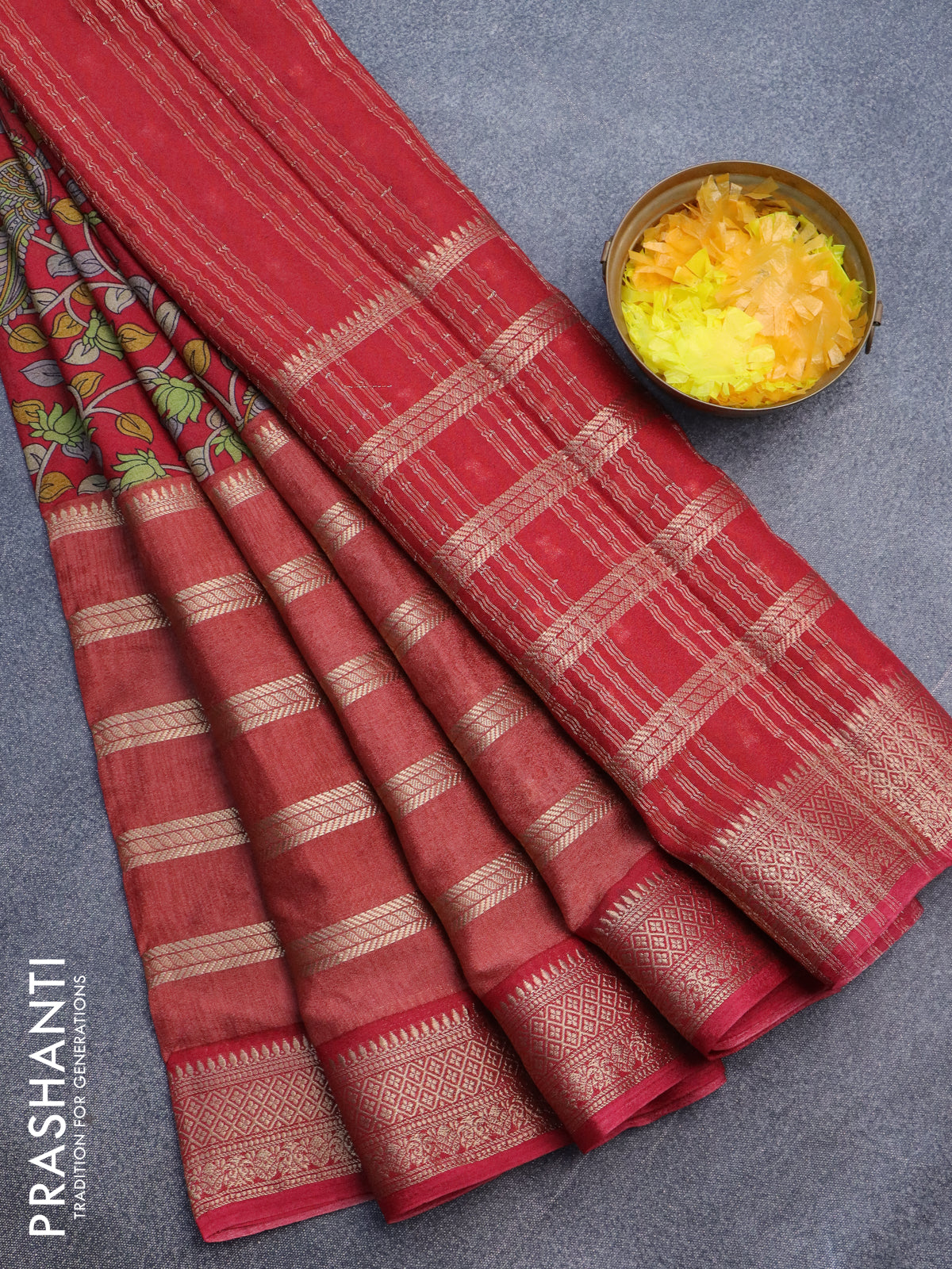 Semi crepe saree red and rust shade with kalamkari prints and long zari woven simple border