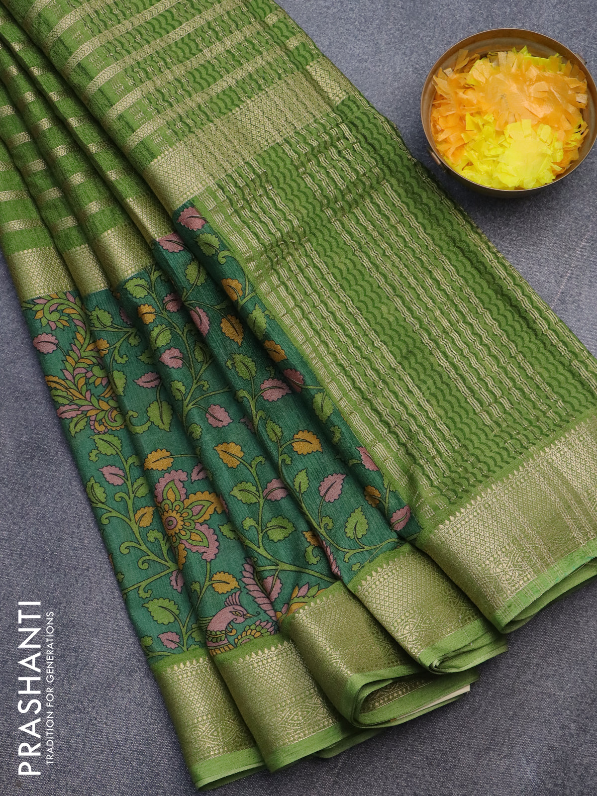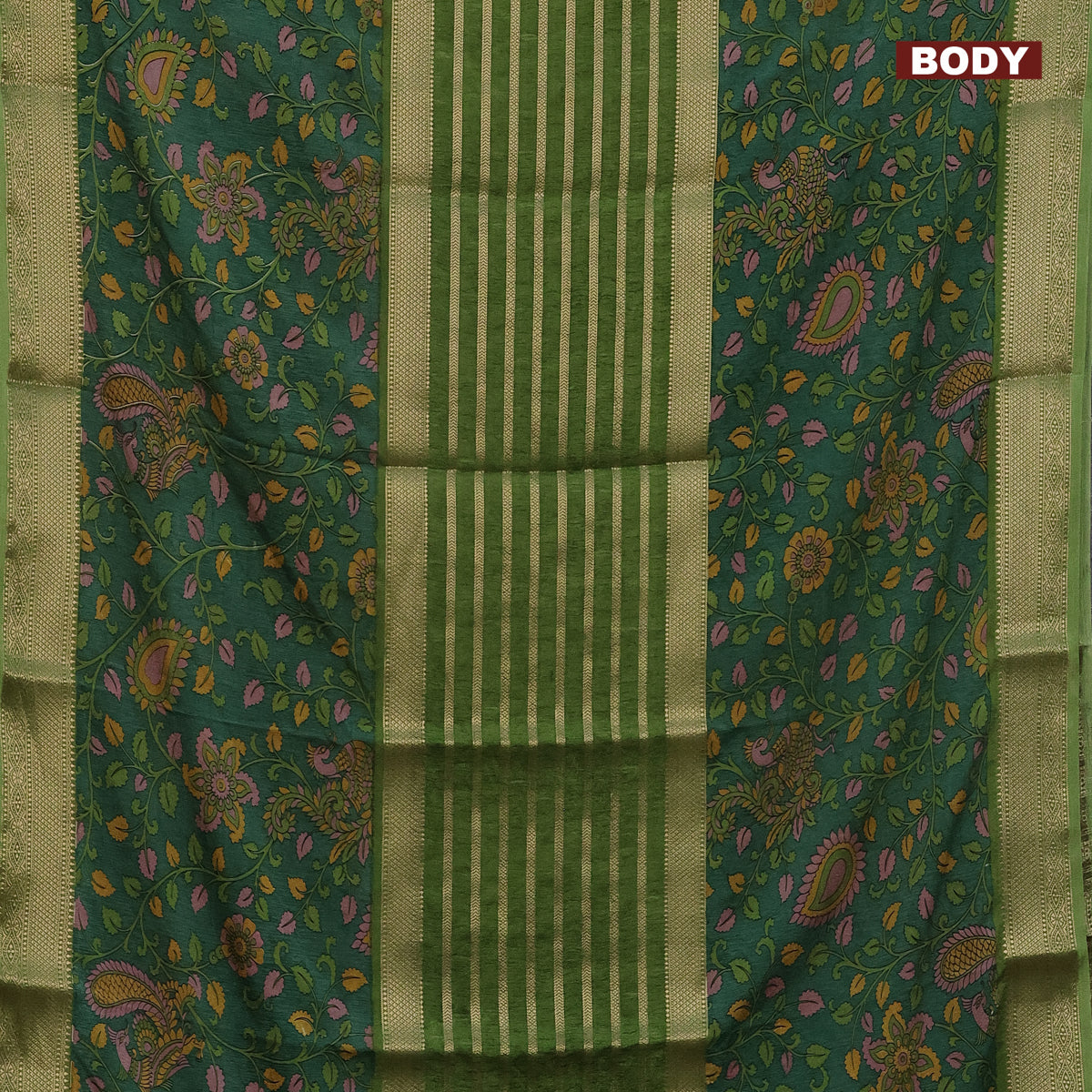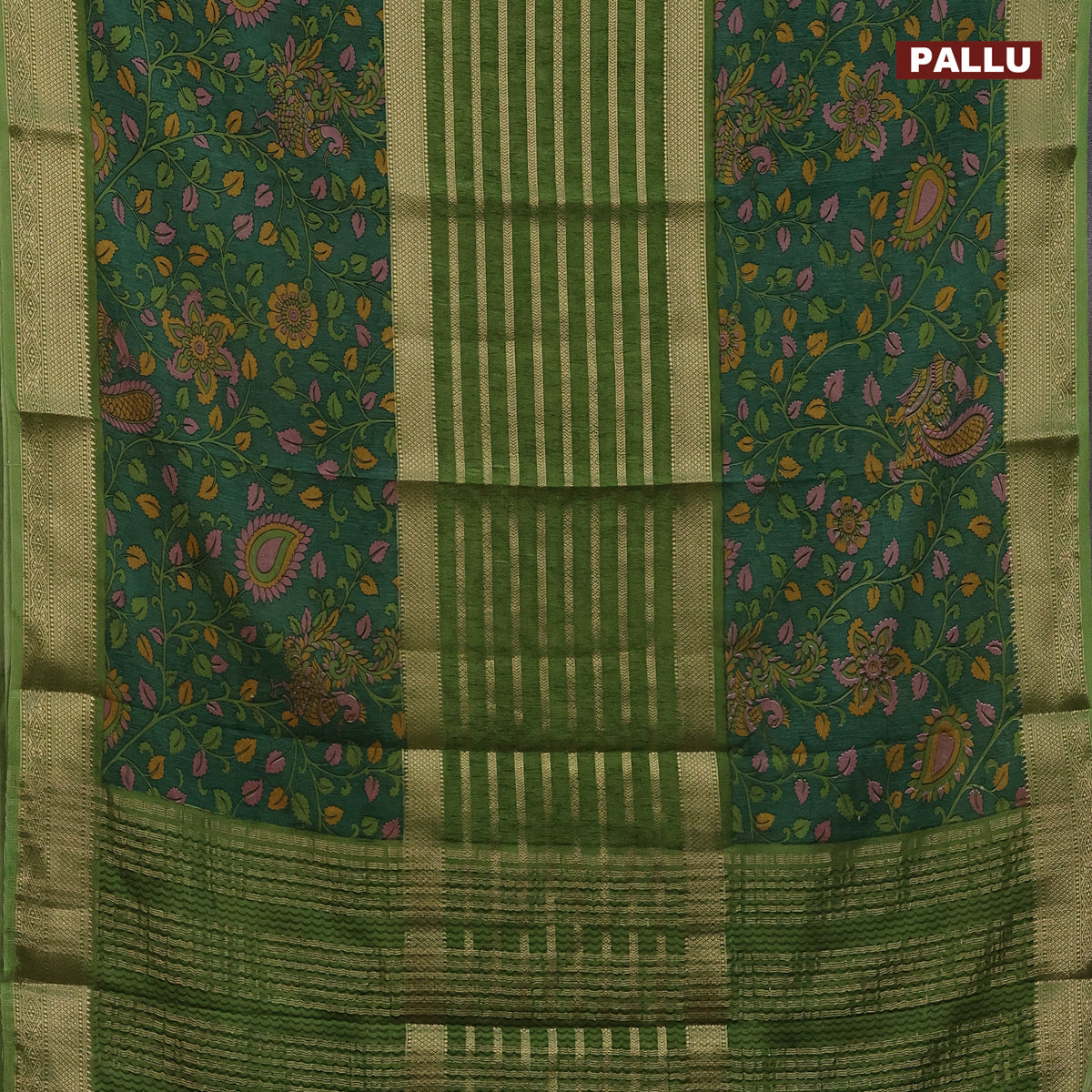 Semi crepe saree sap green and green with zari weaves and long kalamkari printed zari border