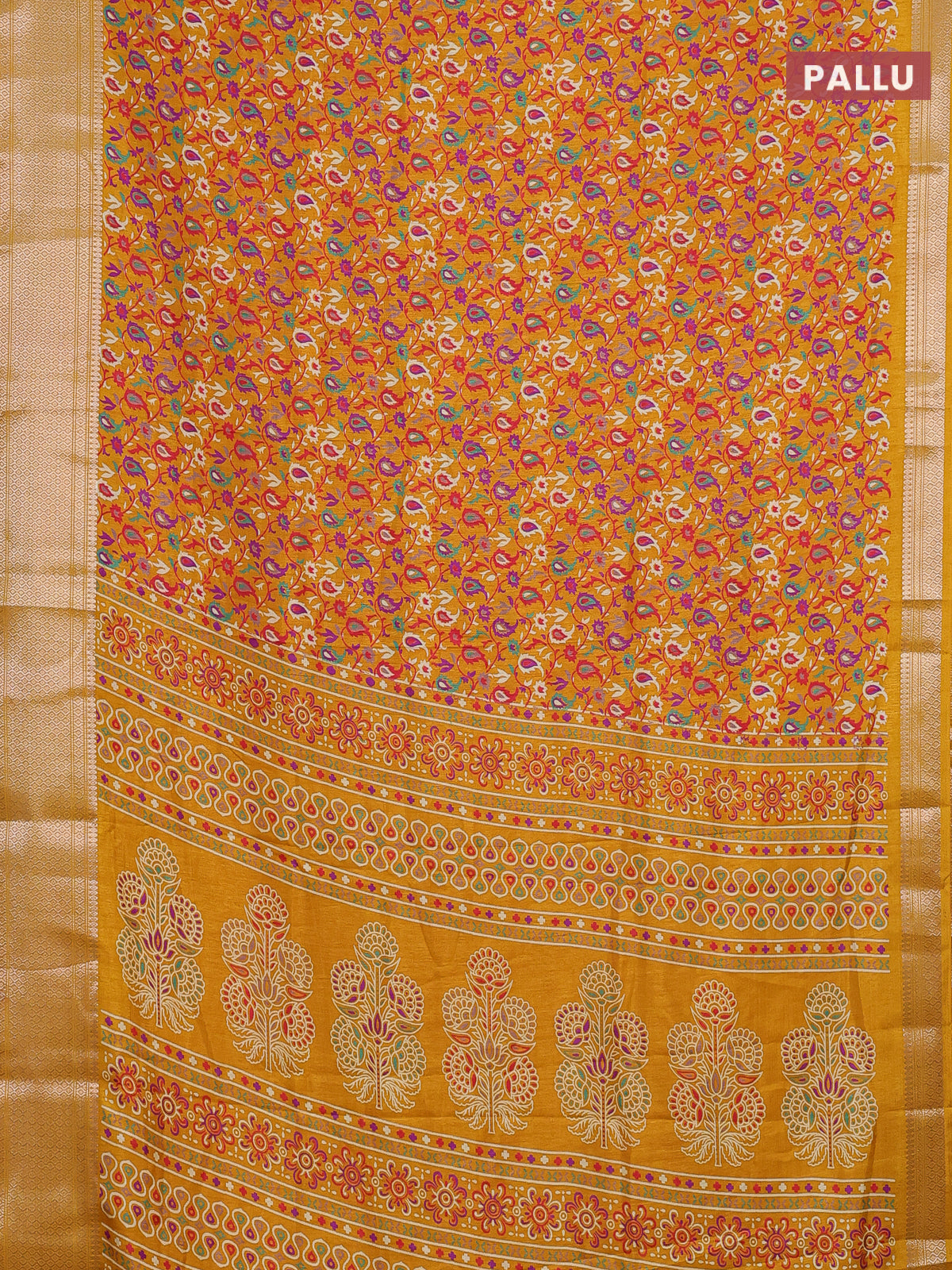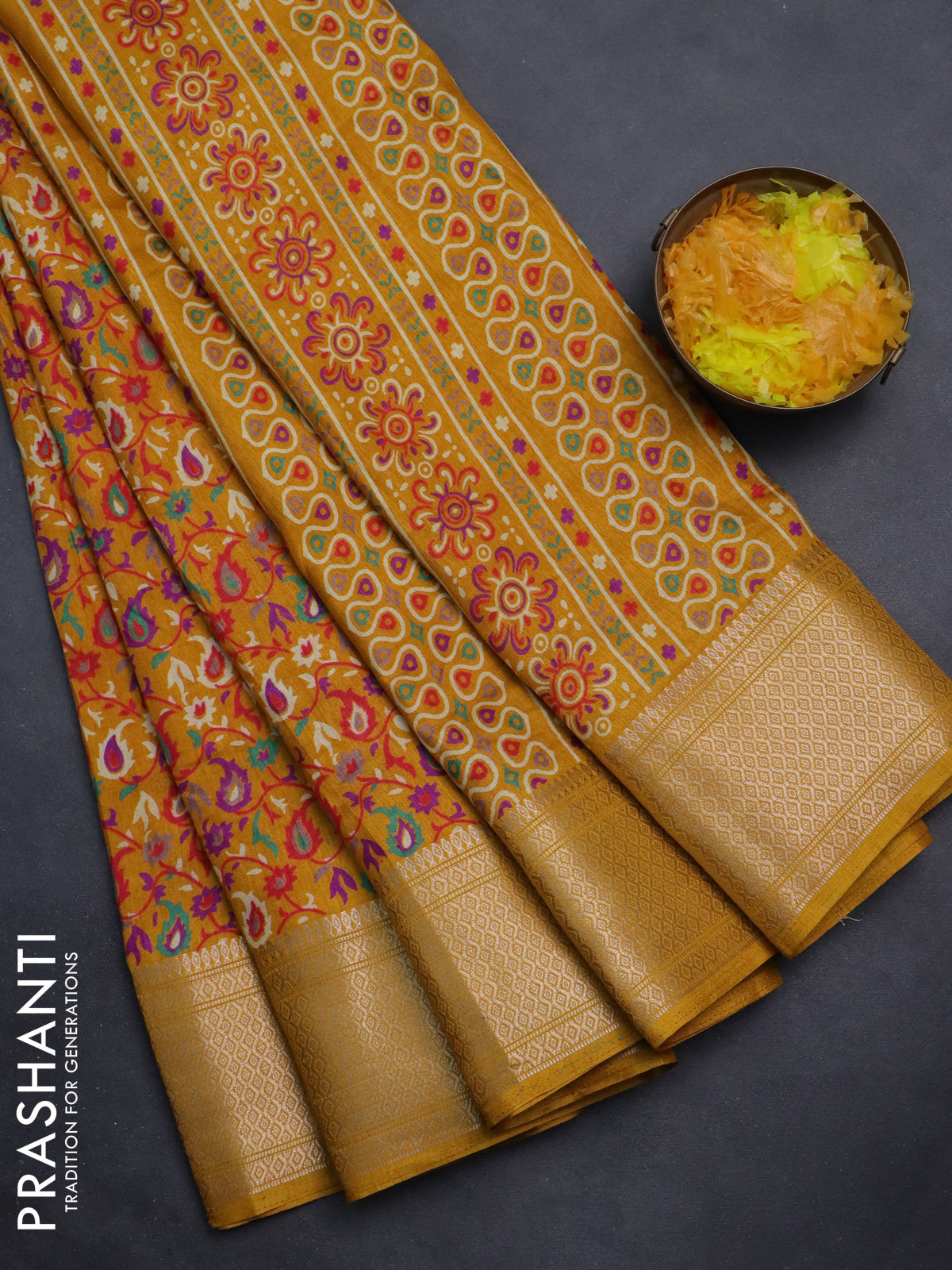 Semi dola saree mustard yellow with allover prints and zari woven border