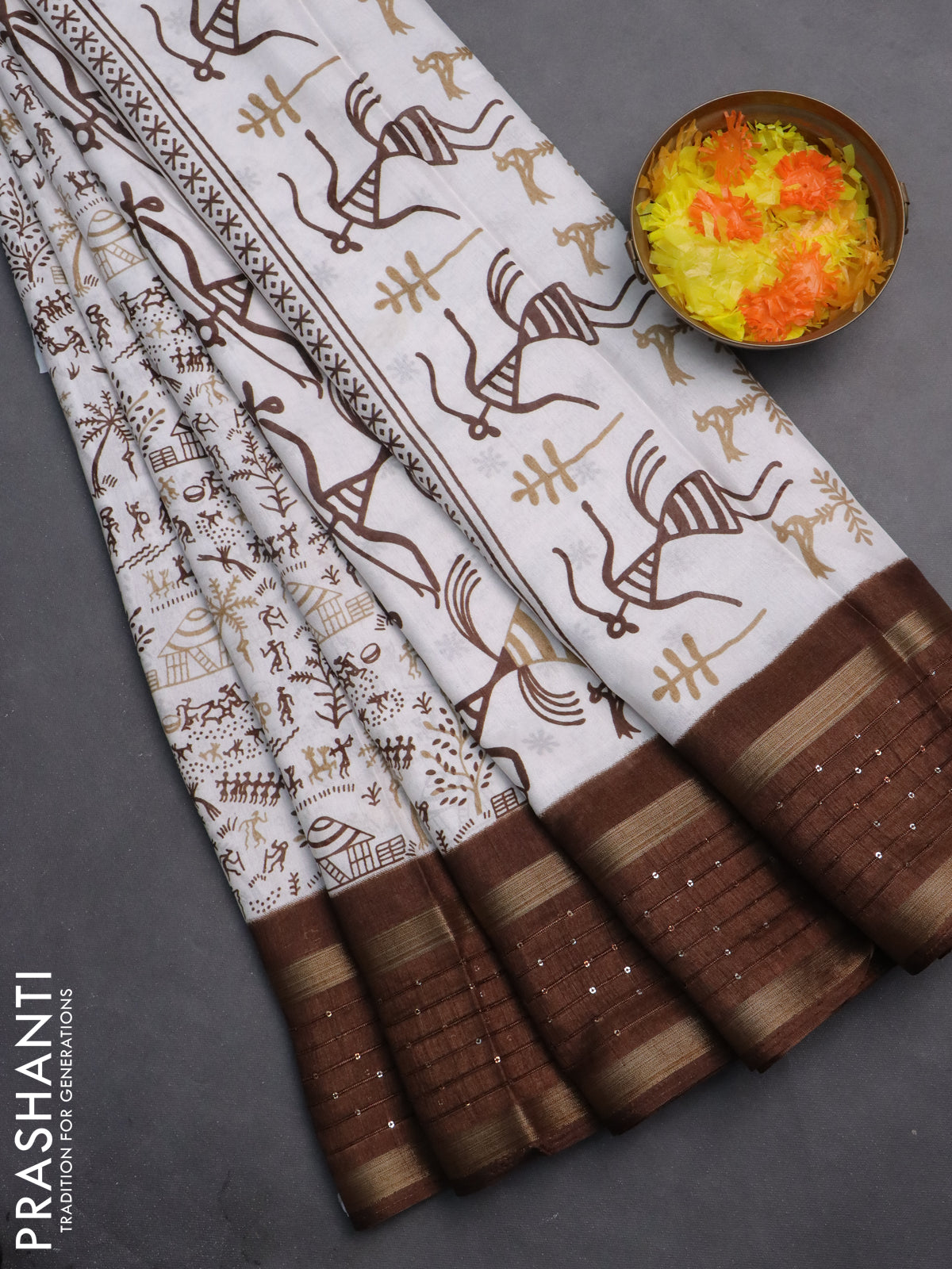 Semi dola saree off white and brown with allover warli prints and zari woven sequin work border