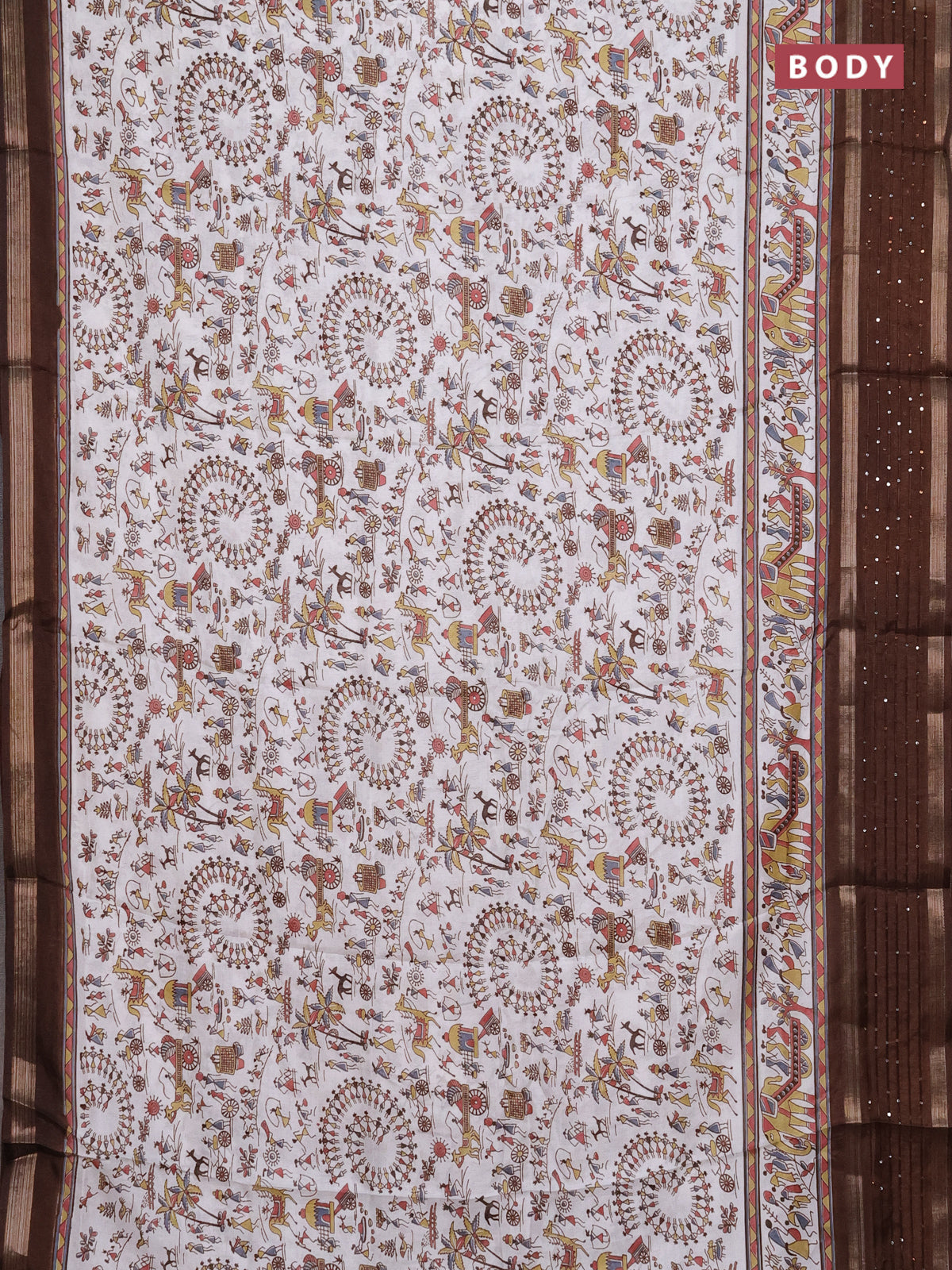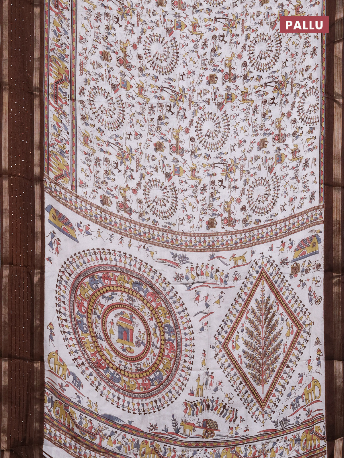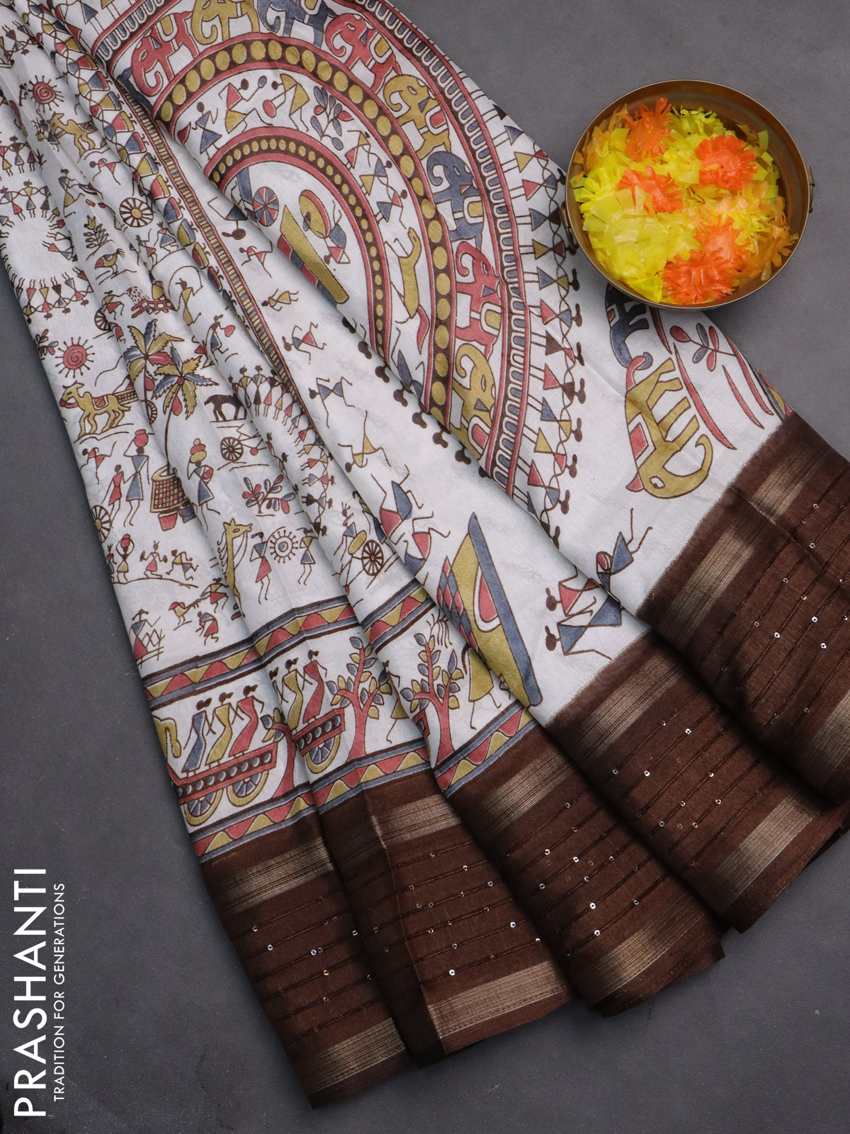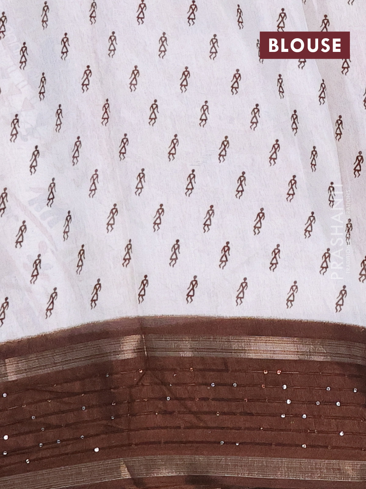 Semi dola saree off white and brown with allover warli prints and zari woven sequin work border