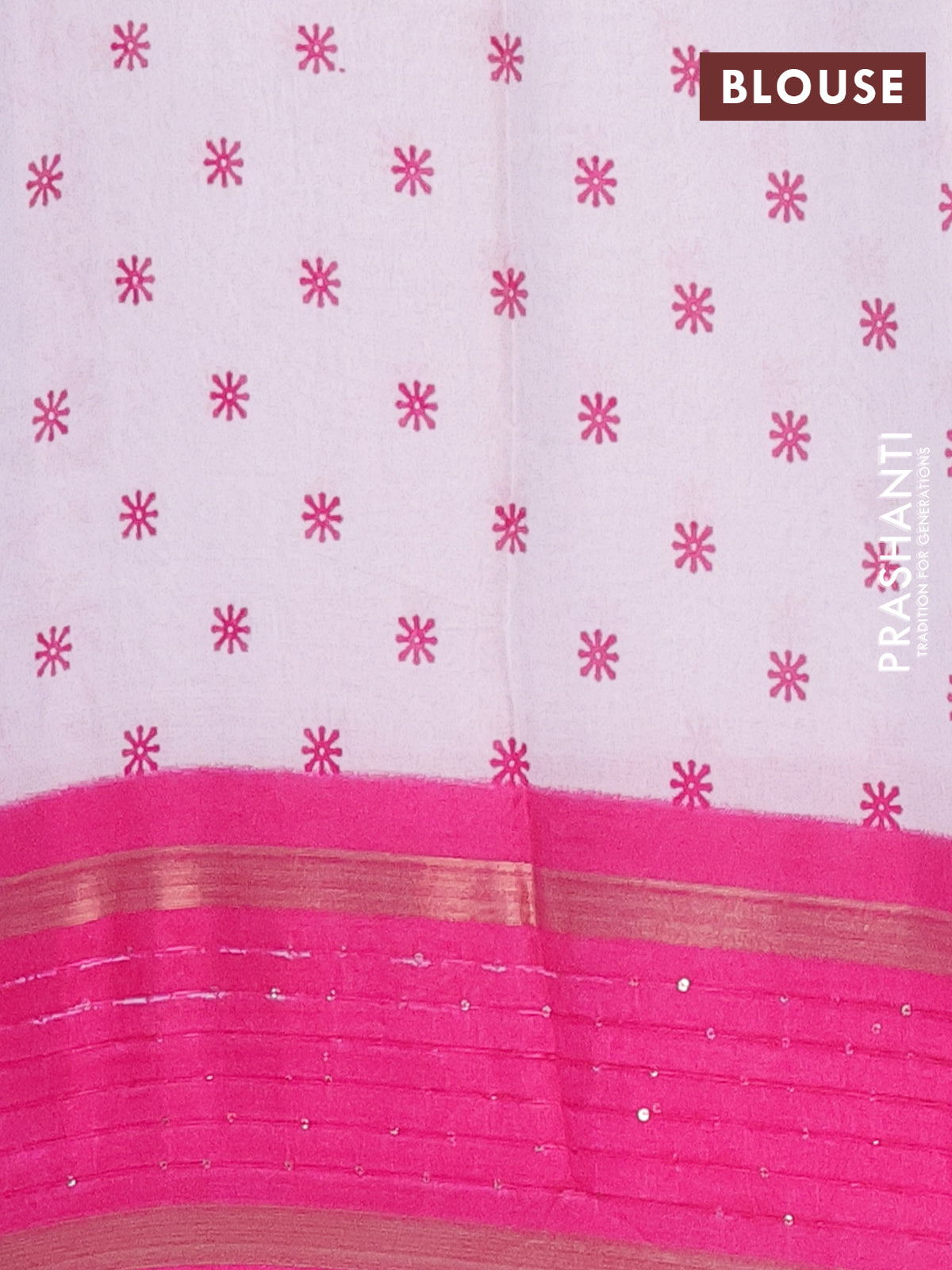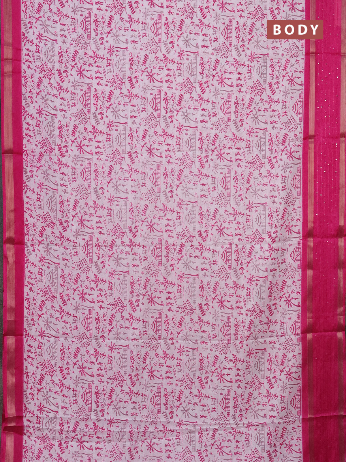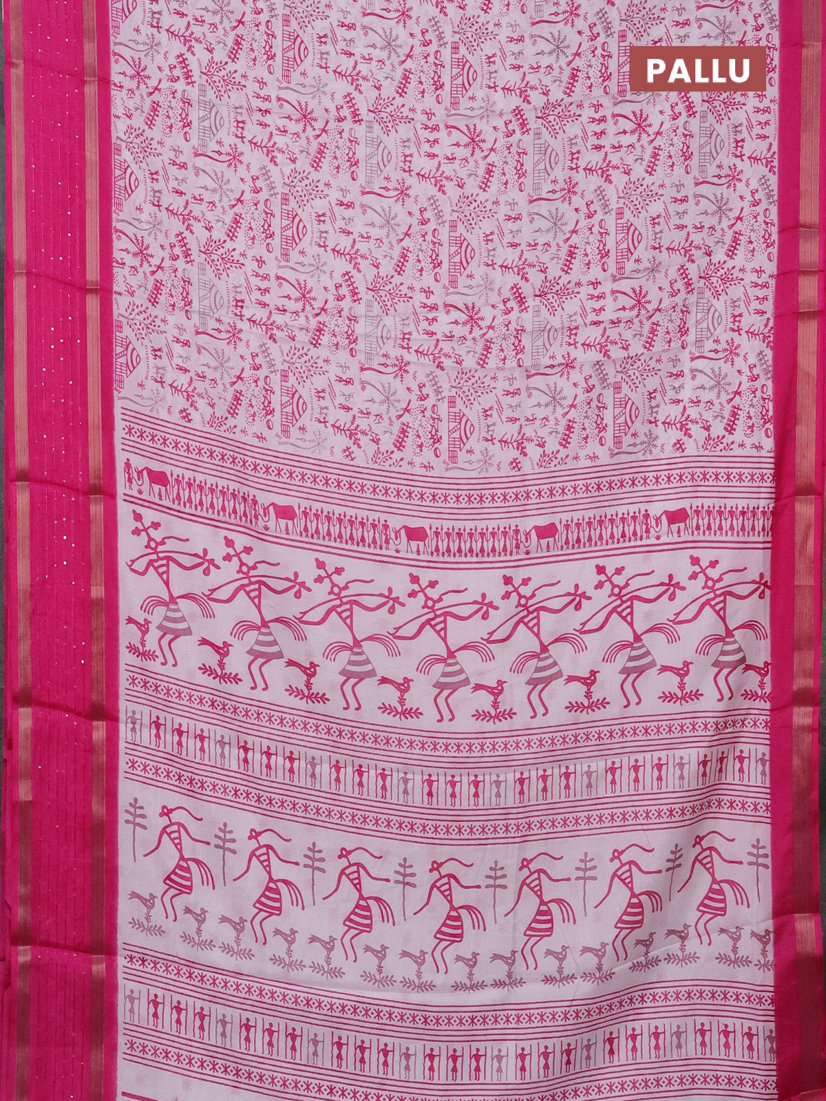 Semi dola saree off white and pink with allover warli prints and zari woven sequin work border