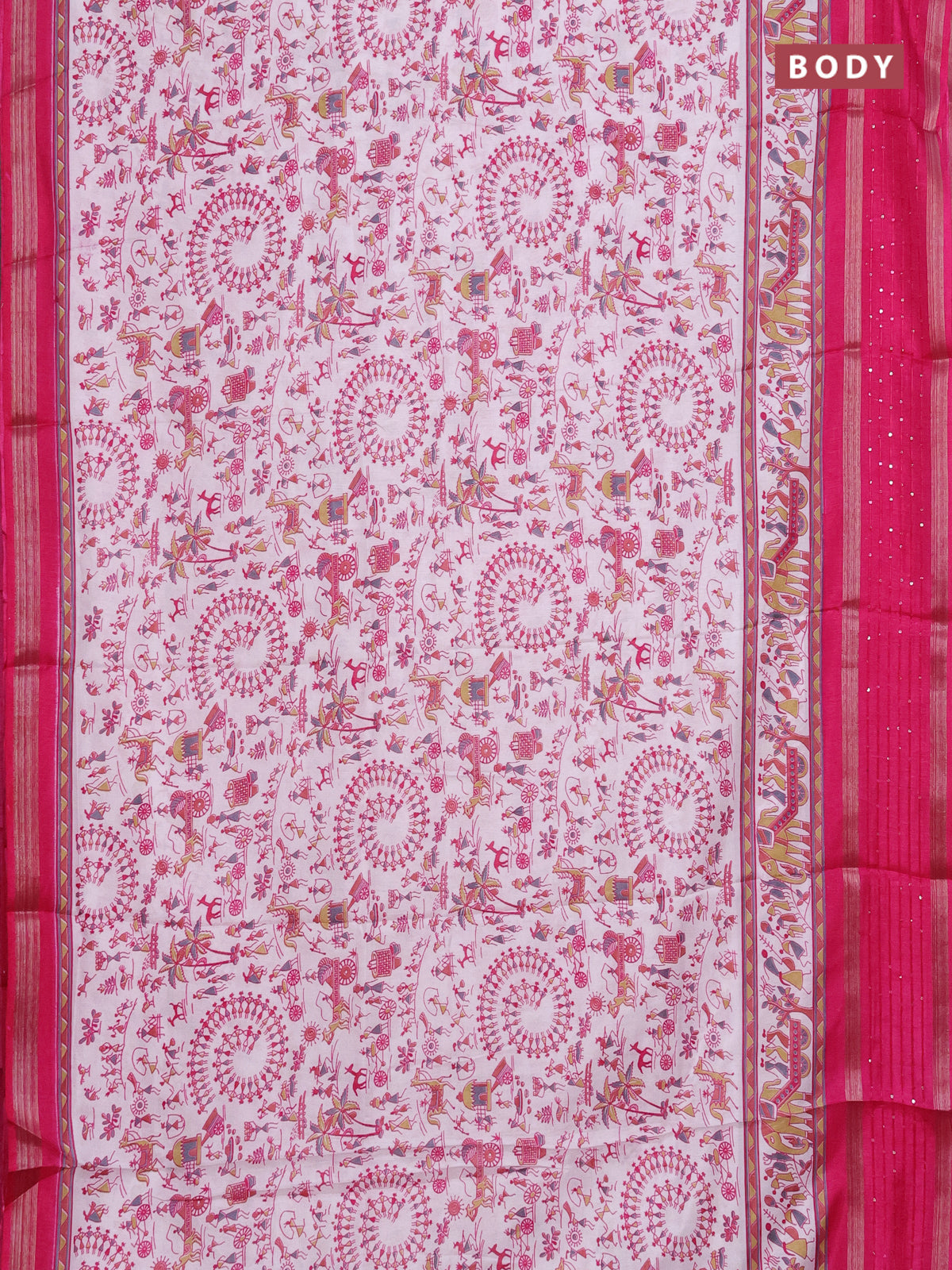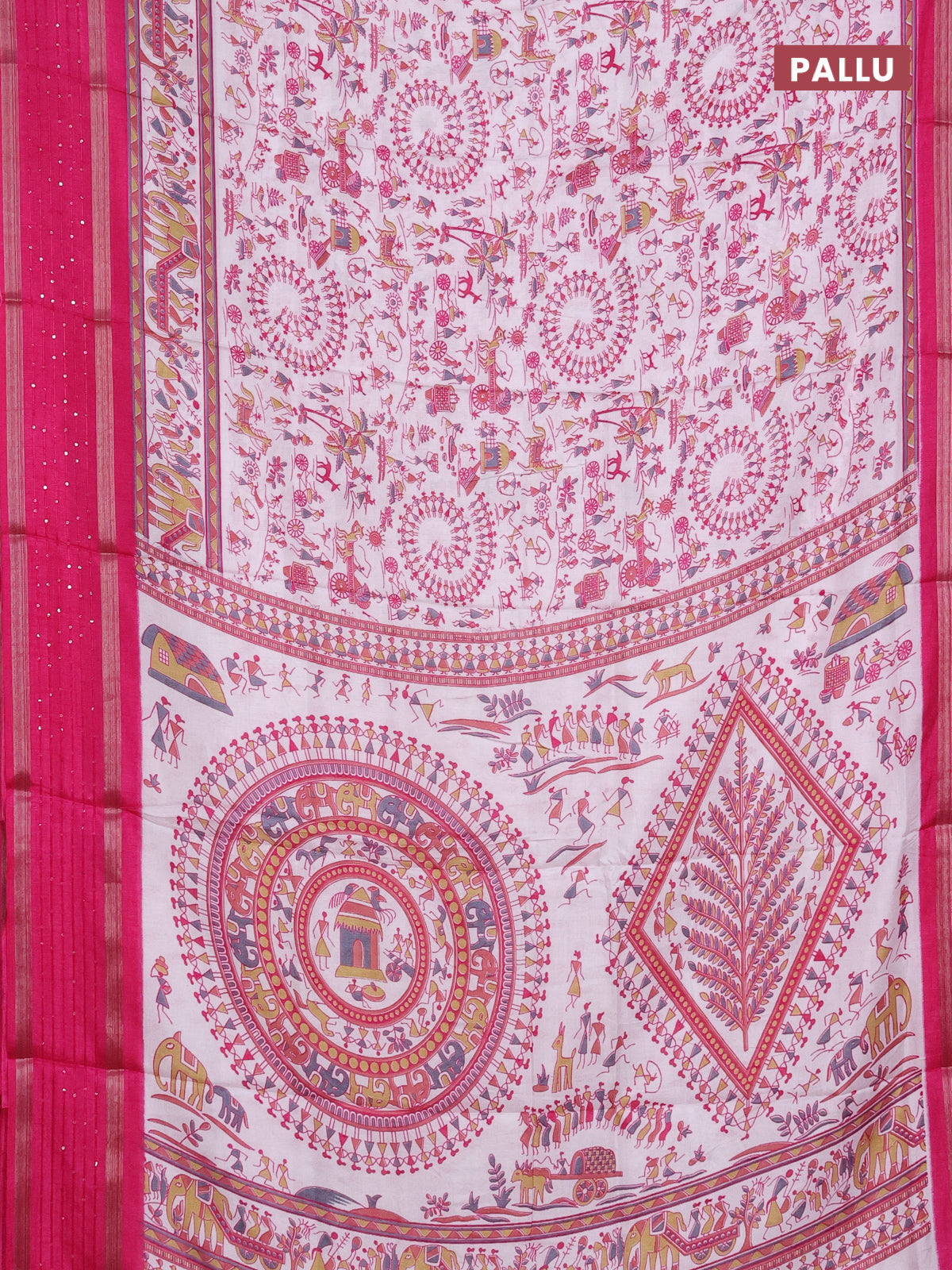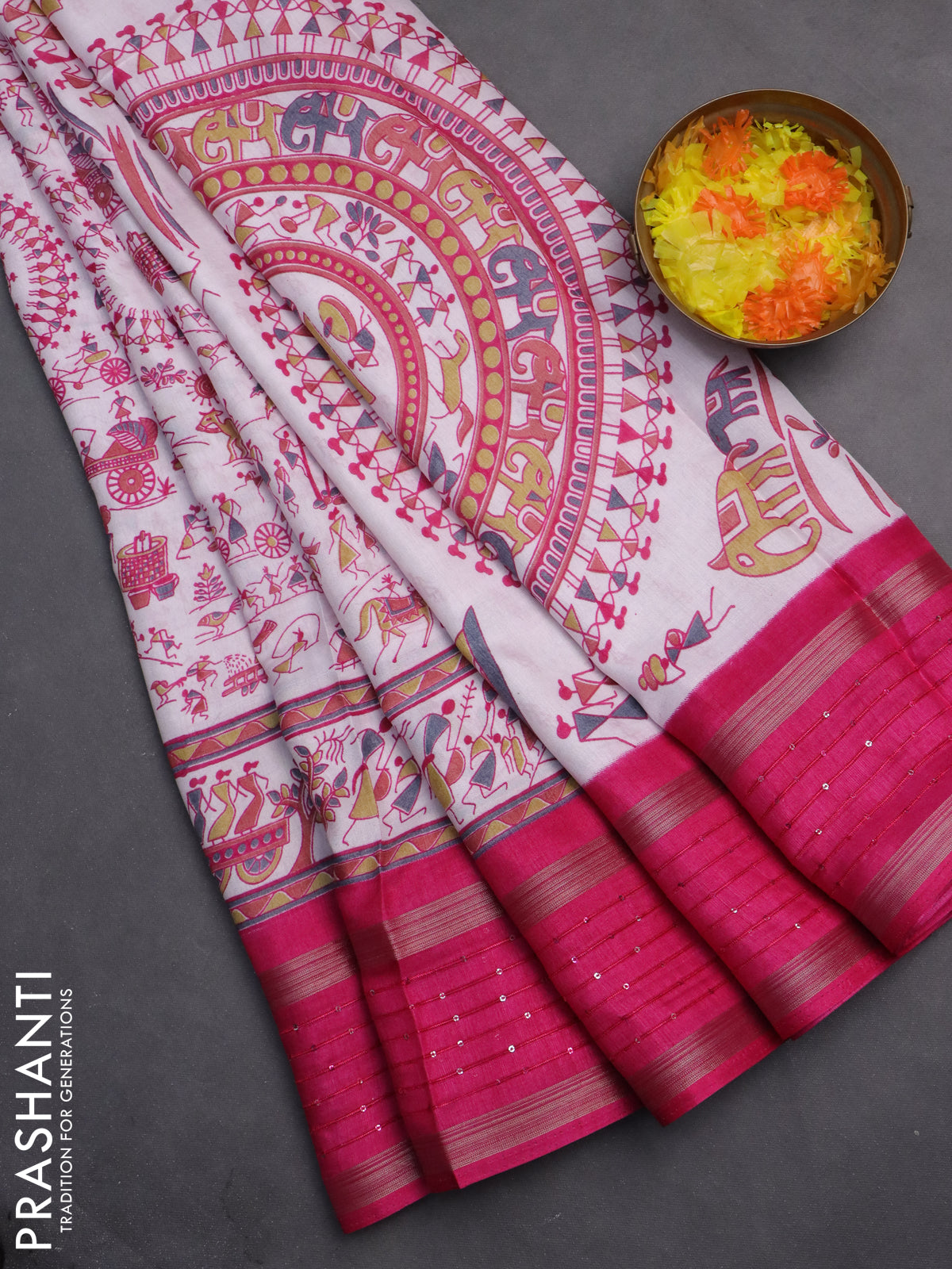 Semi dola saree off white and pink with allover warli prints and zari woven sequin work border