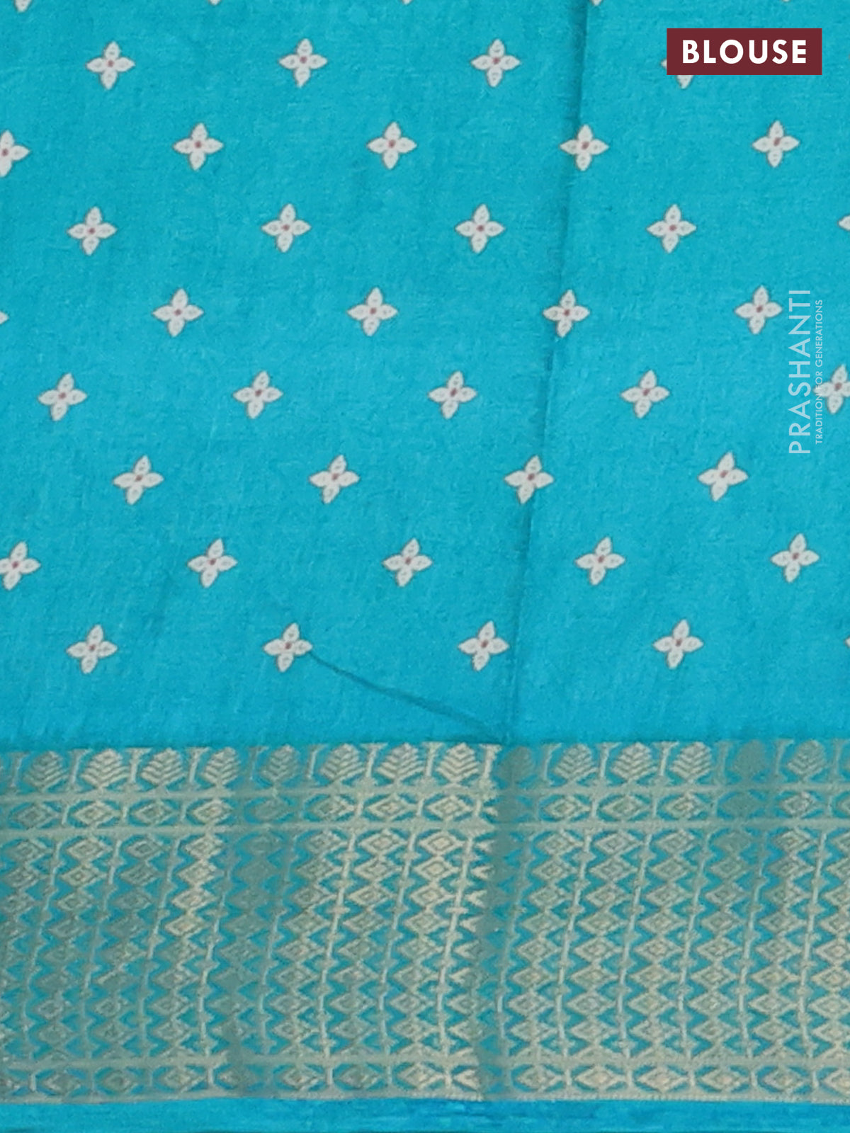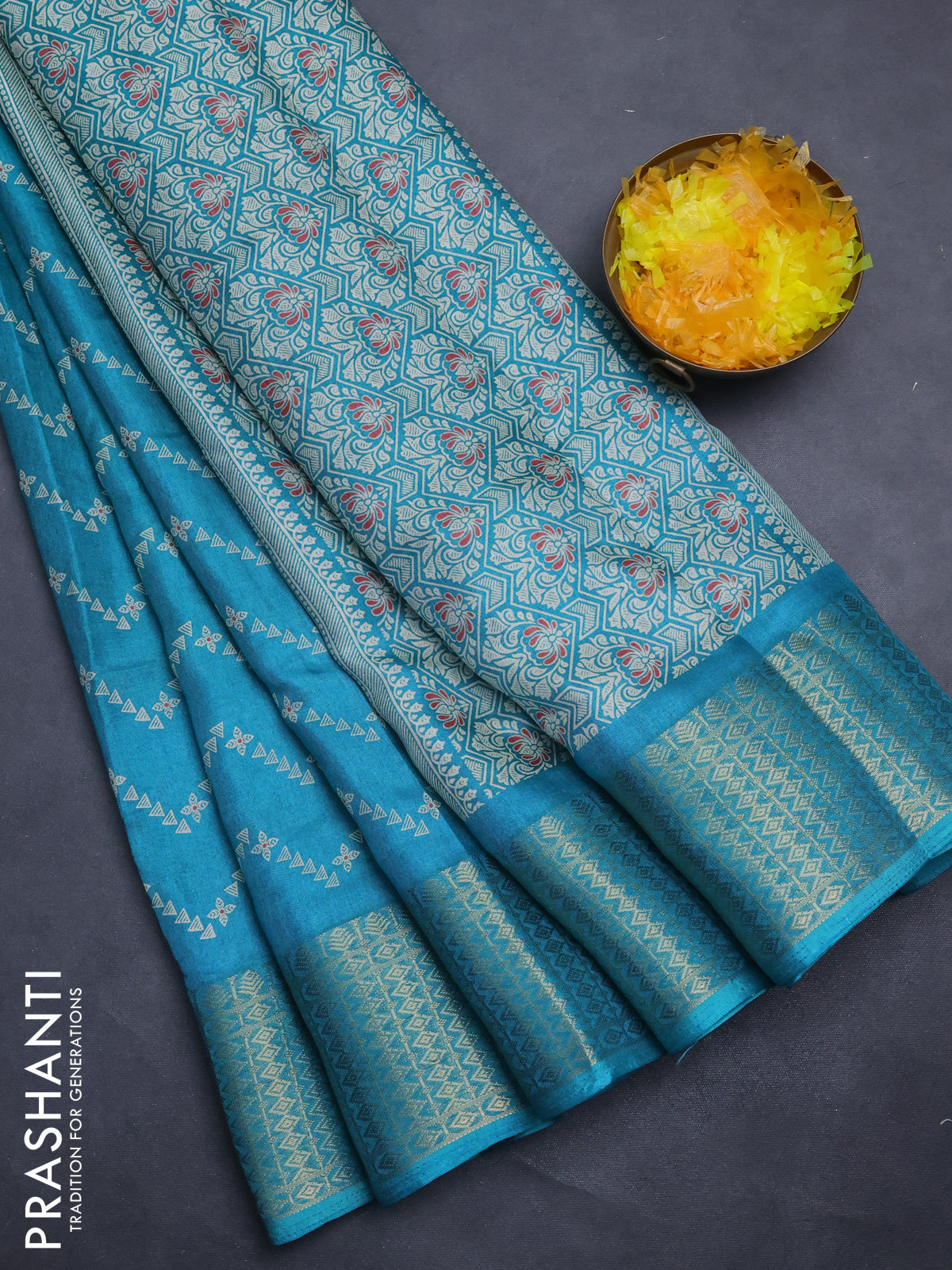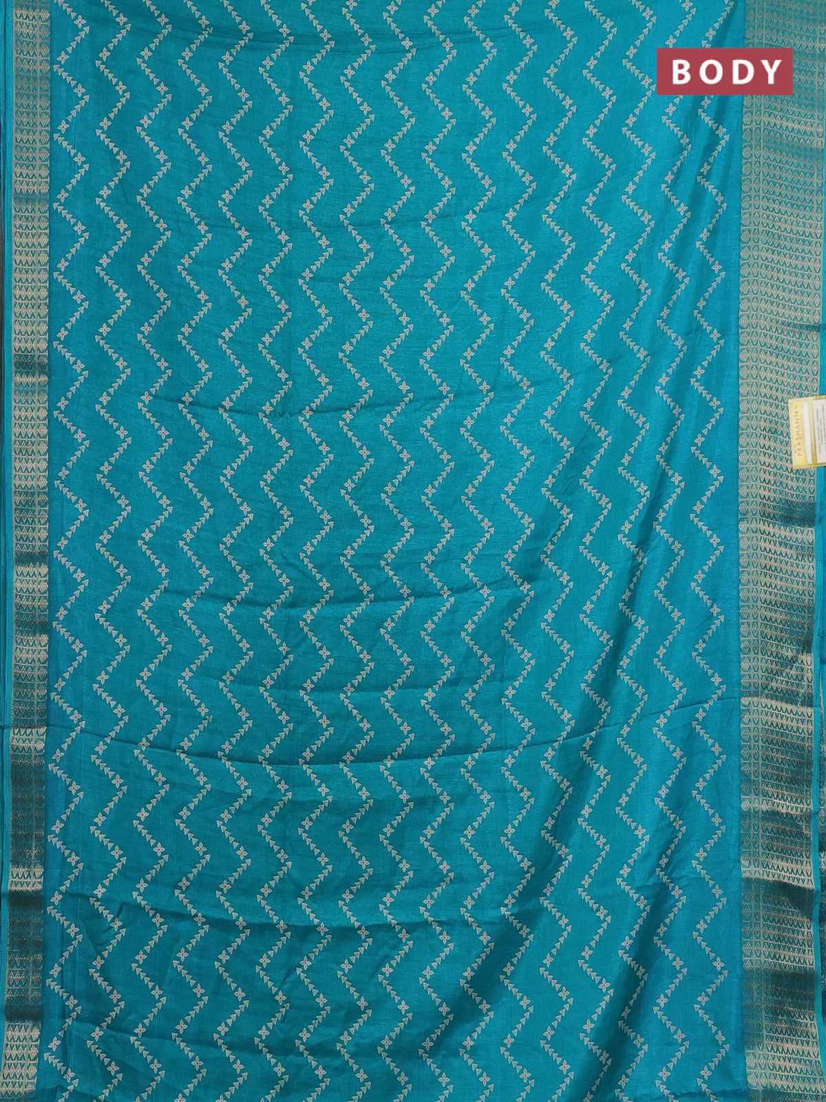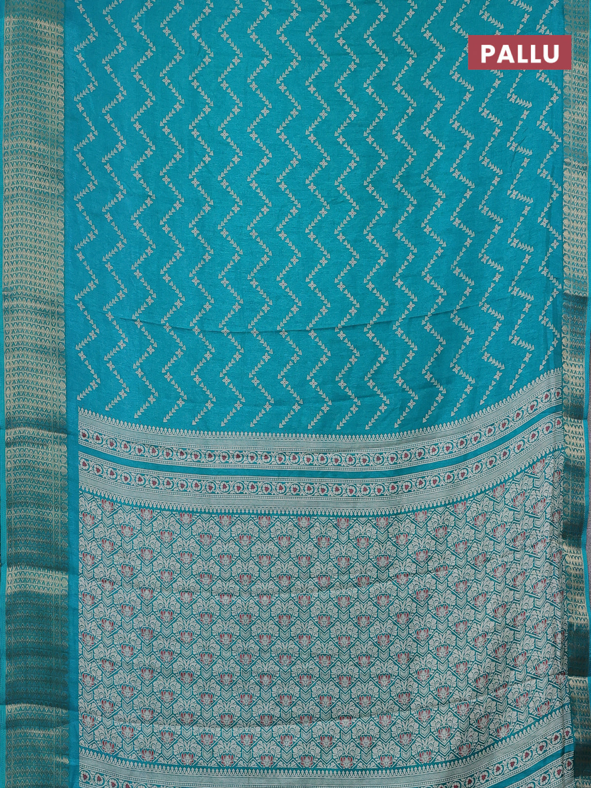 Semi dola saree teal blue with allover zig zag prints and zari woven border