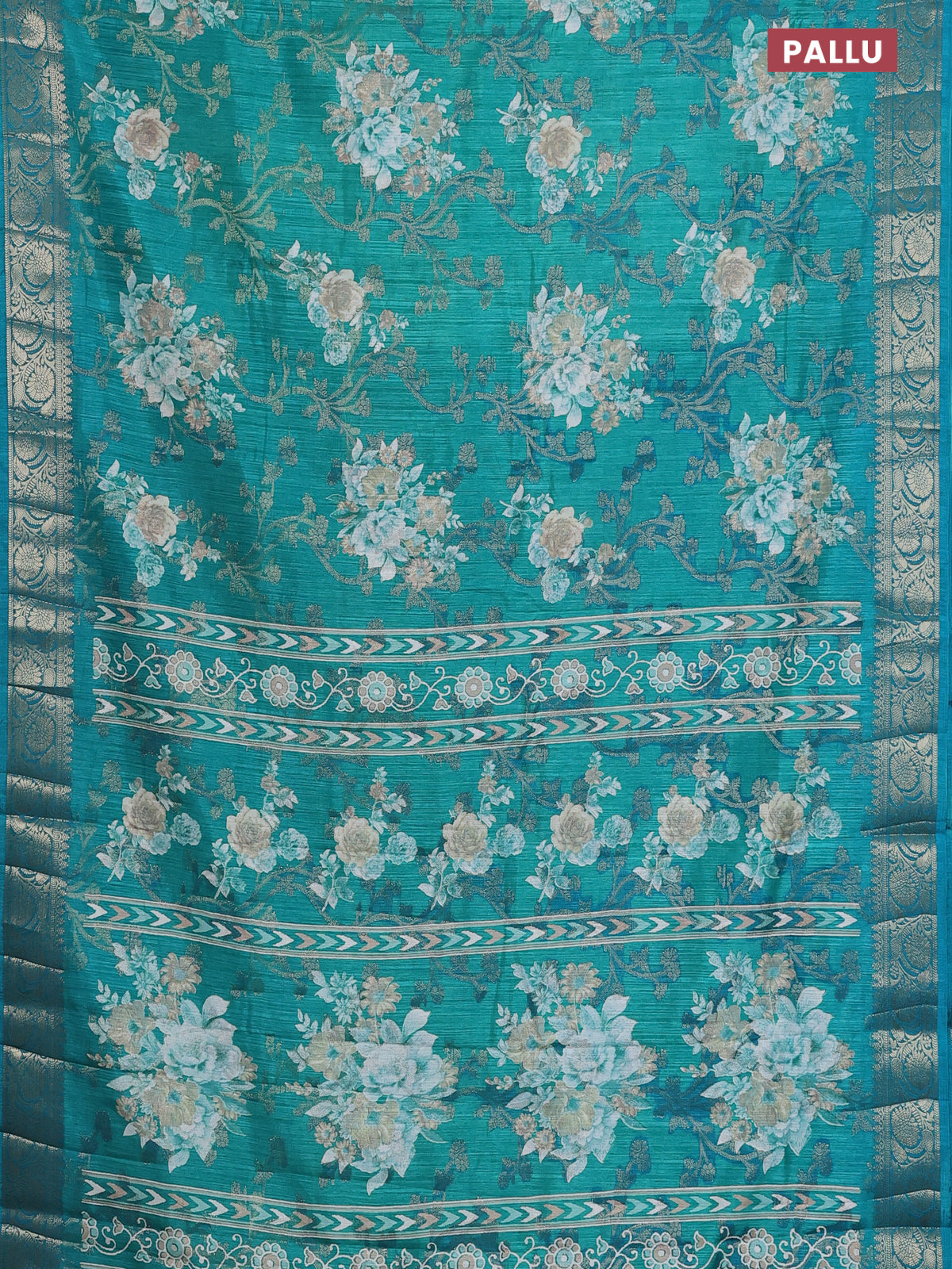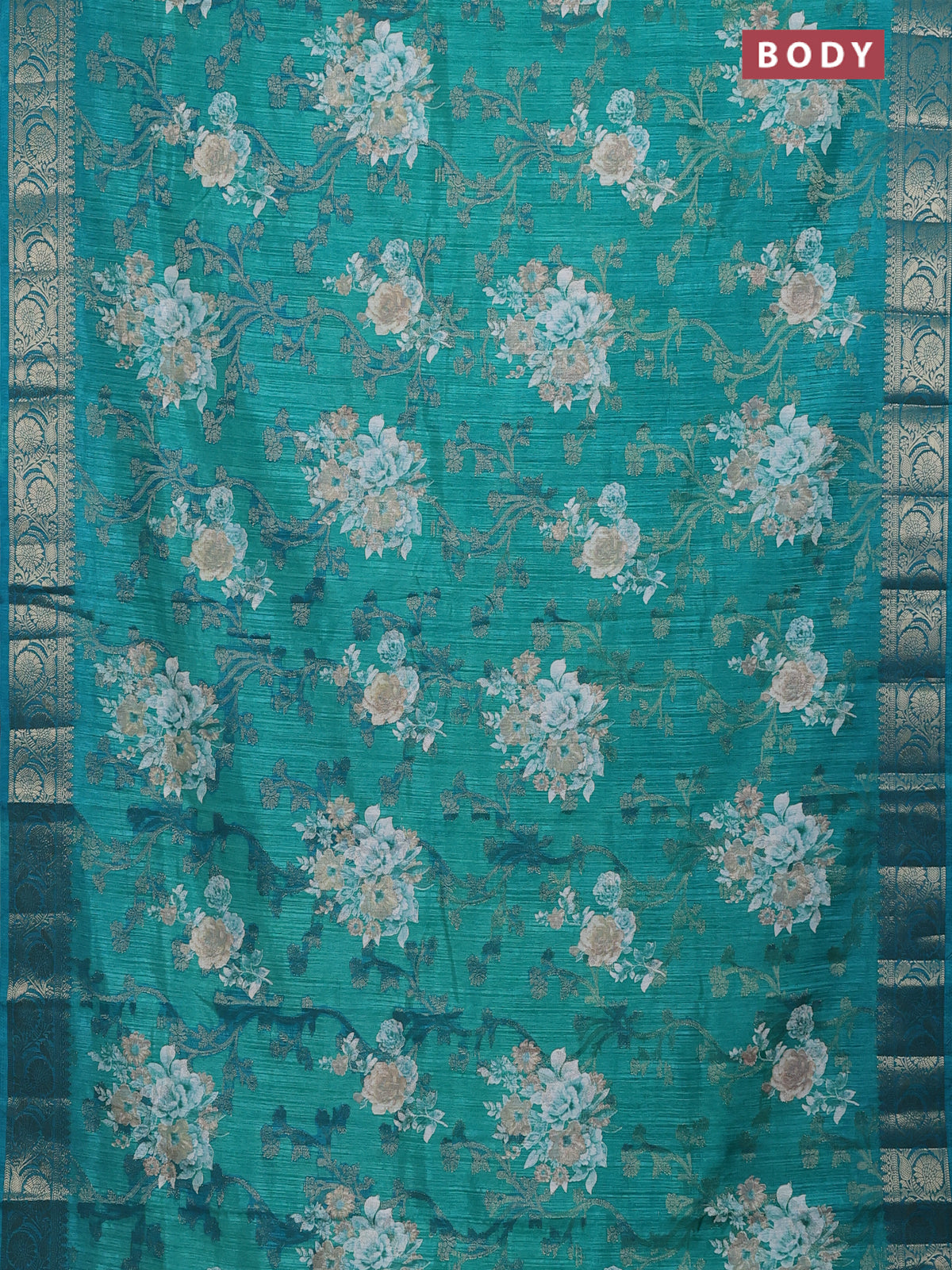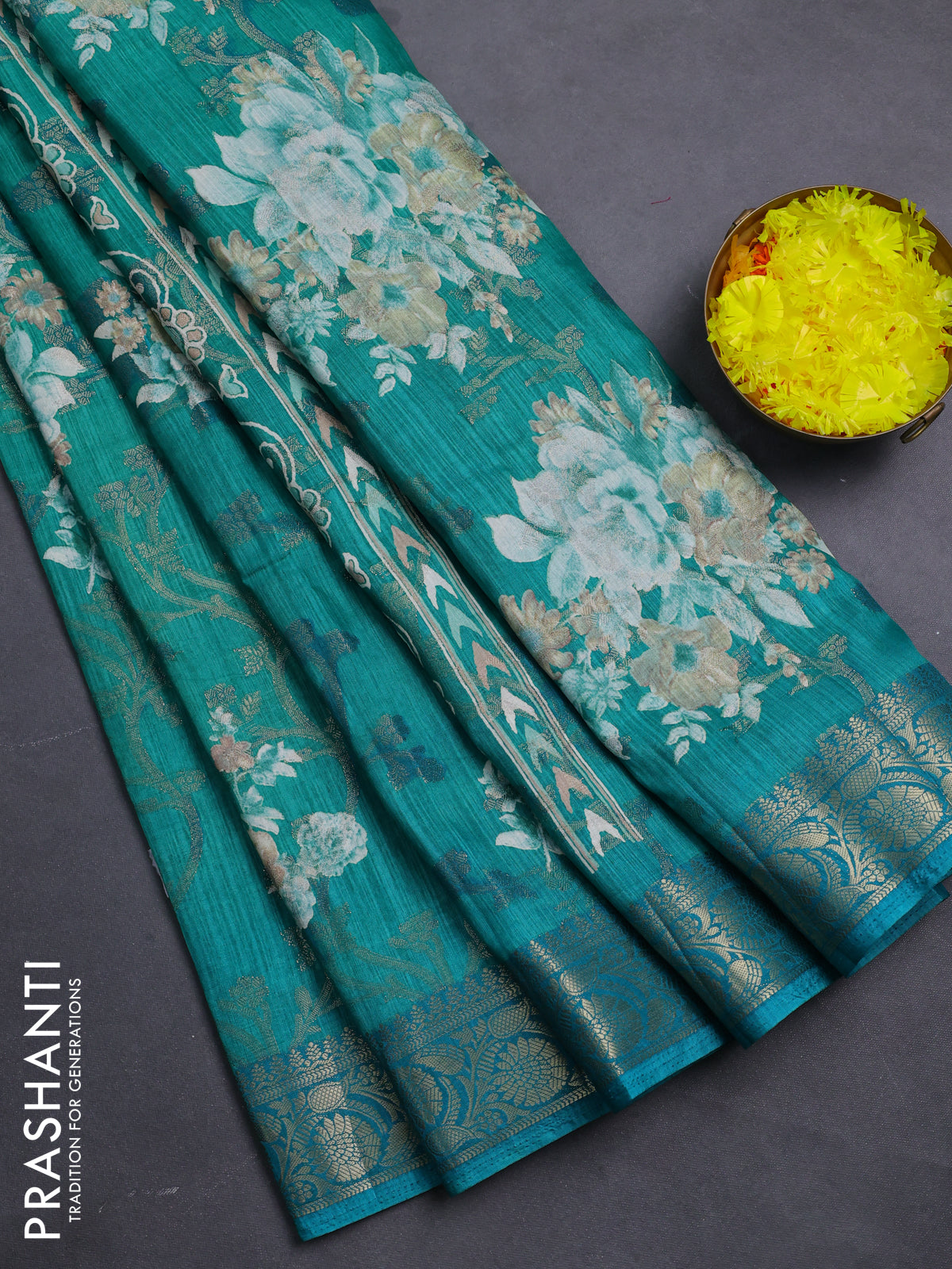 Semi dola saree teal green with floral prints & zari weaves and zari woven border
