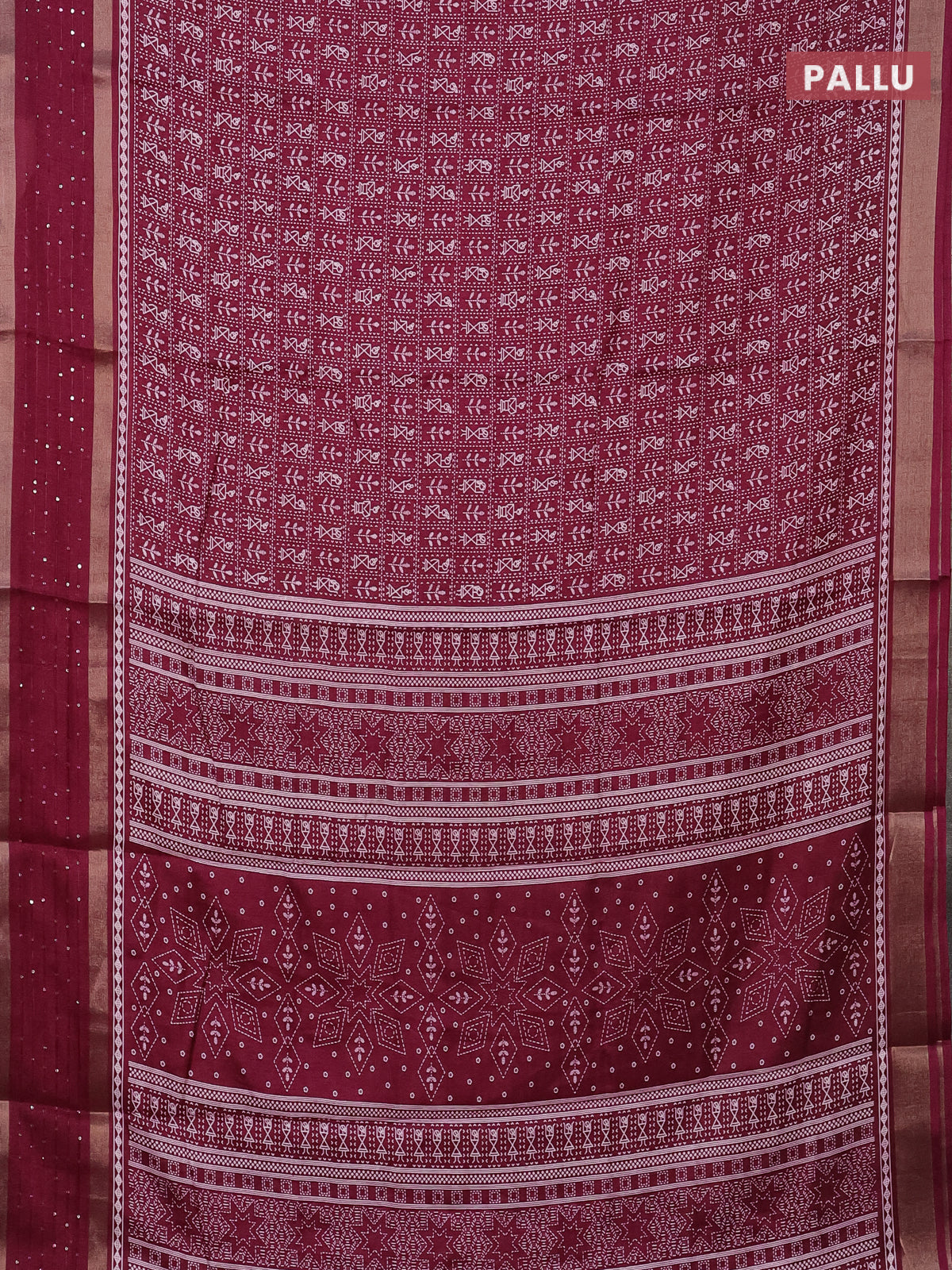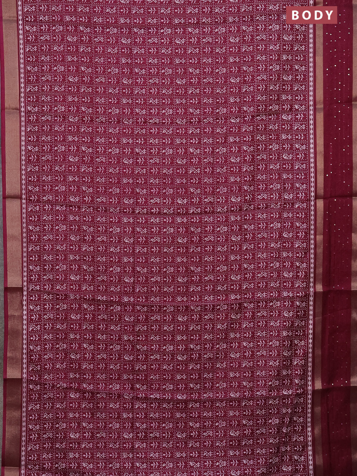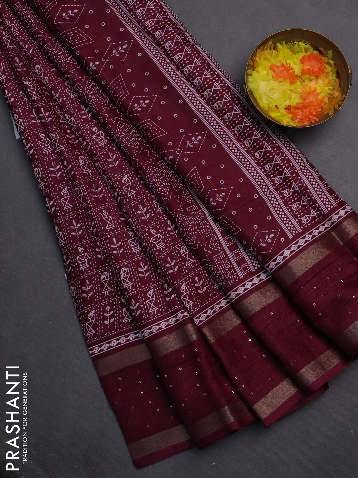 Semi dola saree wine shade with allover warli prints and zari woven sequin work border