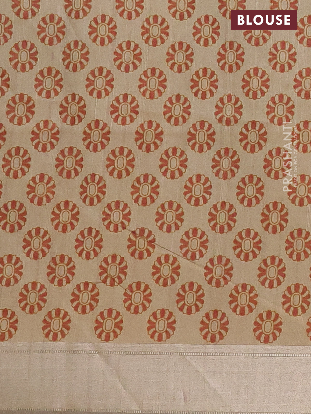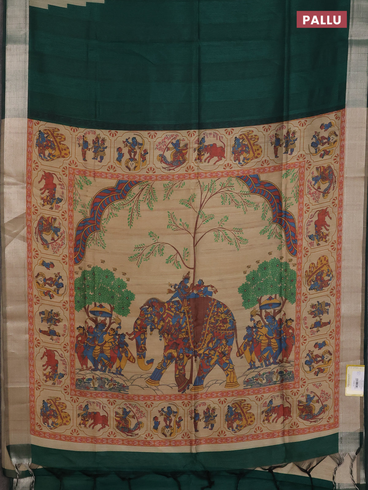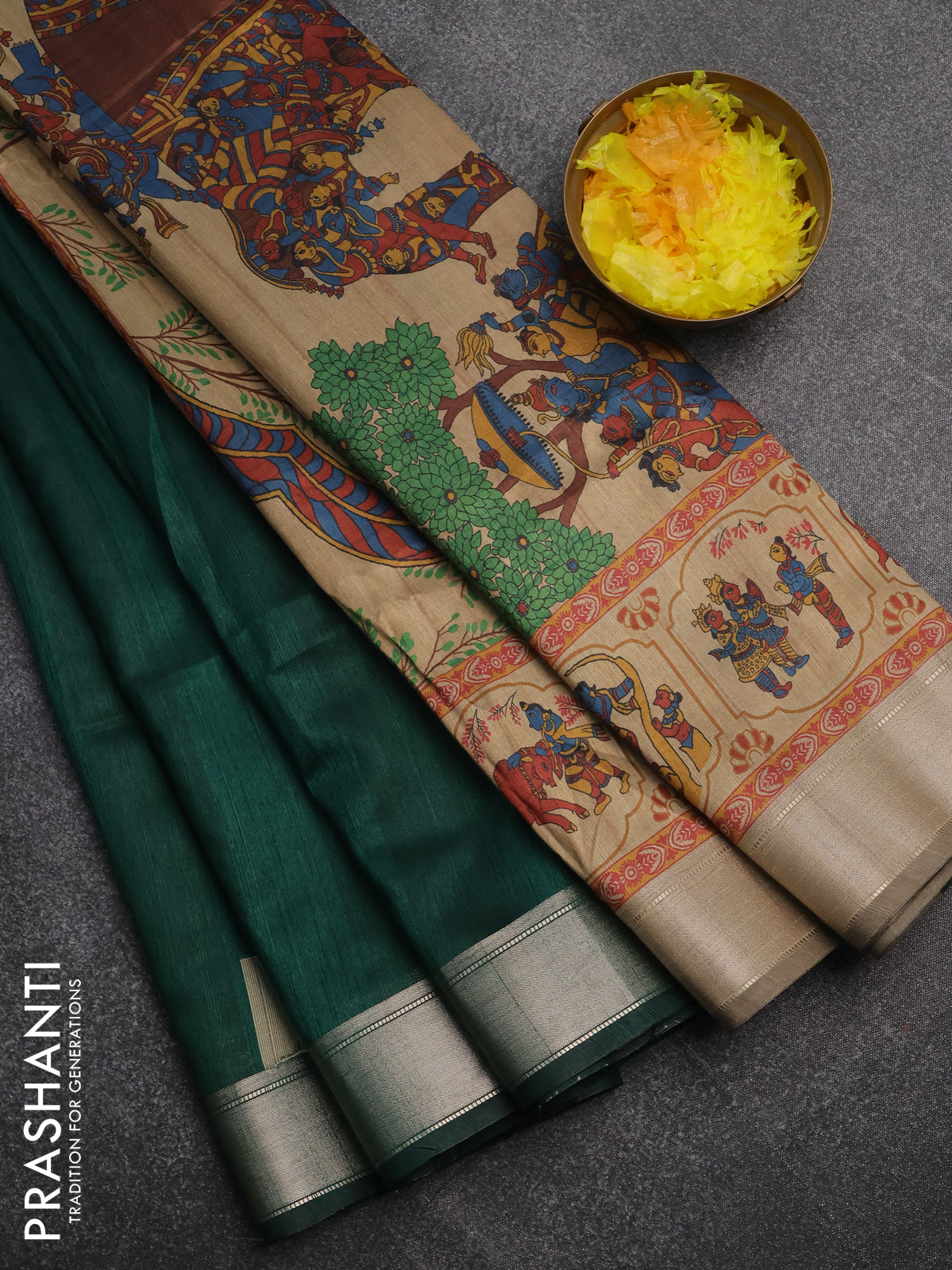 Semi dupion saree dark green and beige with plain body and kalamkari printed pallu