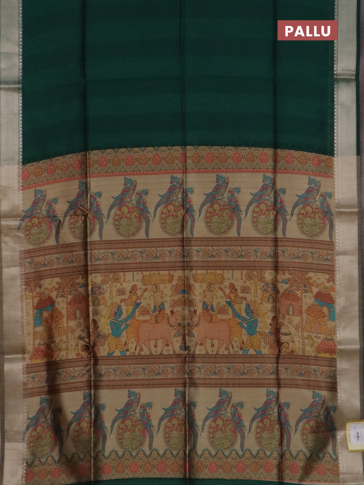 Semi dupion saree green and beige with plain body and kalamkari printed pallu
