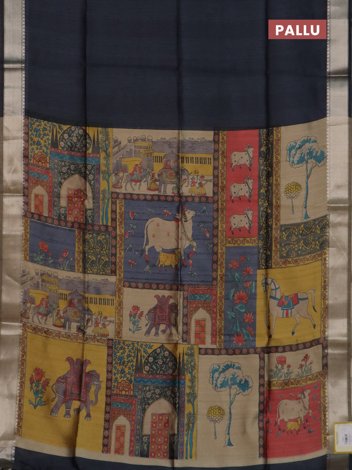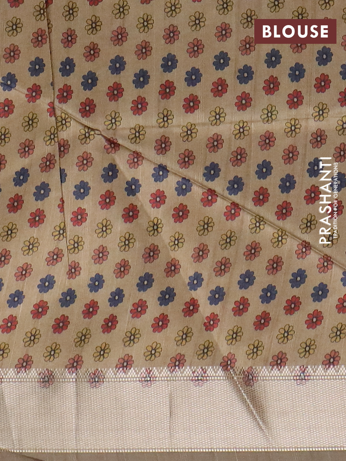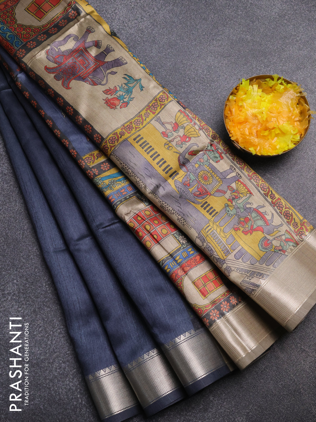 Semi dupion saree grey and beige with plain body and kalamkari printed pallu
