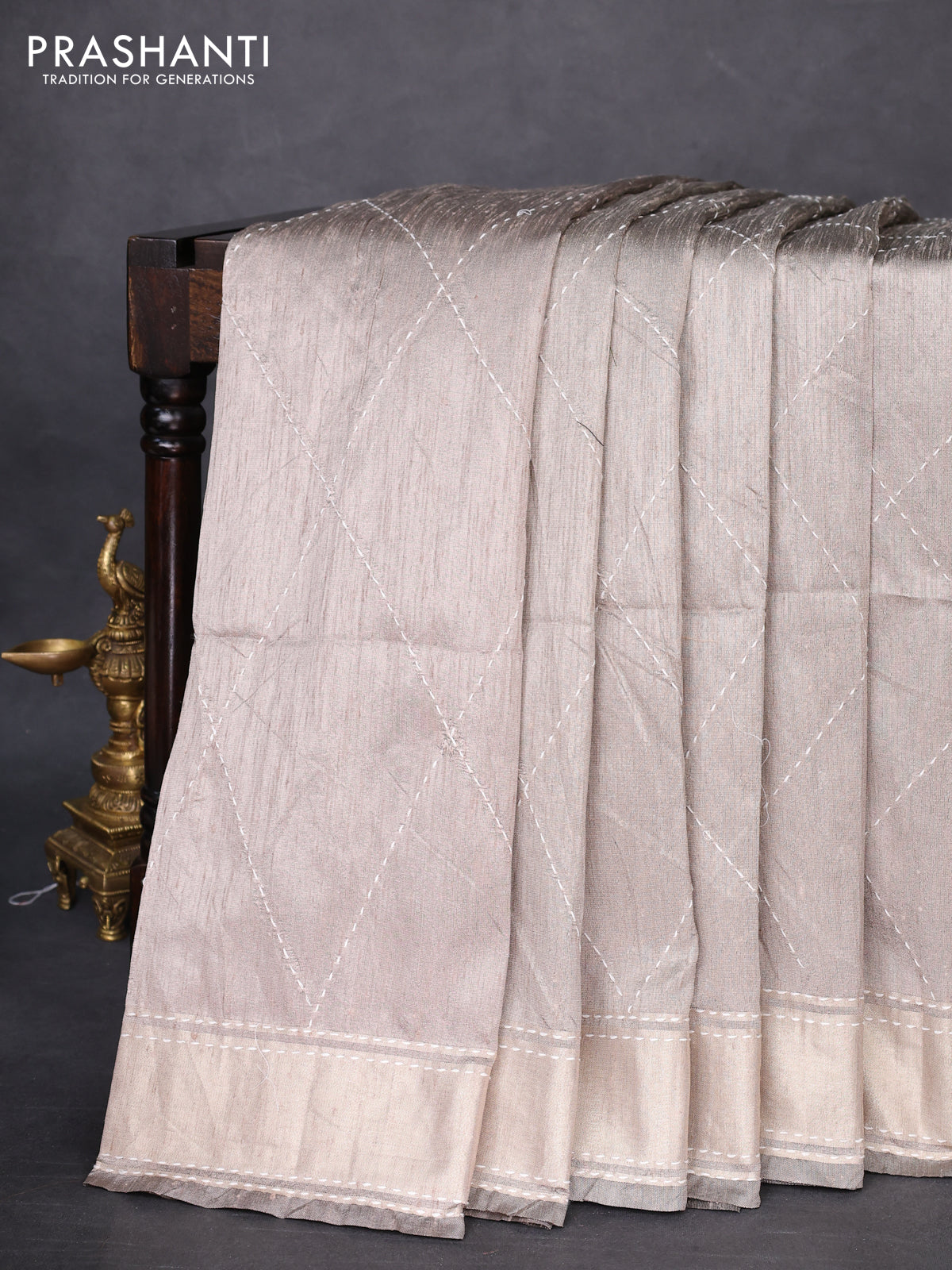 Semi dupion saree pastel grey and multi colour with allover kantha stitch work and zari woven border