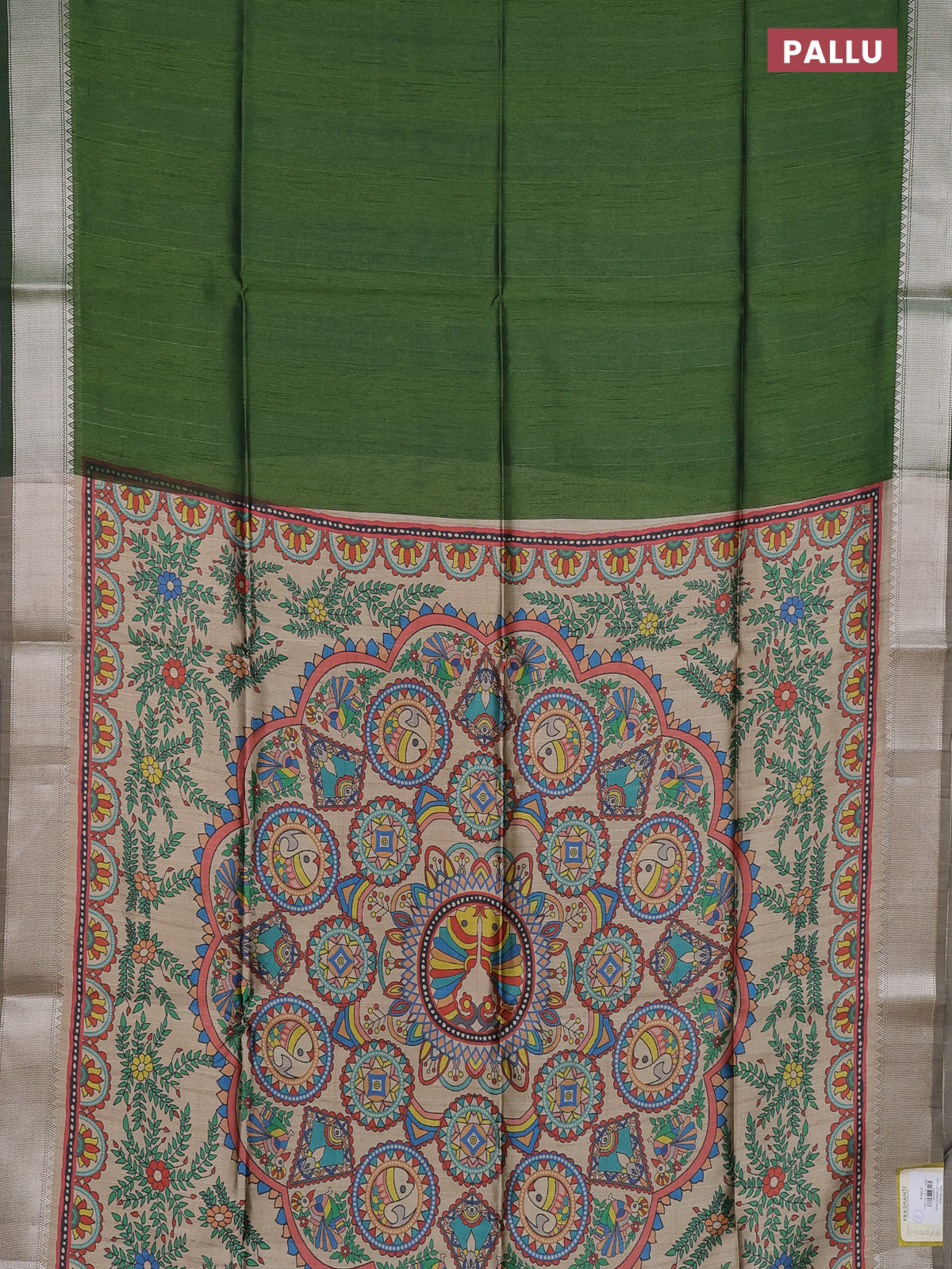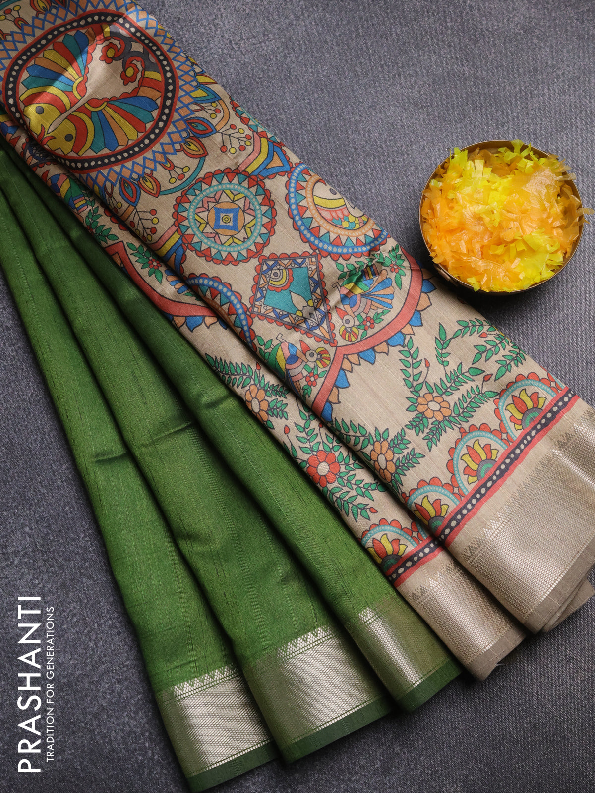 Semi dupion saree sap green and beige with plain body and kalamkari printed pallu
