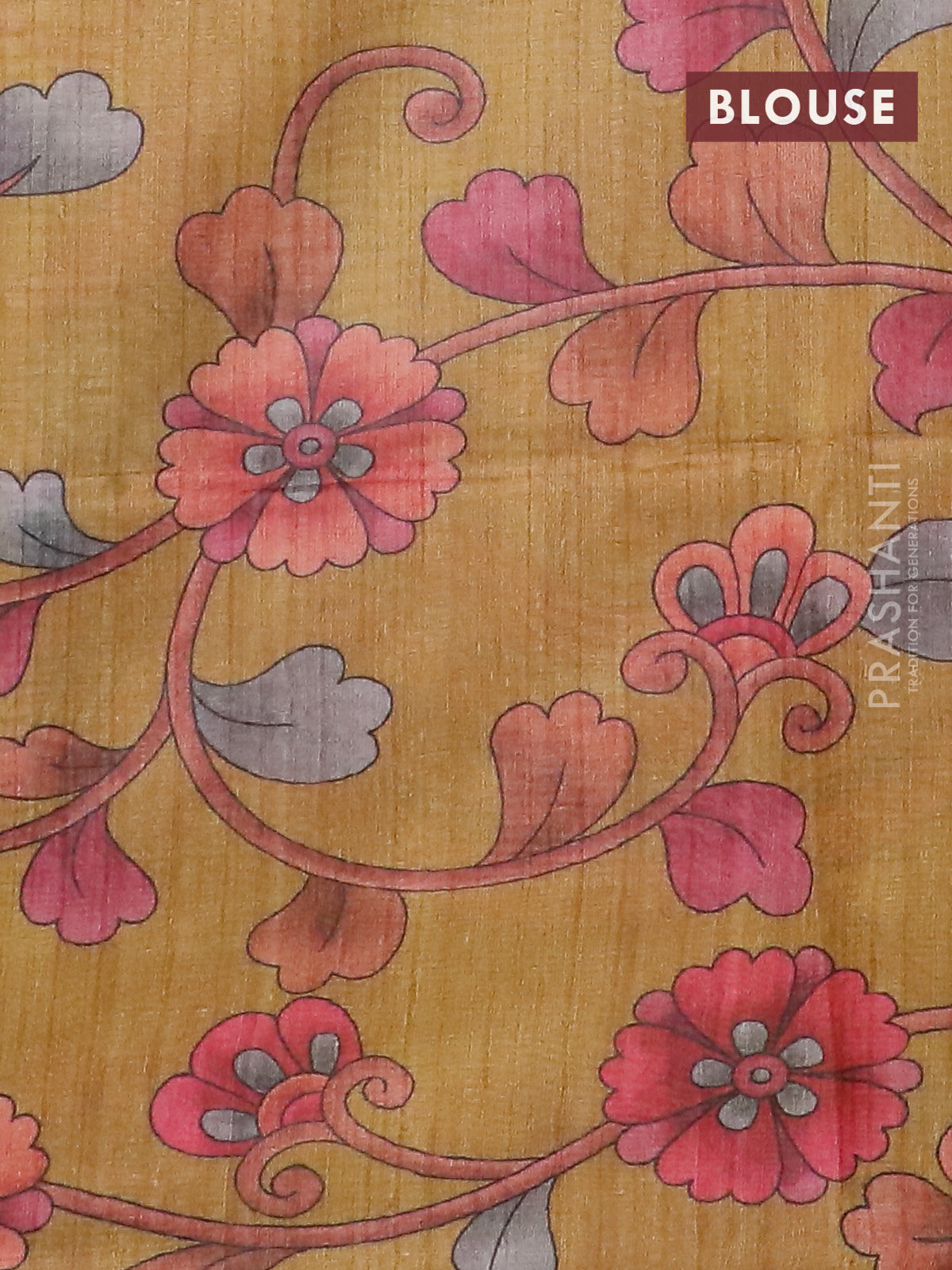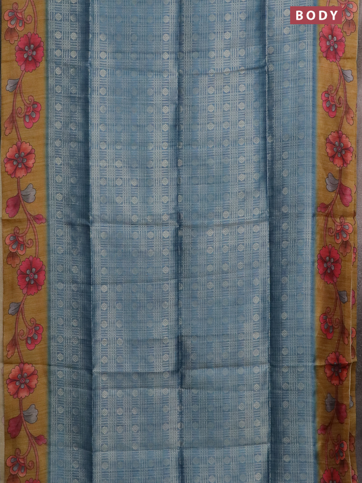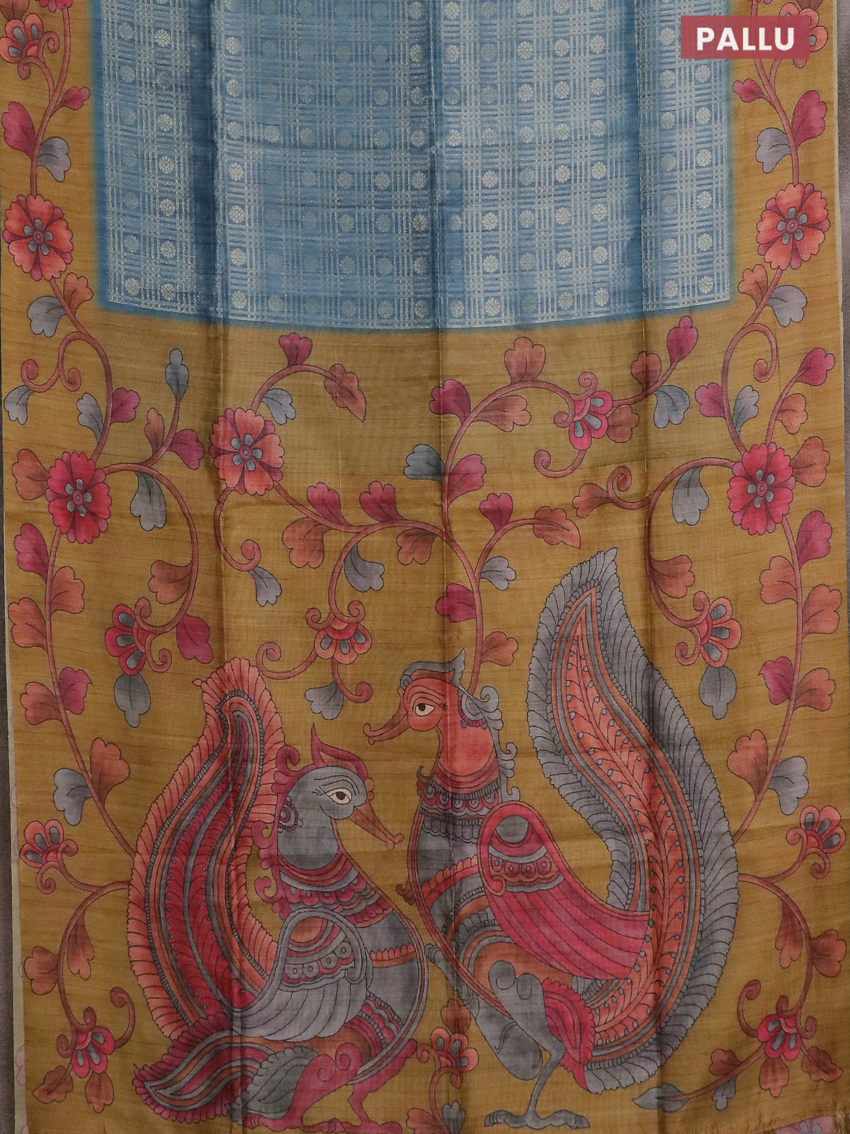 Semi jute silk saree bluish grey and mustard yellow with allover zari woven brocade weaves and kalamkari printed pallu