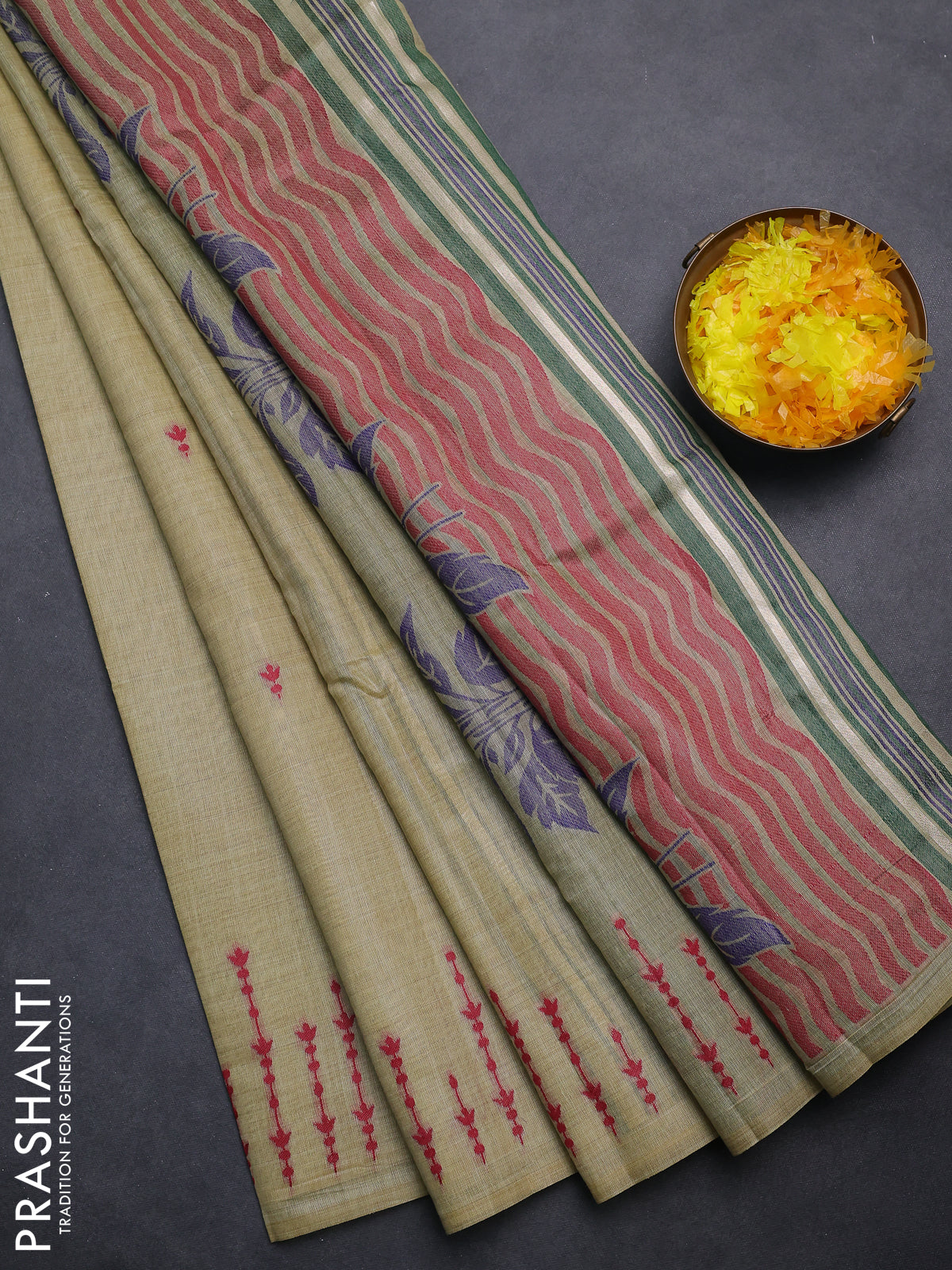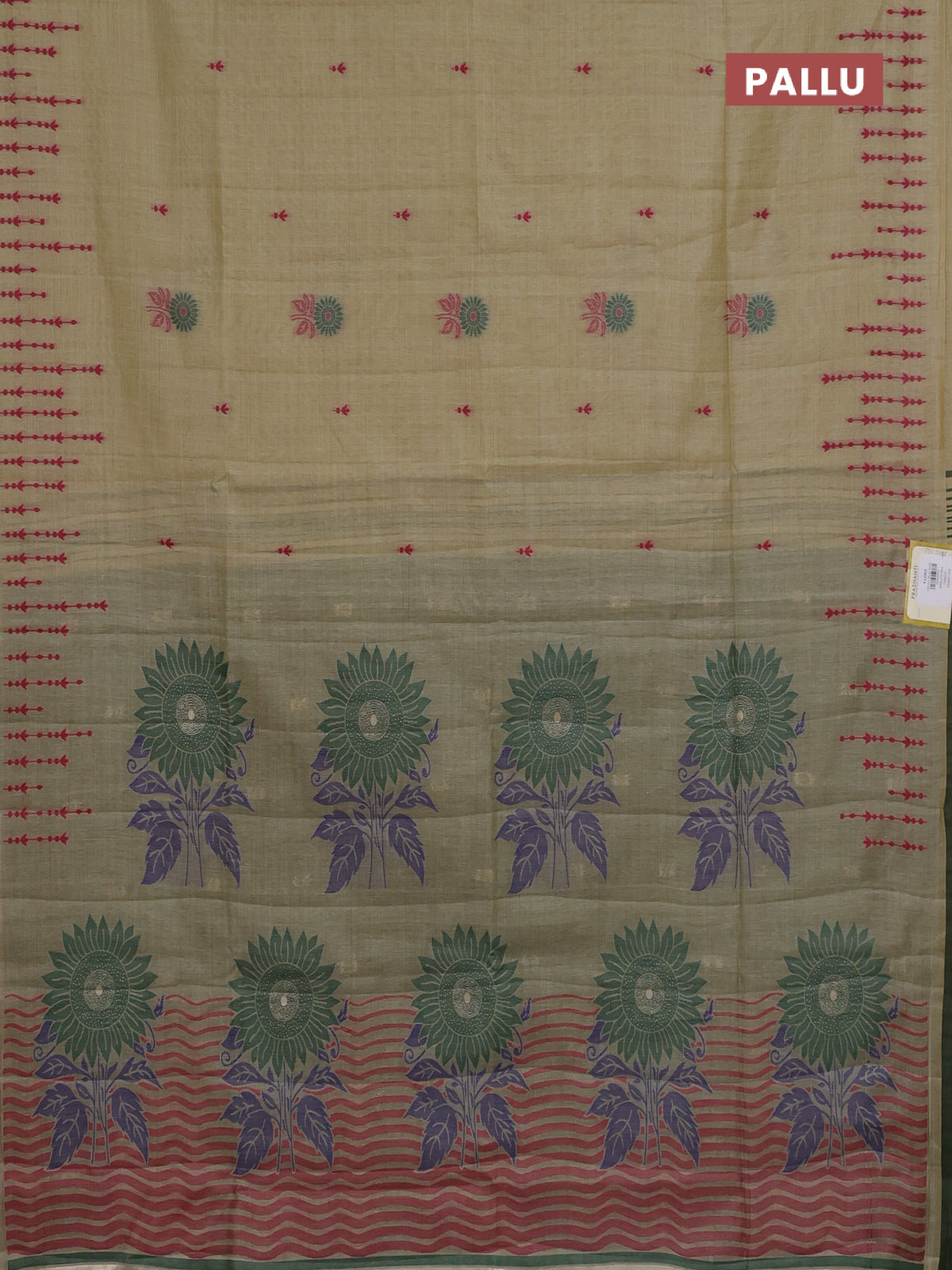 Semi jute silk saree elaichi green and green with thread woven buttas and floral design weaving pallu