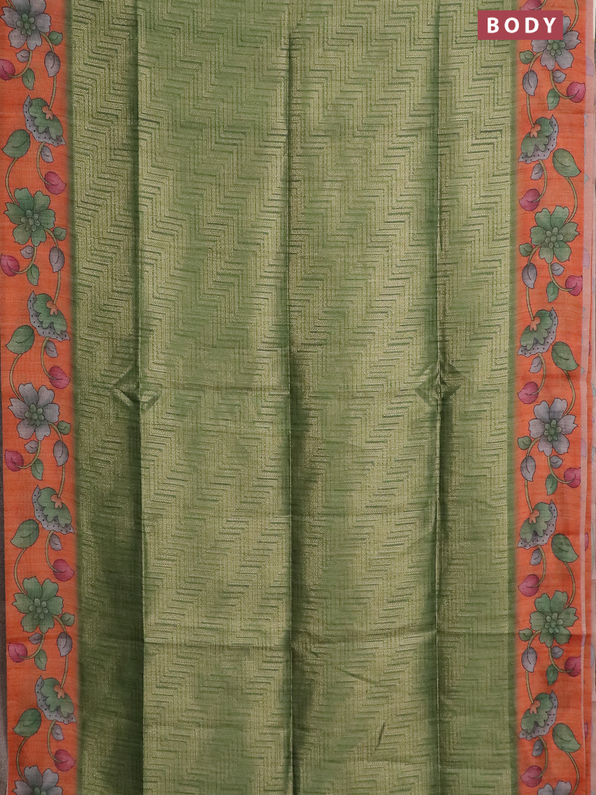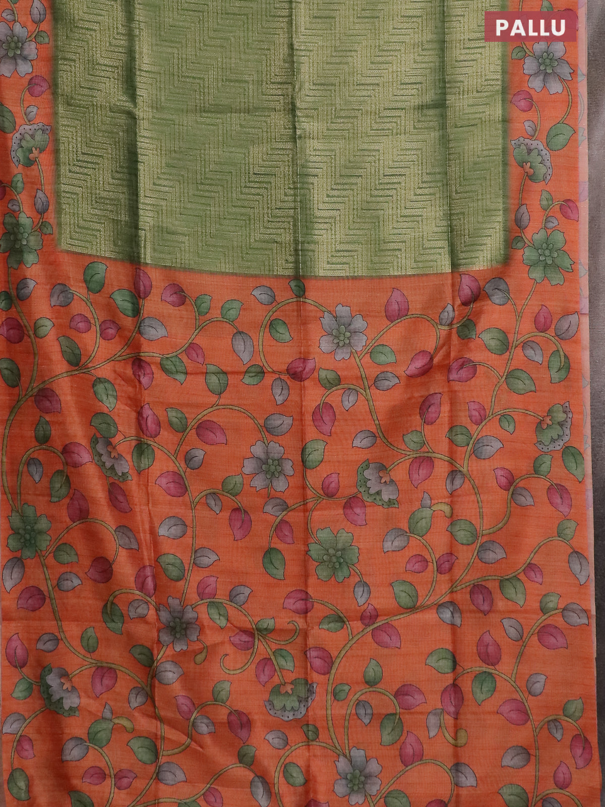 Semi jute silk saree green and orange with allover zari woven brocade weaves and kalamkari printed pallu