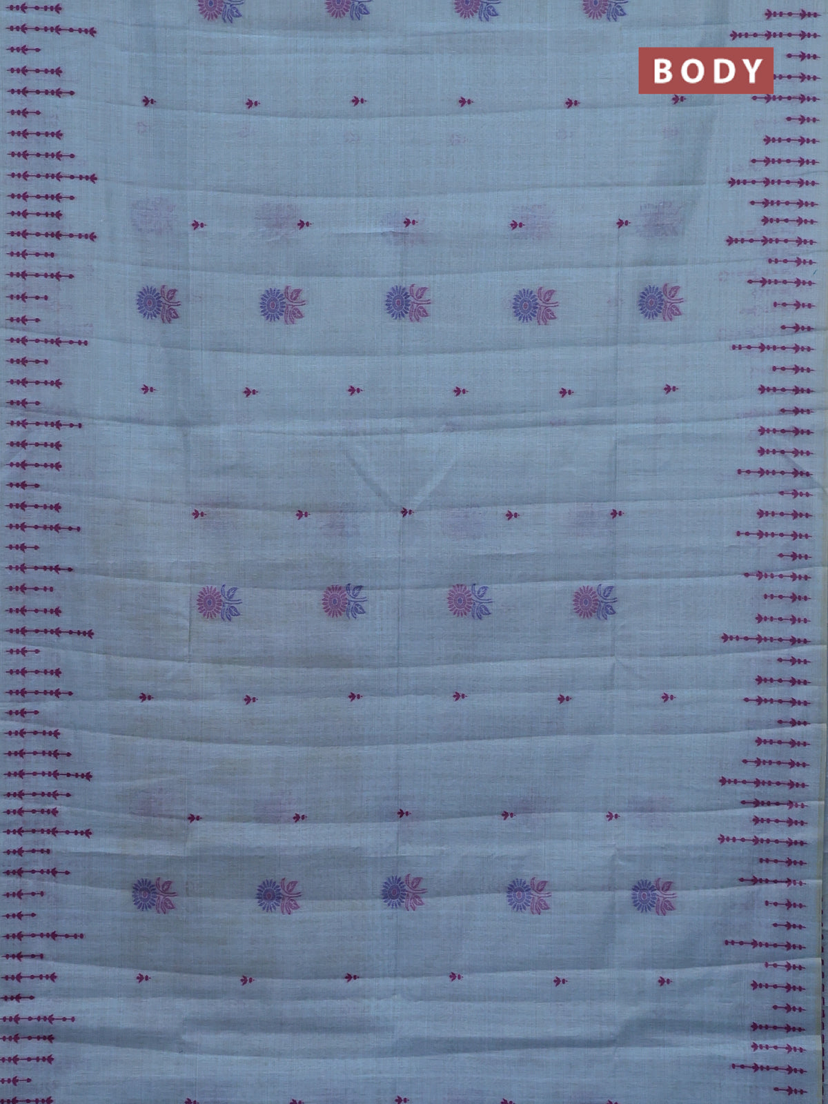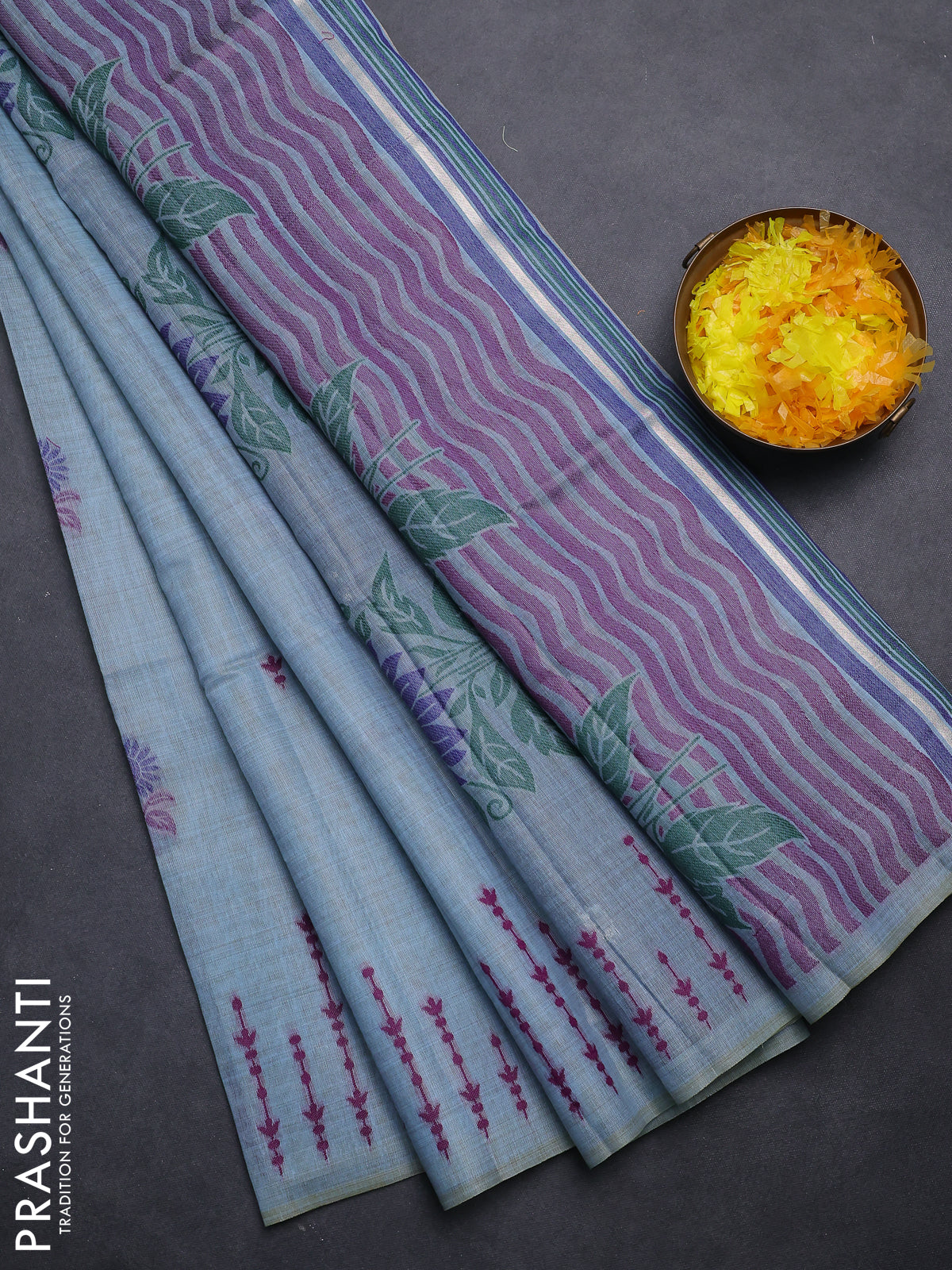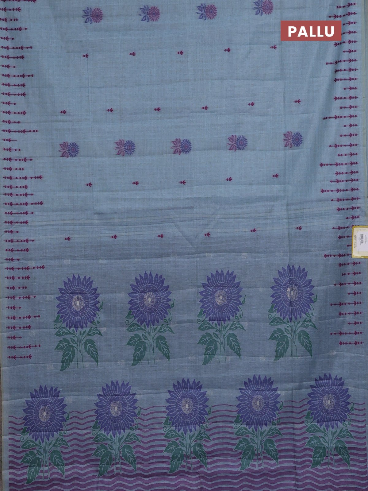 Semi jute silk saree pastel blue and blue with thread woven buttas and floral design weaving pallu