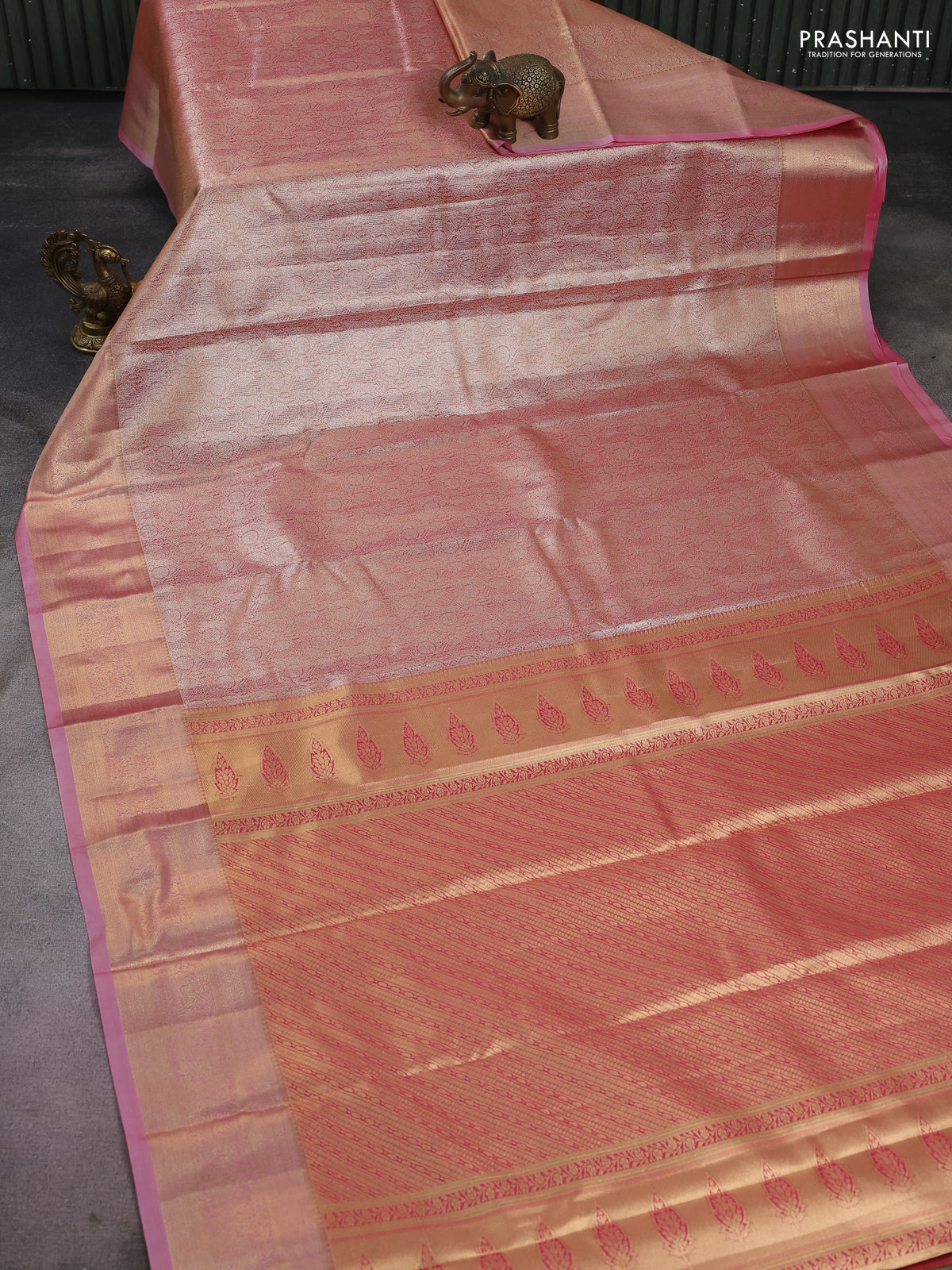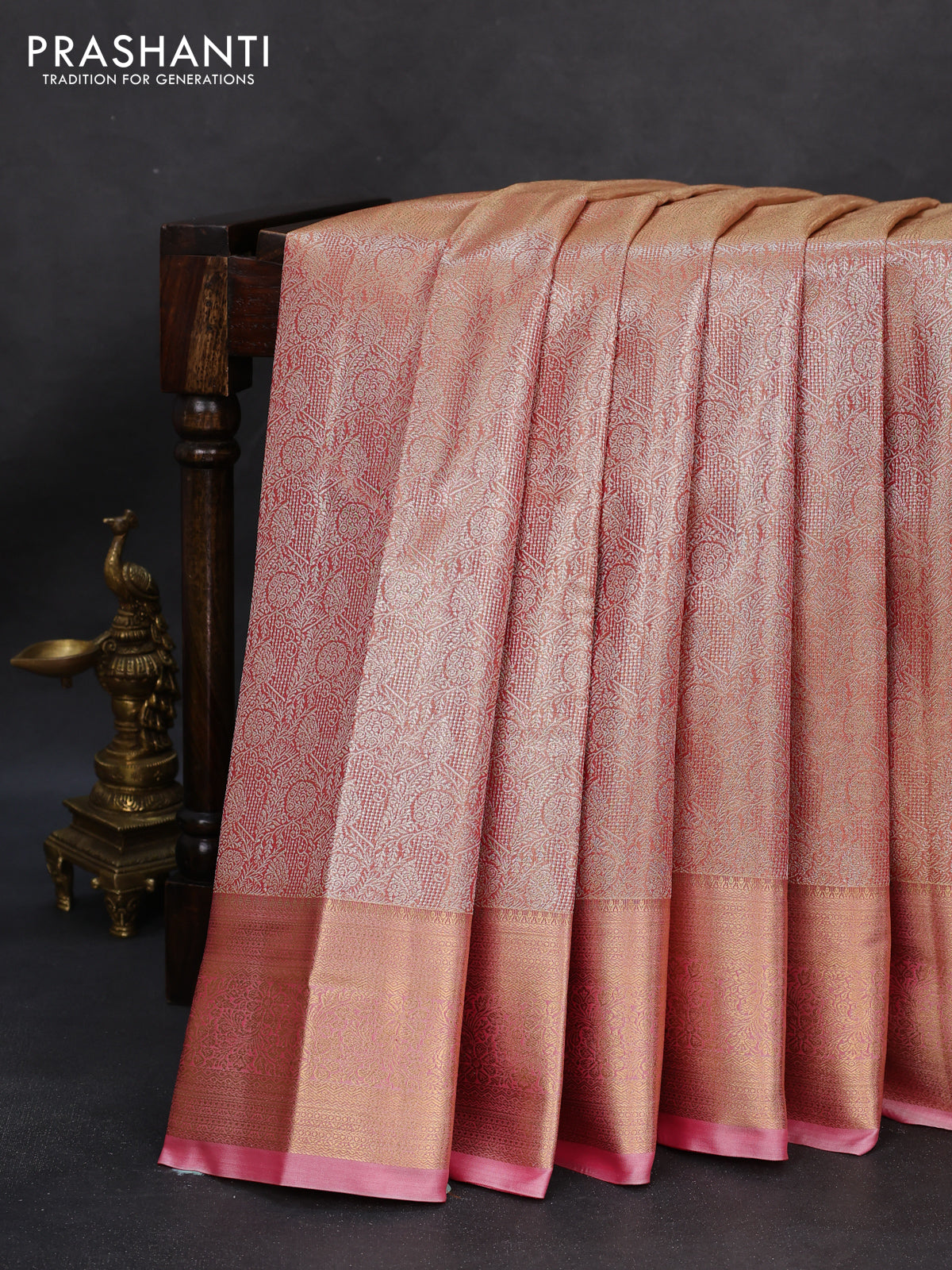 Semi kanchipuram tissue silk saree dual shade of peach and peach pink with allover silver zari woven brocade weaves and zari woven border