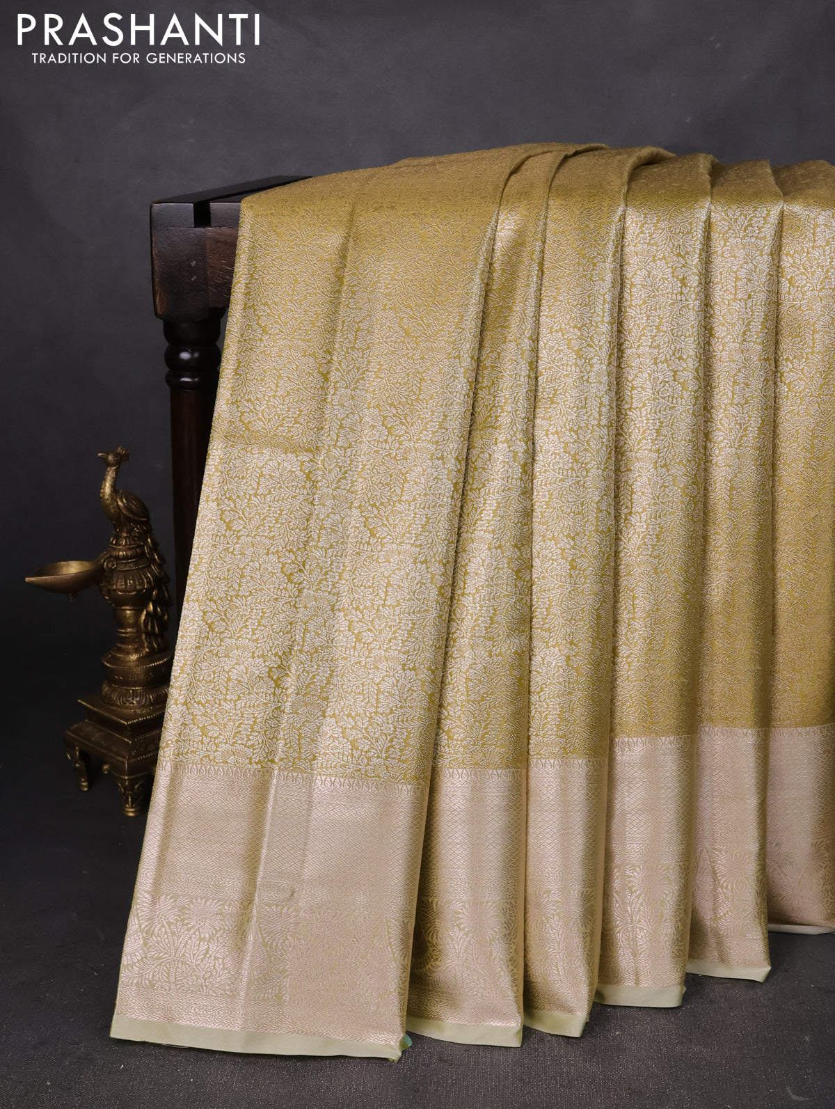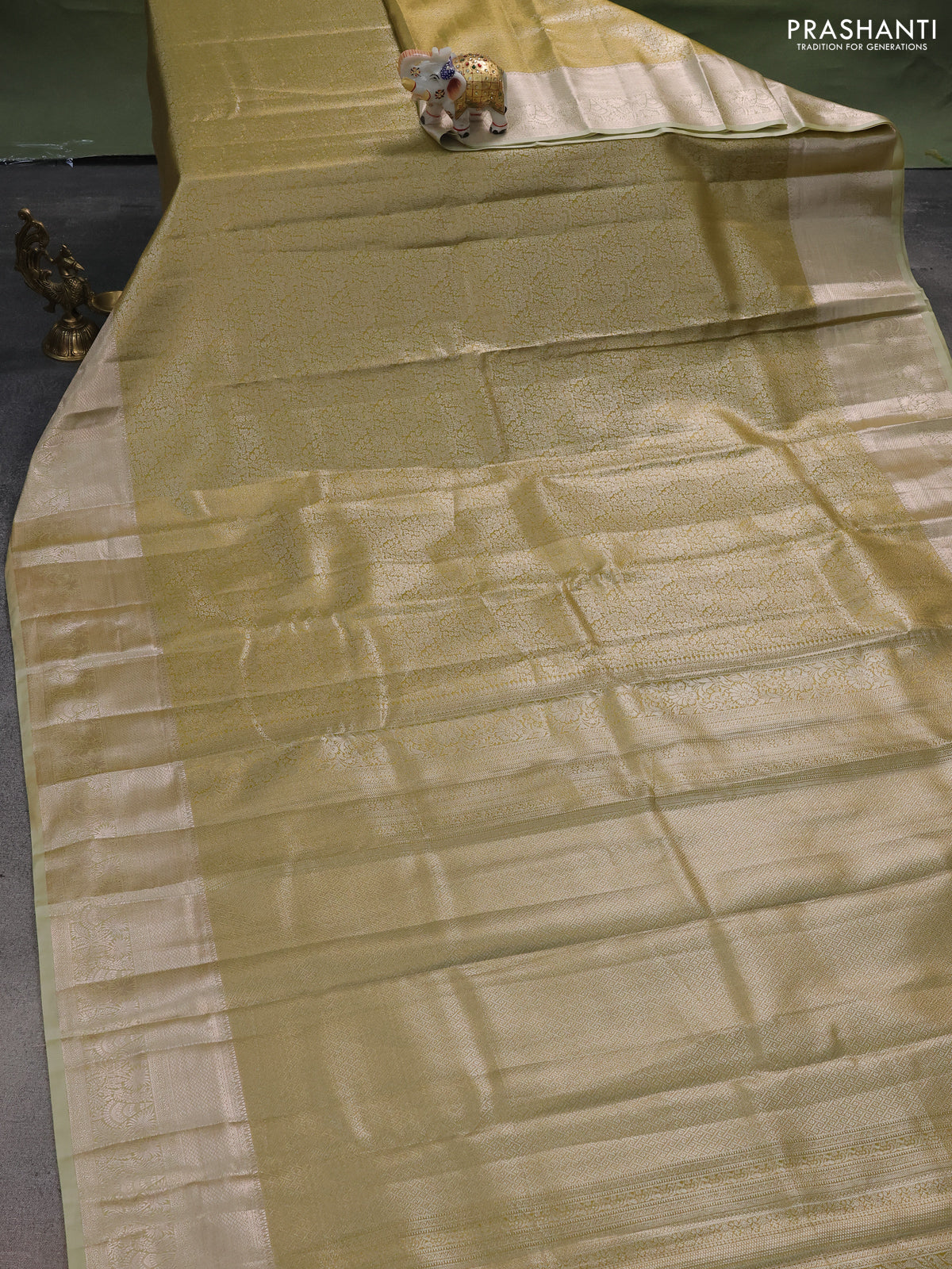 Semi kanchipuram tissue silk saree lime green and elaichi green with allover silver zari woven brocade weaves and zari woven border