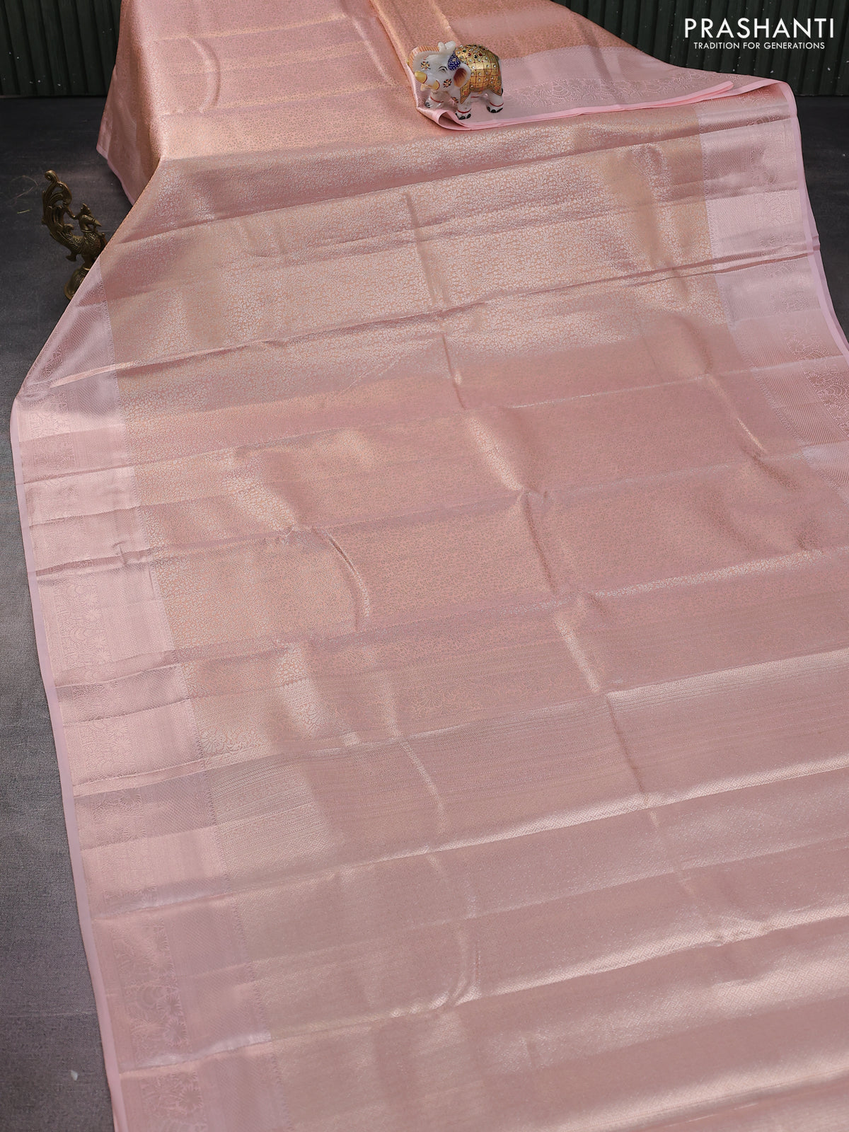 Semi kanchipuram tissue silk saree mild peach orange with allover silver zari woven brocade weaves and zari woven border