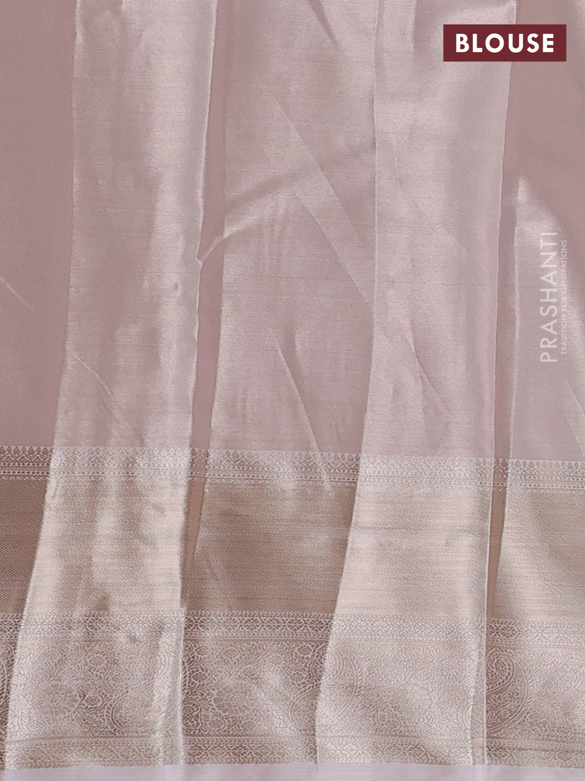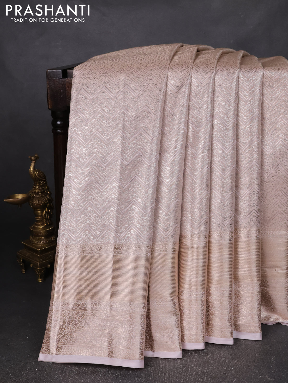 Semi kanchipuram tissue silk saree pastel peach with allover silver zari woven brocade weaves and long zari woven border
