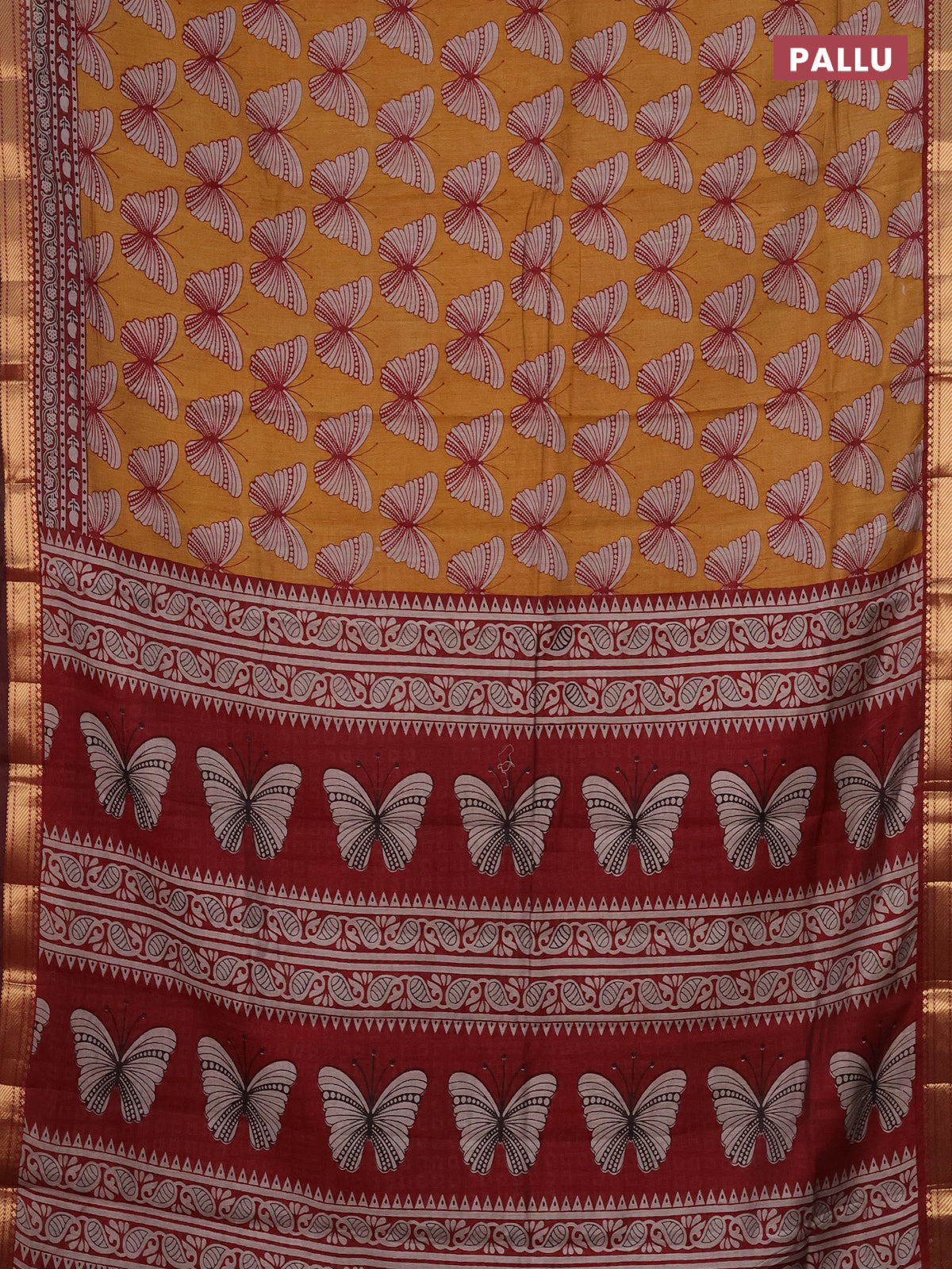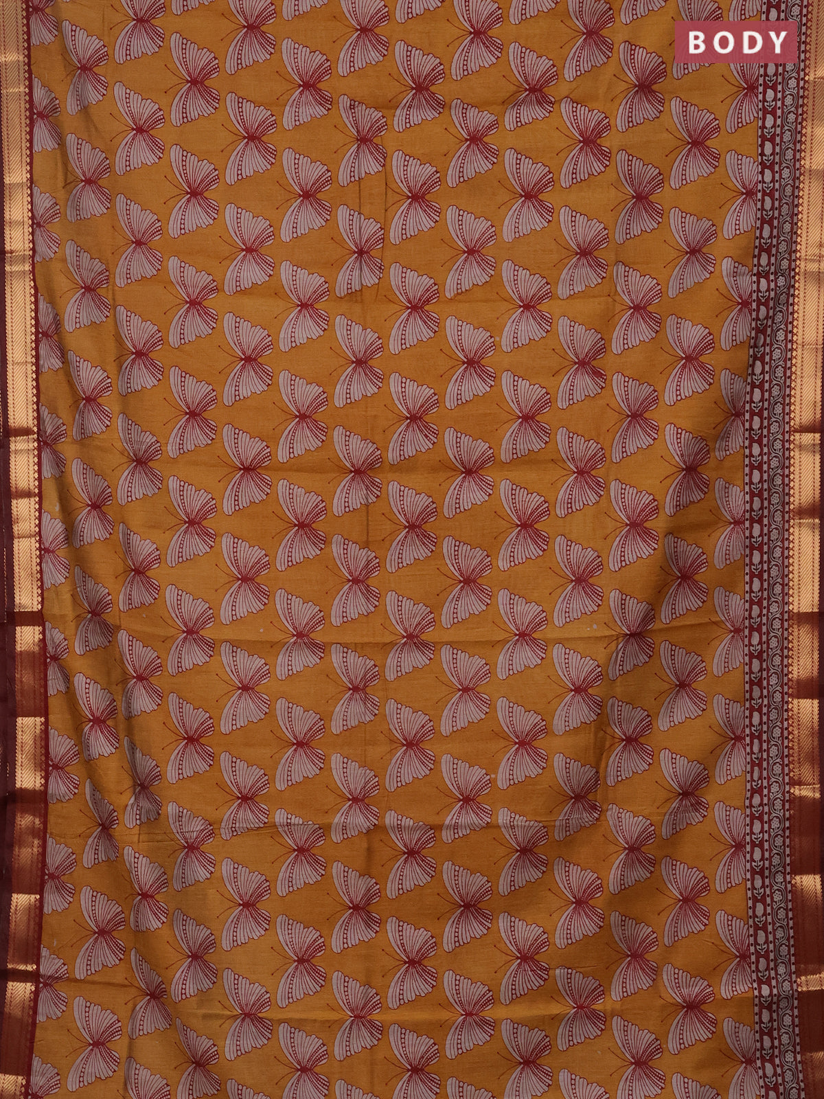 Semi maheshwari cotton saree dark mustard and maroon with allover butterfly butta prints and zari woven border
