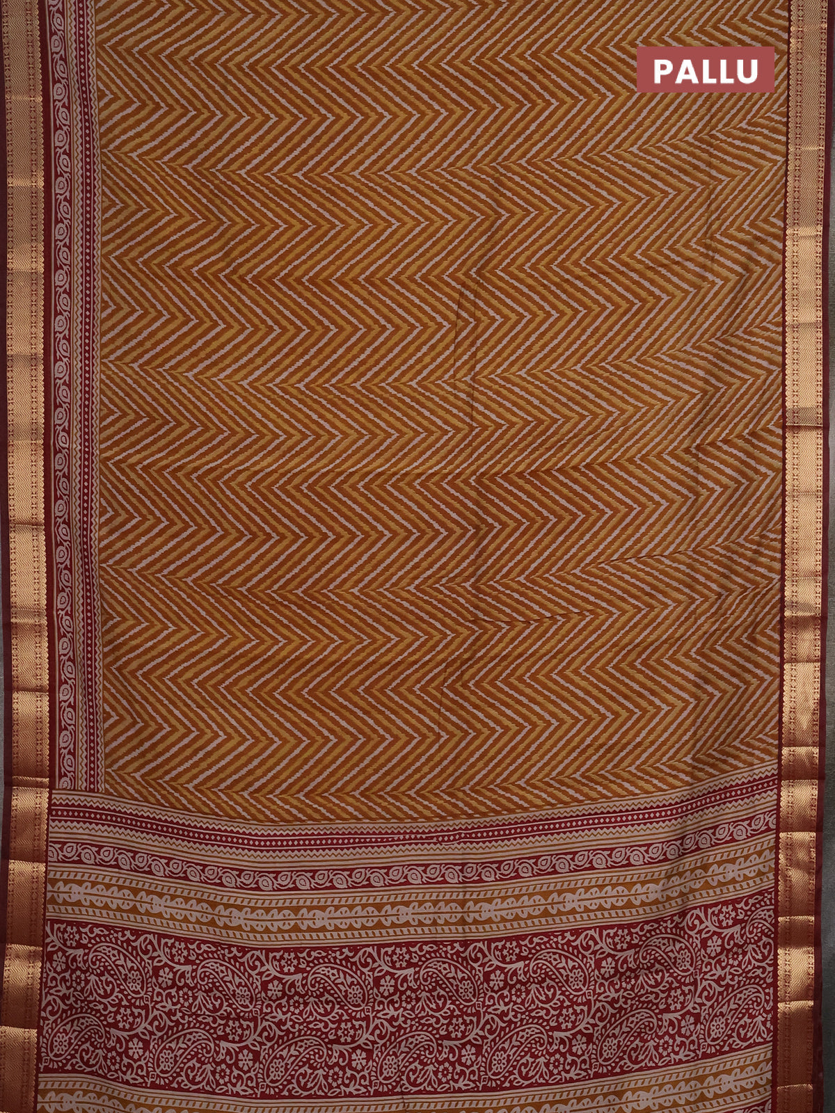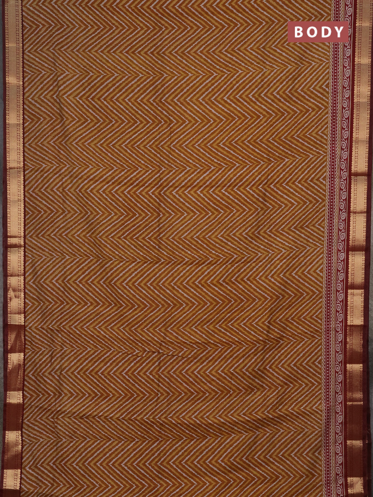 Semi maheshwari cotton saree dark mustard and maroon with allover ikat prints and zari woven border