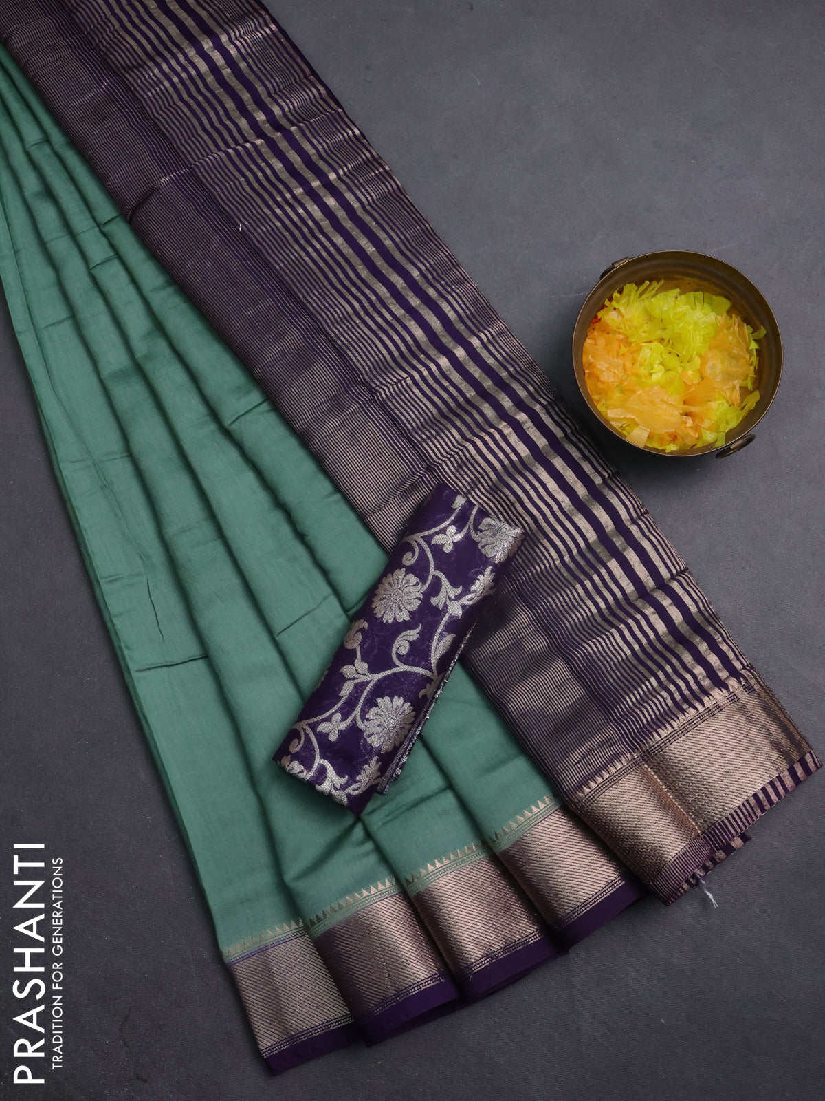 Semi mangalgiri saree pastel green and violet with plain body and zari woven border