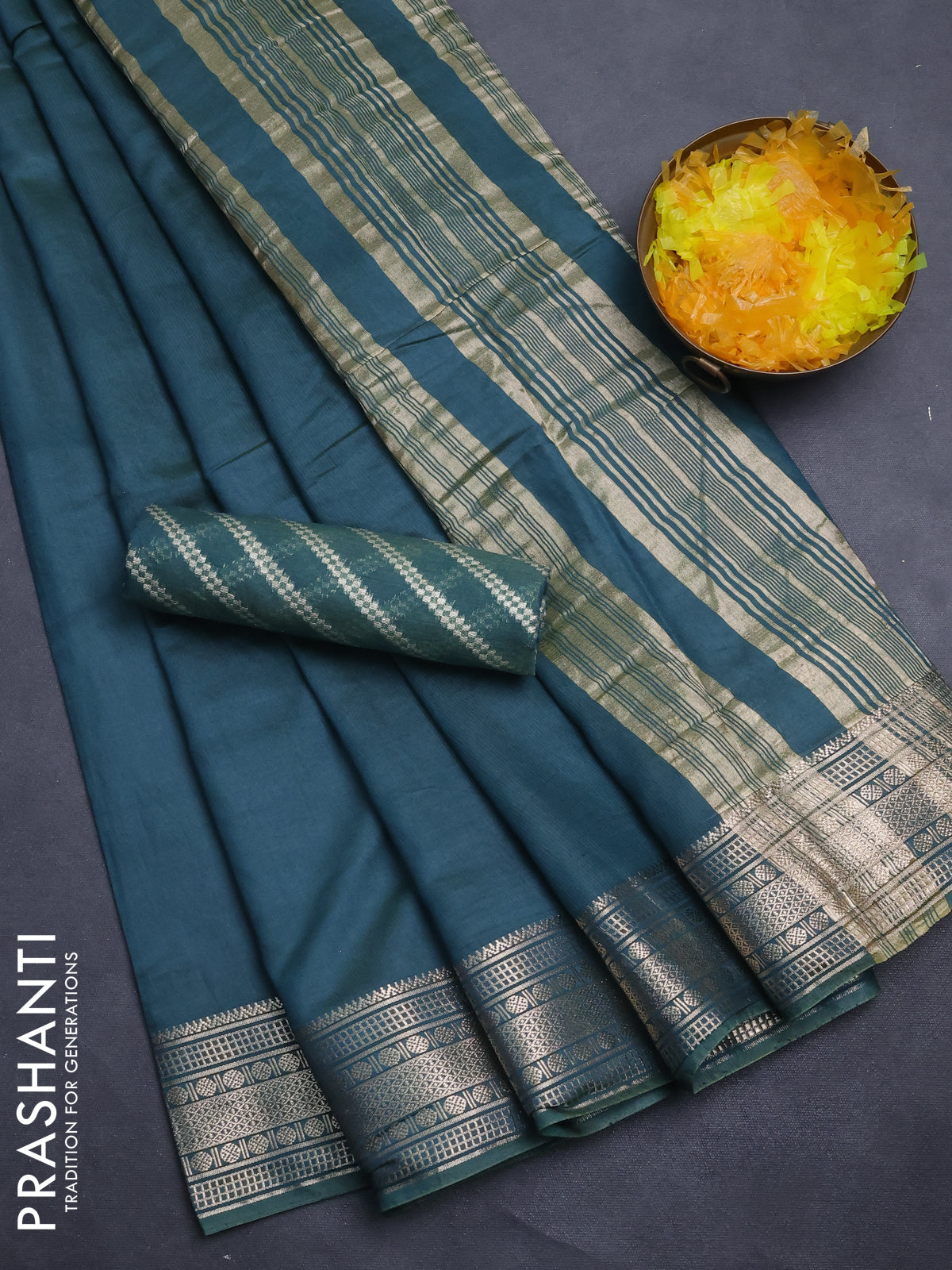 Semi mangalgiri saree peacock green with plain body and zari woven border
