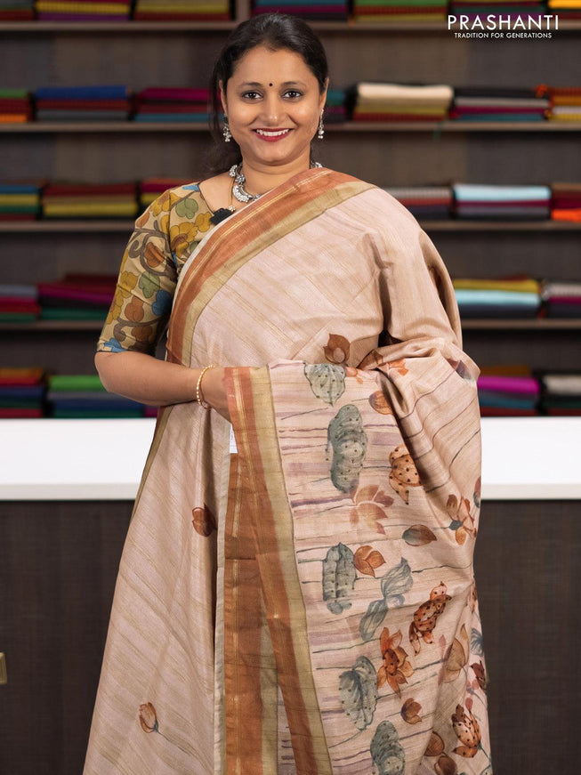 Semi matka saree greenish grey with allover pichwai prints & french knot work and simple zari border and