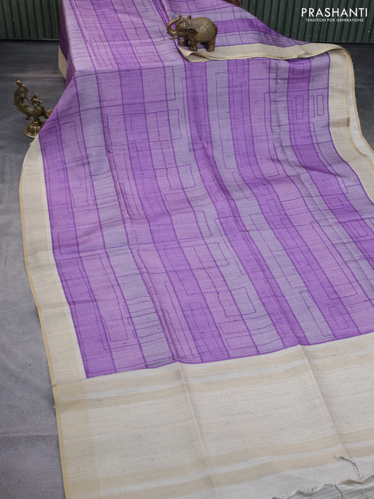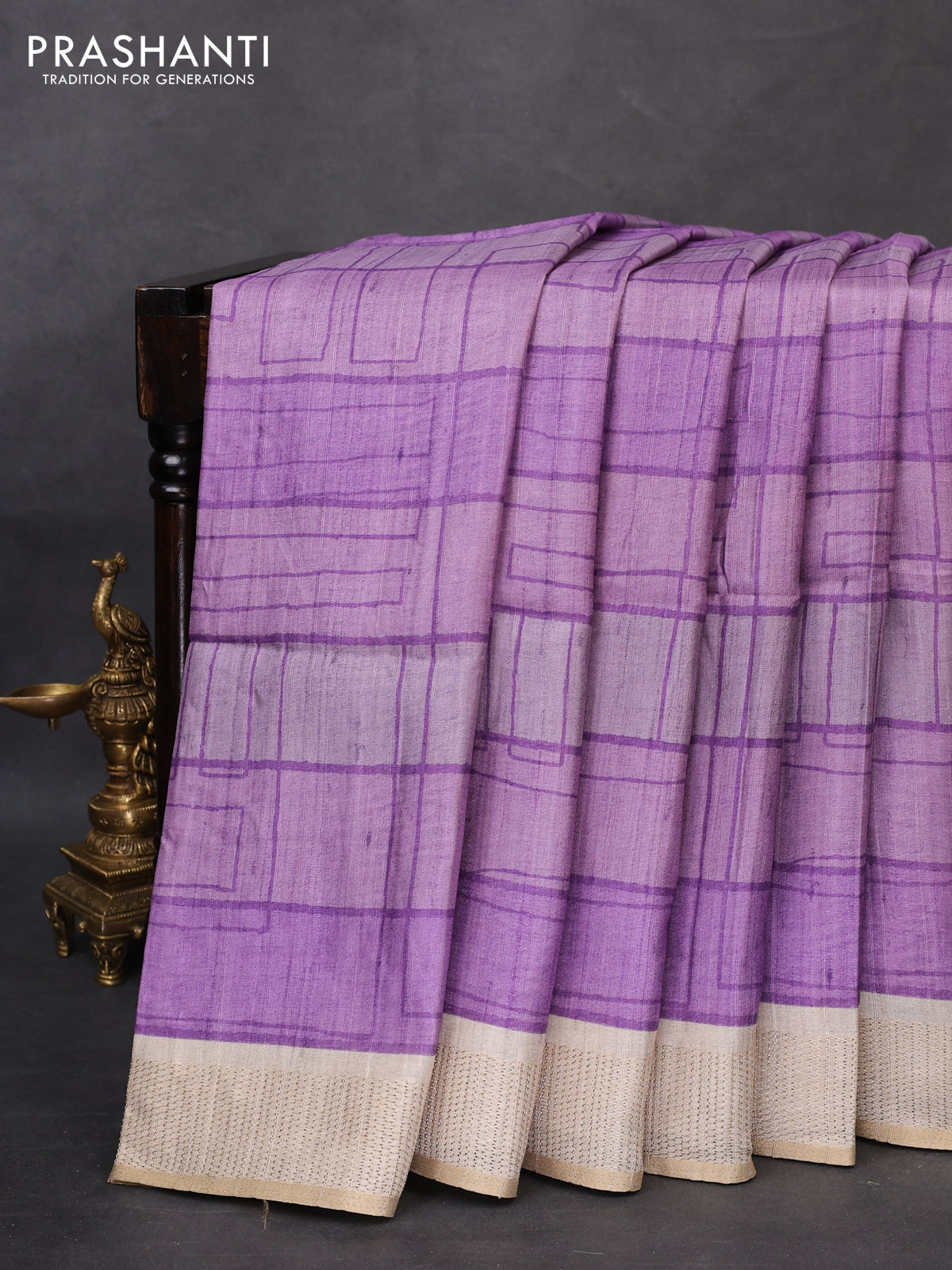 Semi matka saree lavender and beige with allover geometric prints and zari woven border