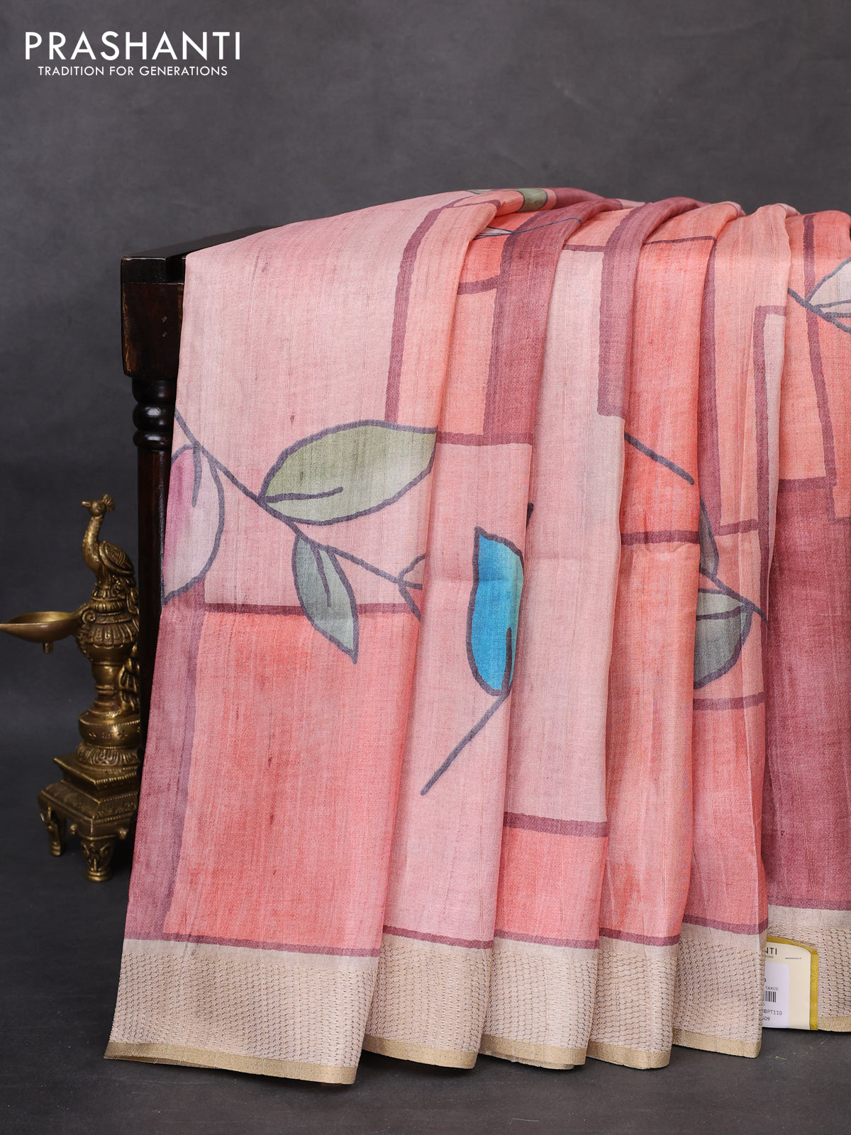 Semi matka saree peach pink and maroon beige with allover geometric prints and zari woven border