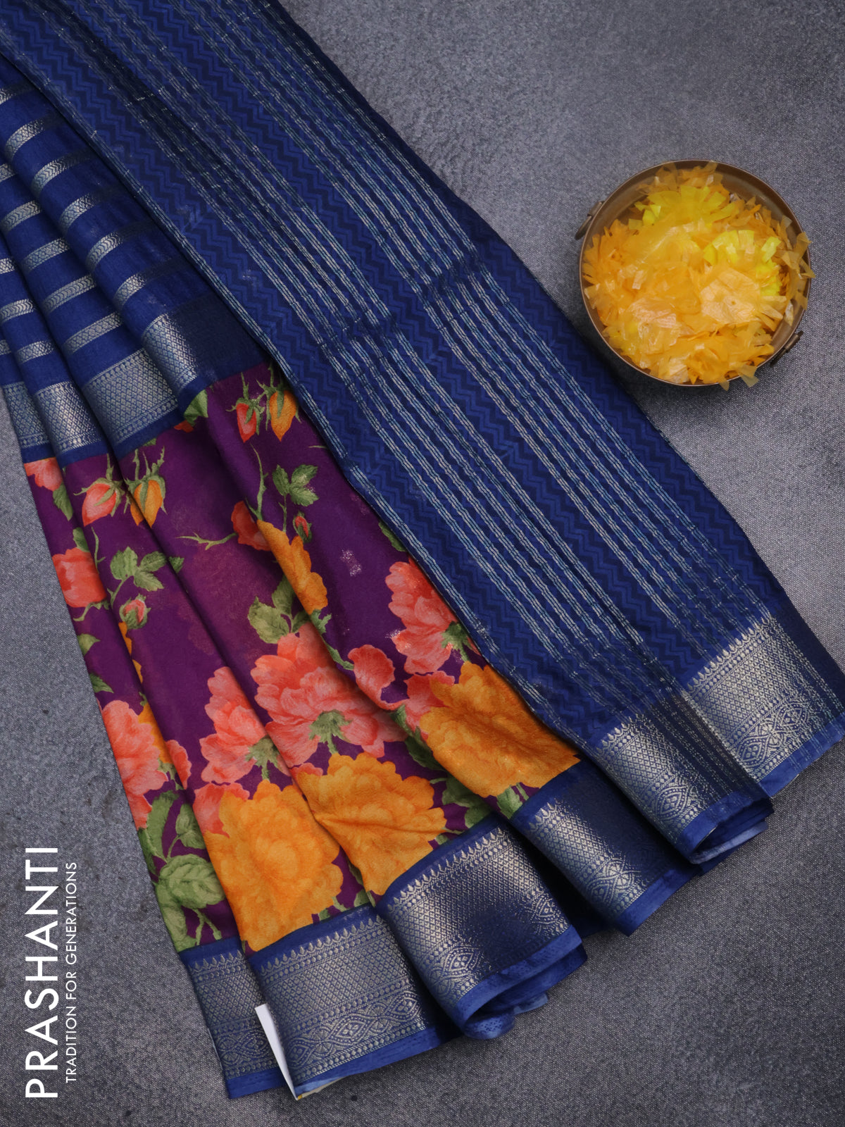 Semi mysore crepe saree blue and purple with zari weaves and long printed border