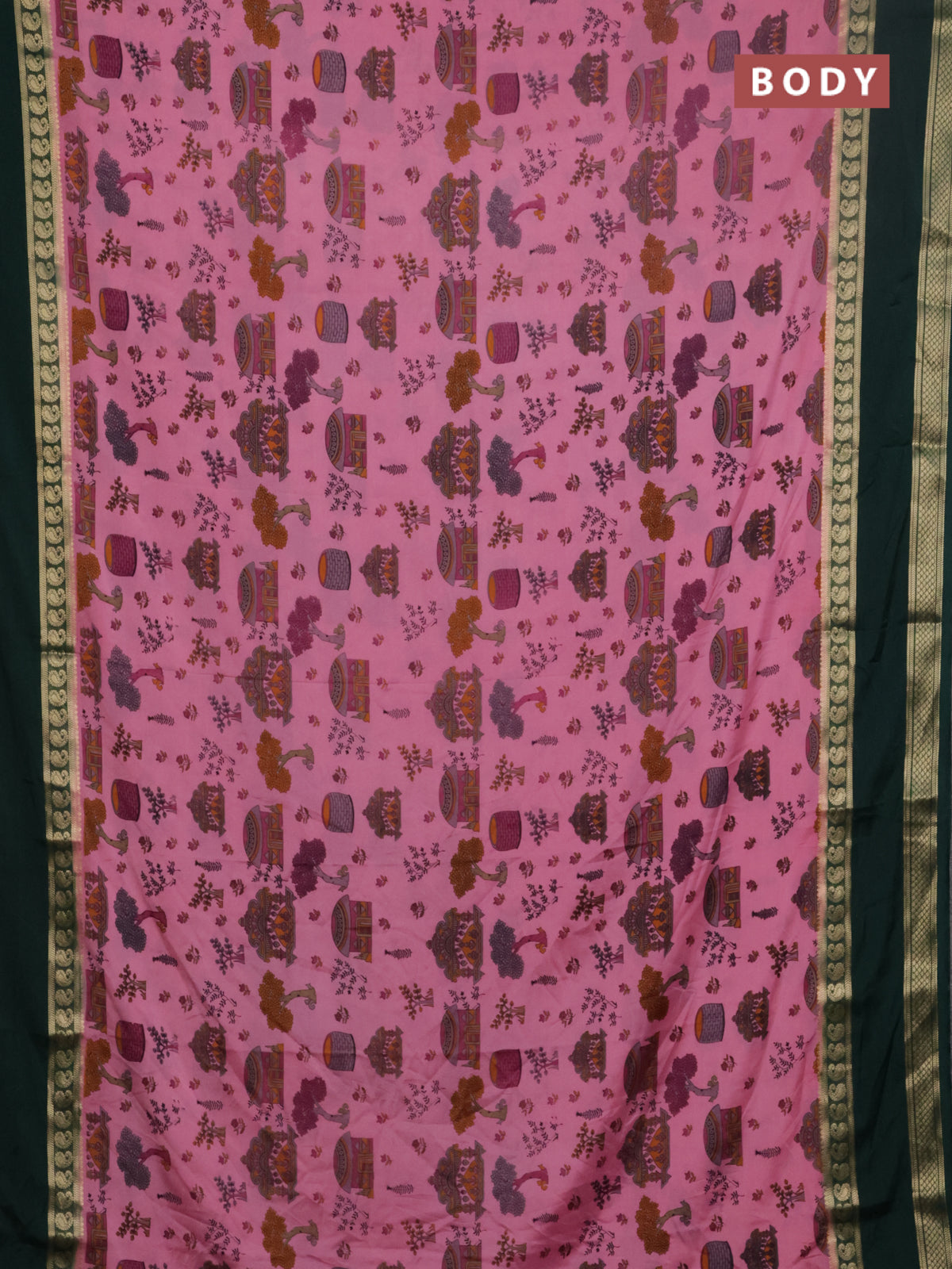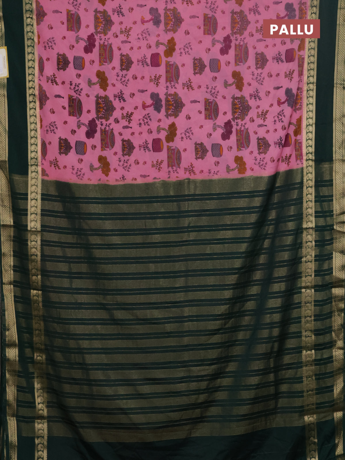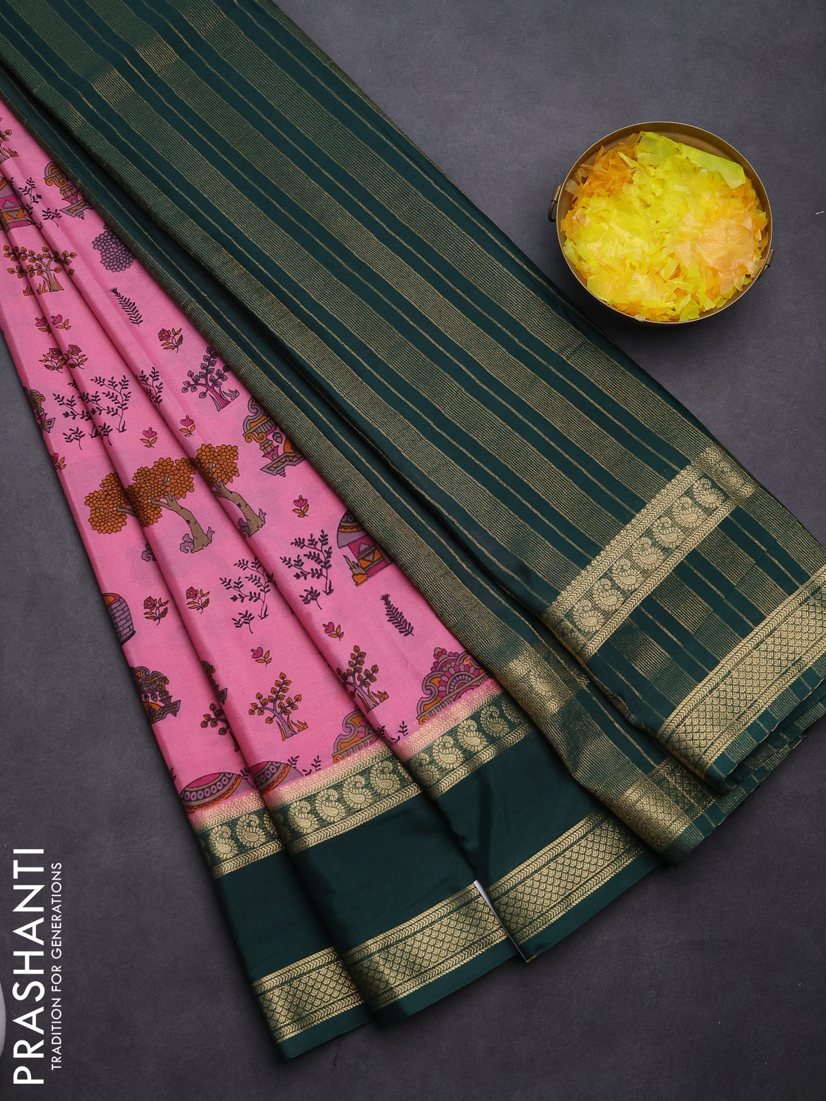 Semi mysore silk saree light pink and bottle green with allover kalamkari prints and rettapet zari woven border