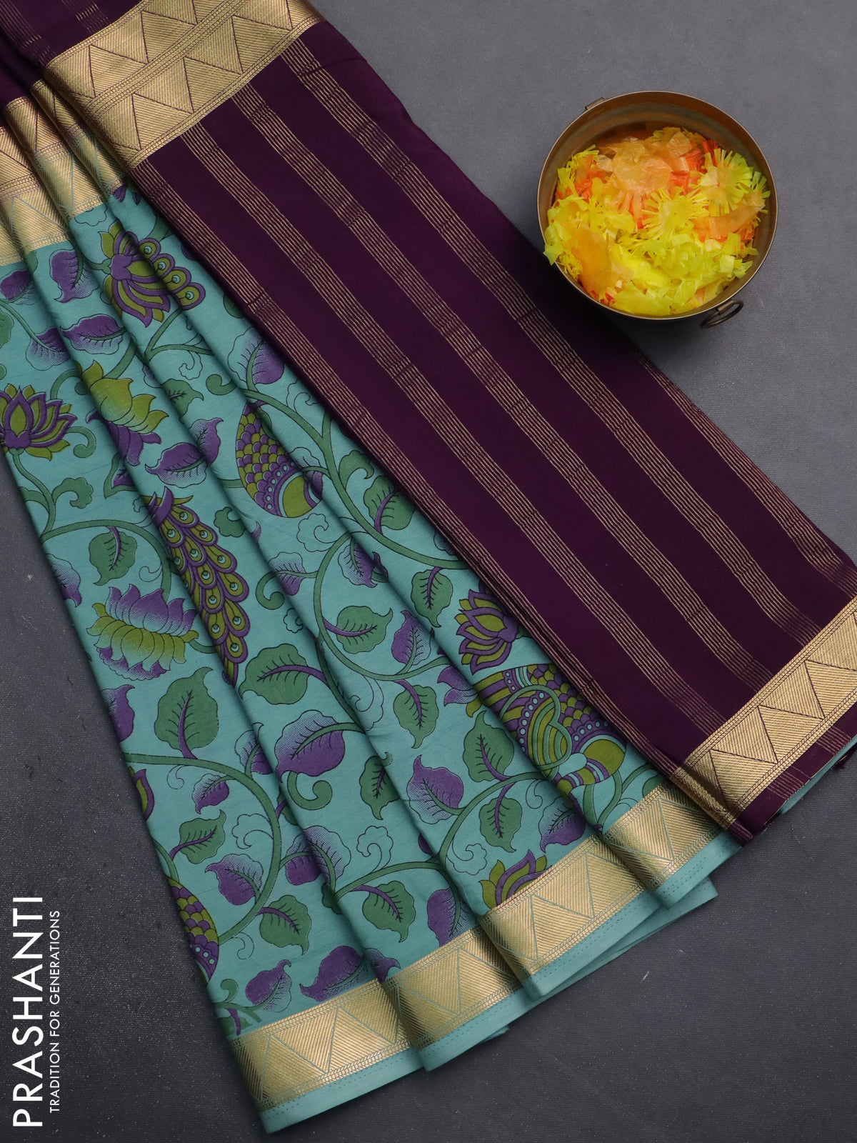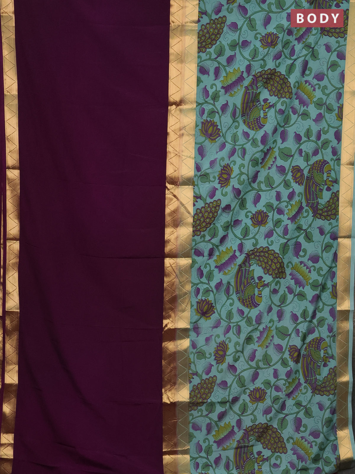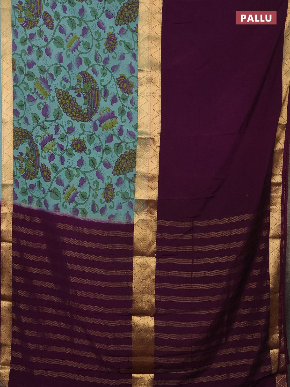 Semi mysore silk saree wine shade and pastel blue with half & half style and long kalamkari printed border