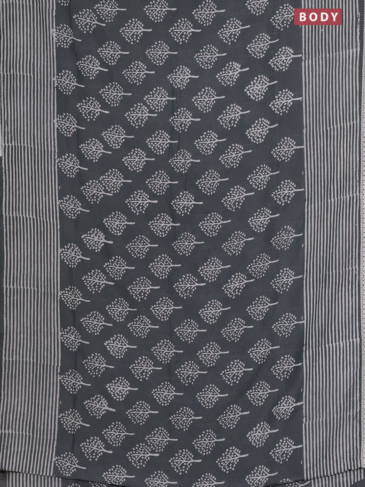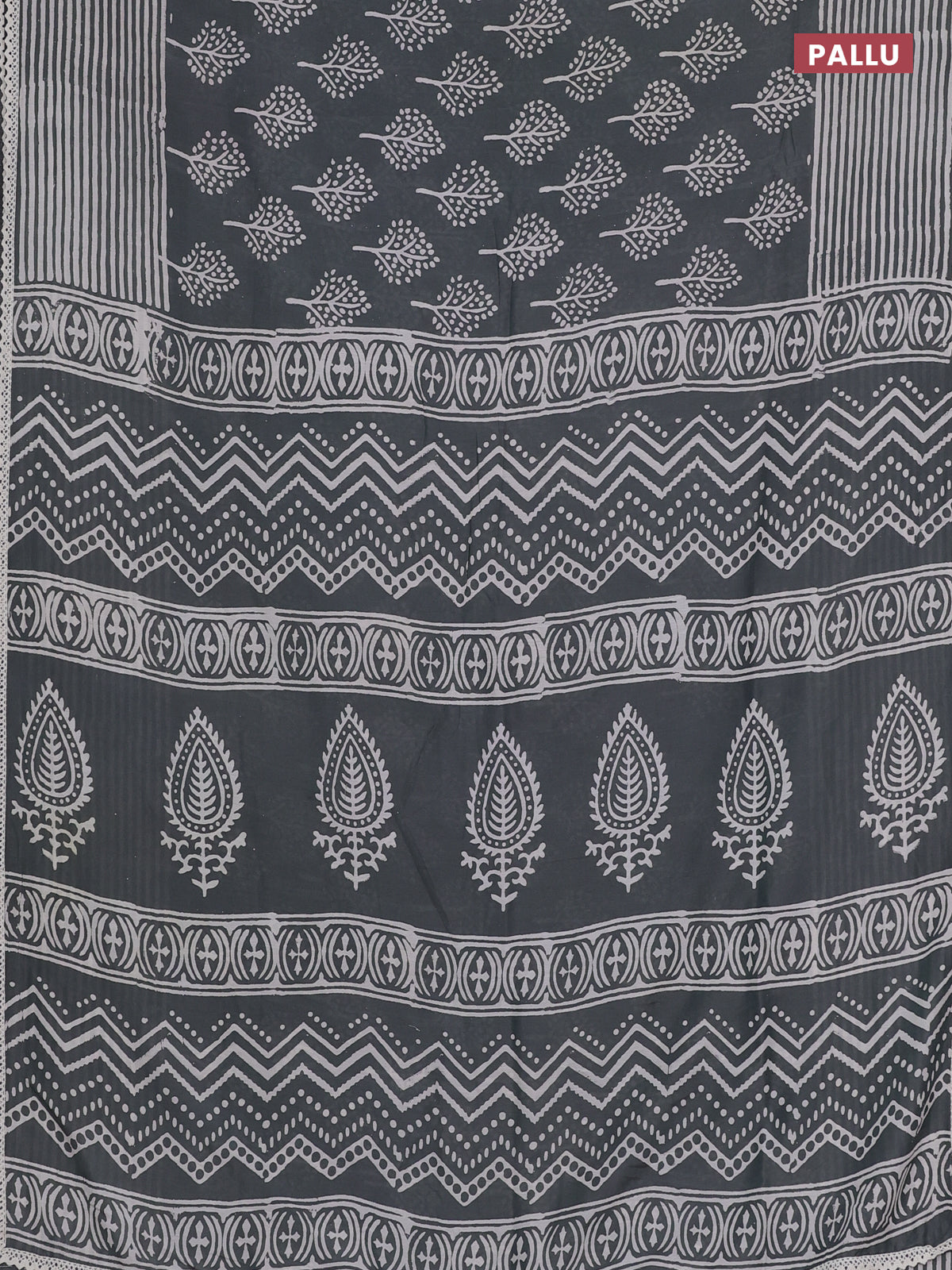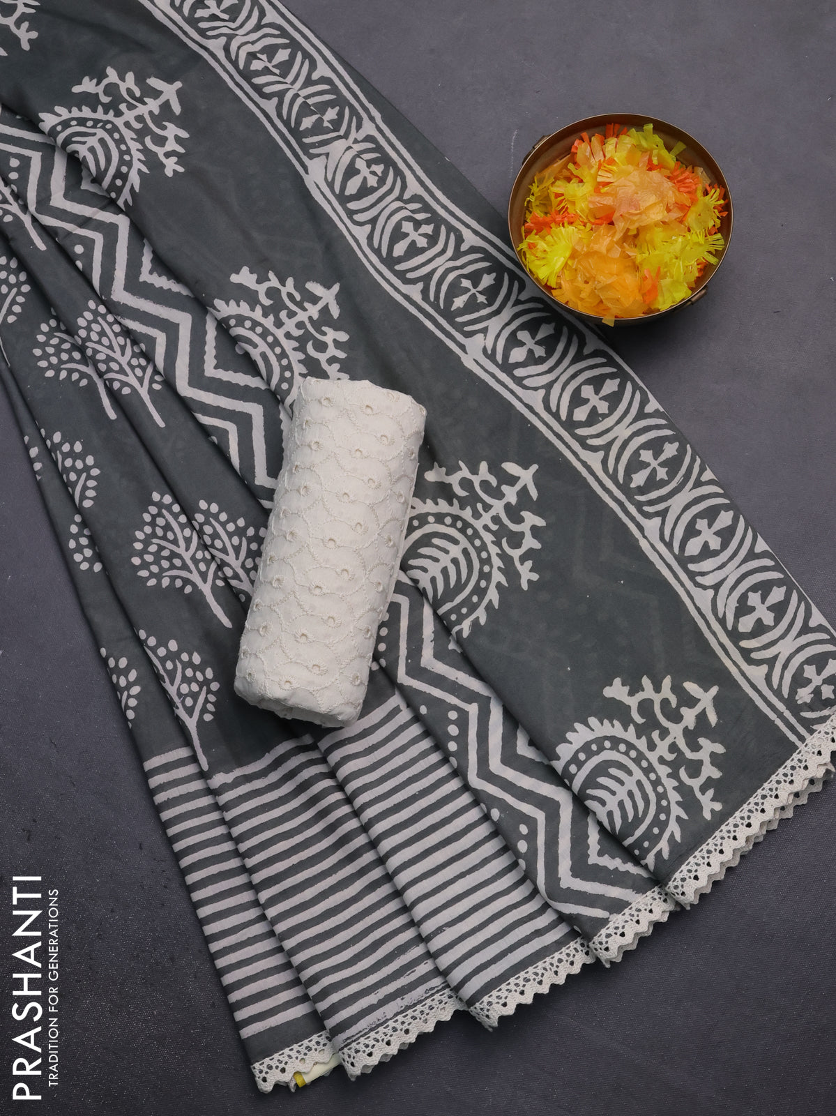 Semi pashmina silk saree grey and cream with allover tree butta prints and crocia lace work border