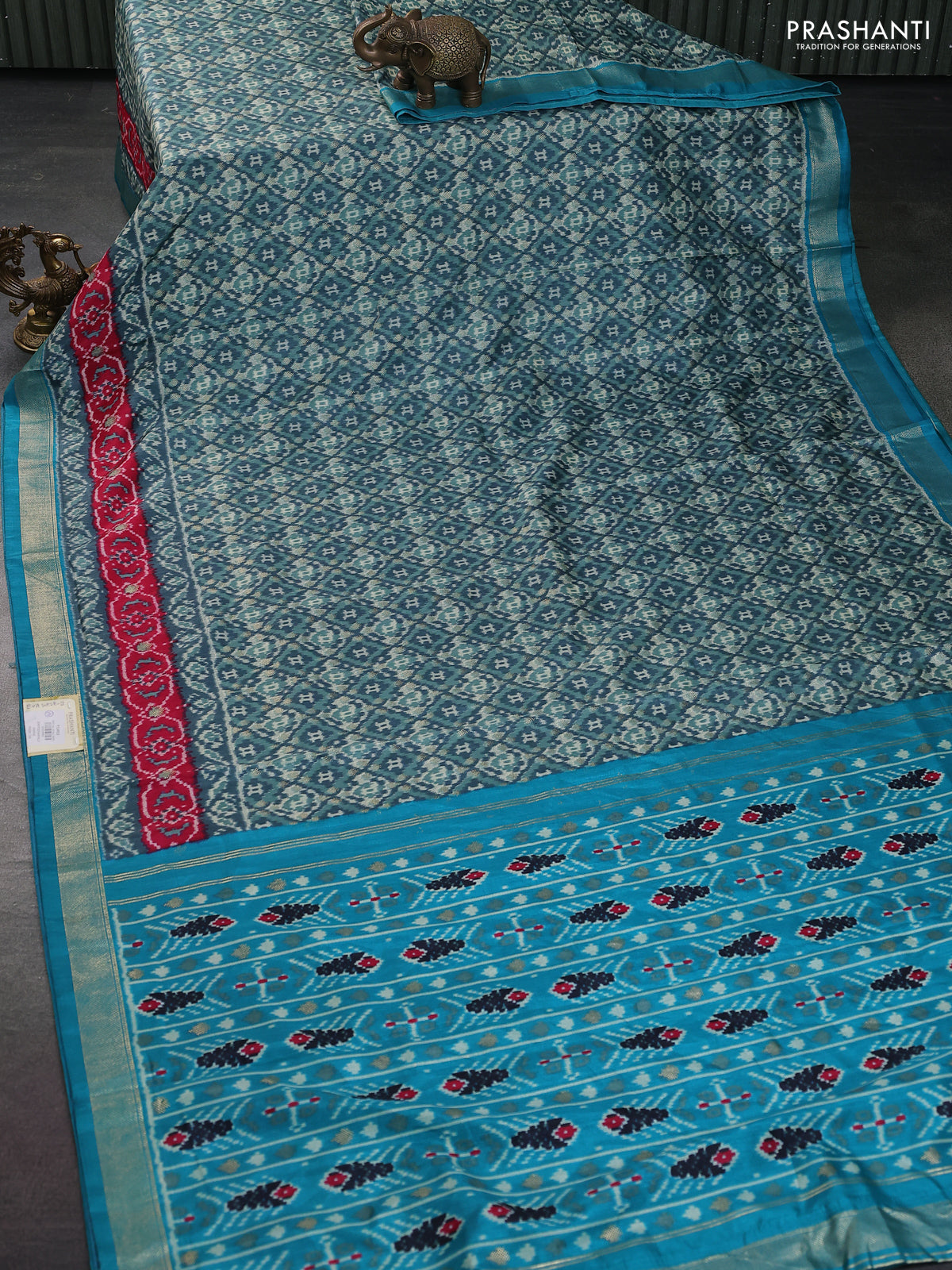 Semi pochampally silk saree greyish blue and teal blue with allover ikat weaves and zari woven border