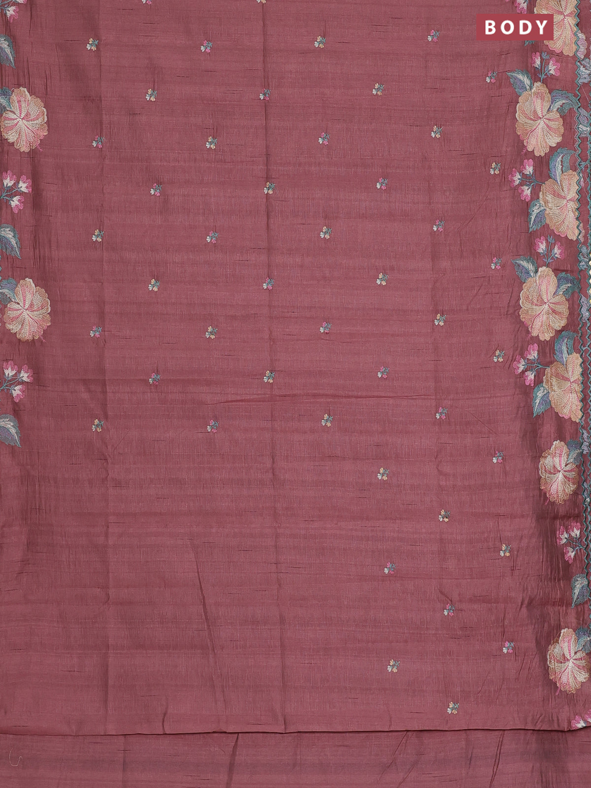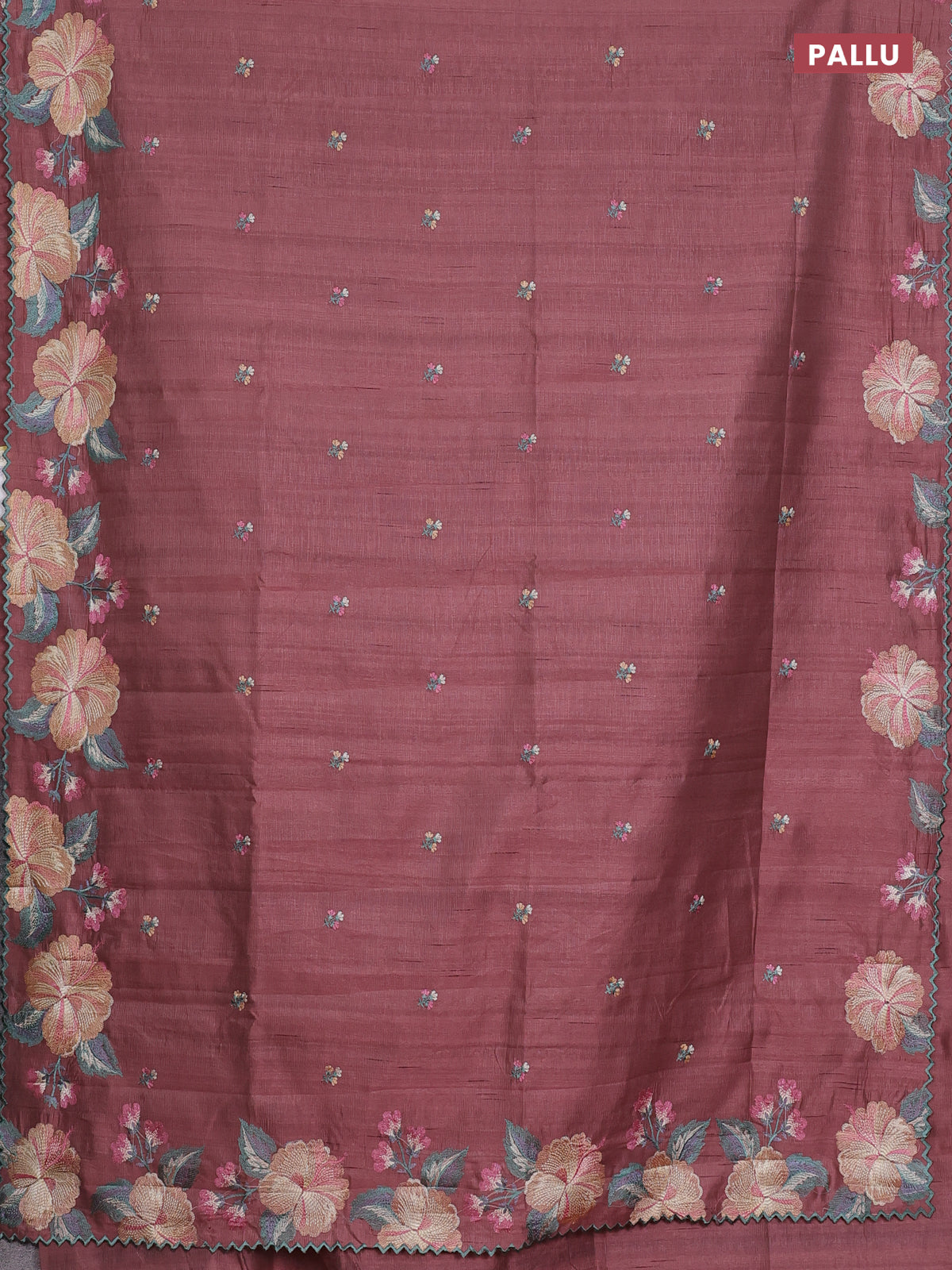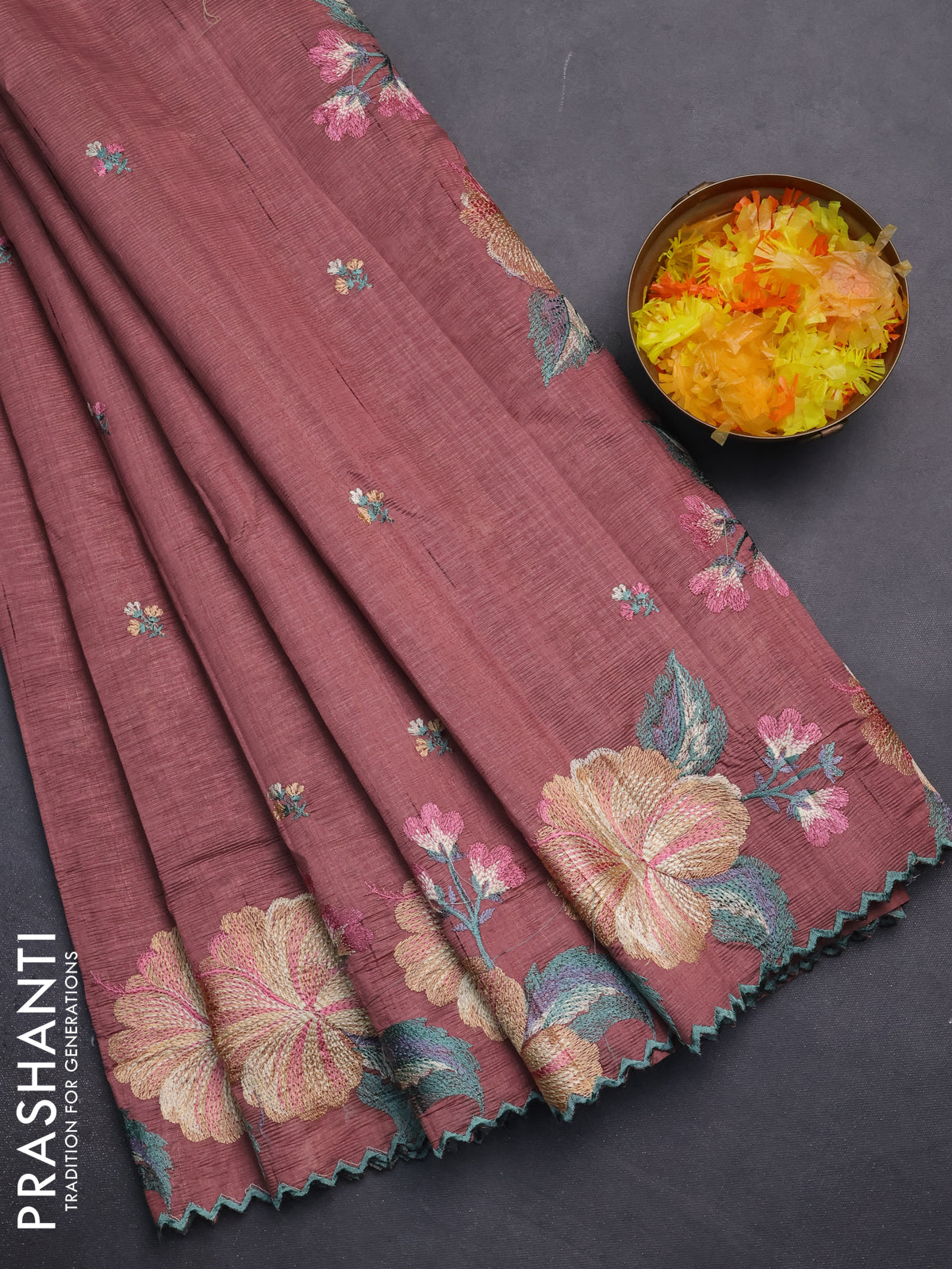 Semi raw silk saree brown shade with embroidery work buttas and floral embroidery border