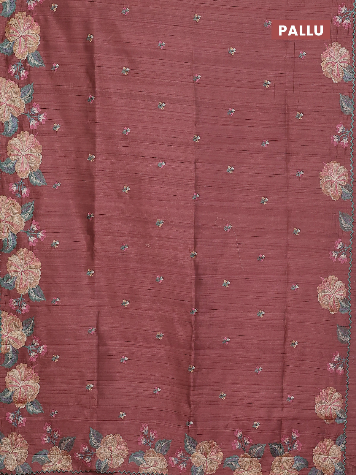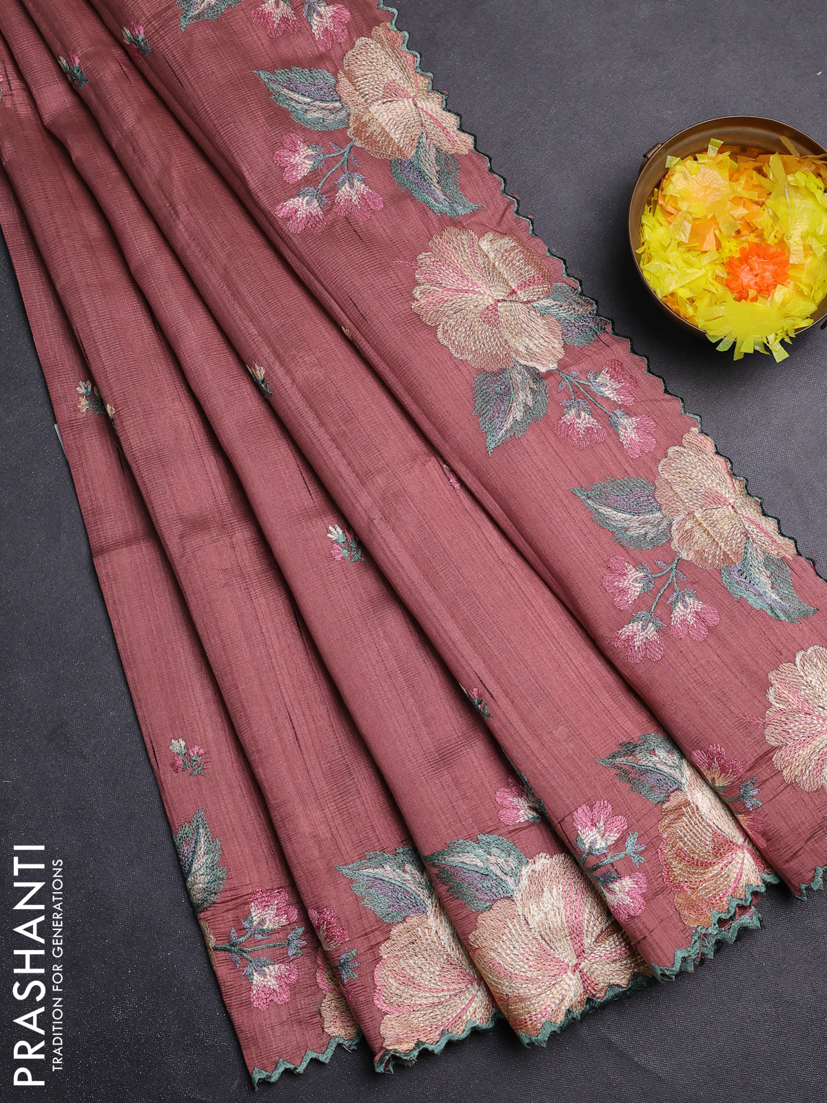 Semi raw silk saree brown with embroidery buttas and floral embroidery border