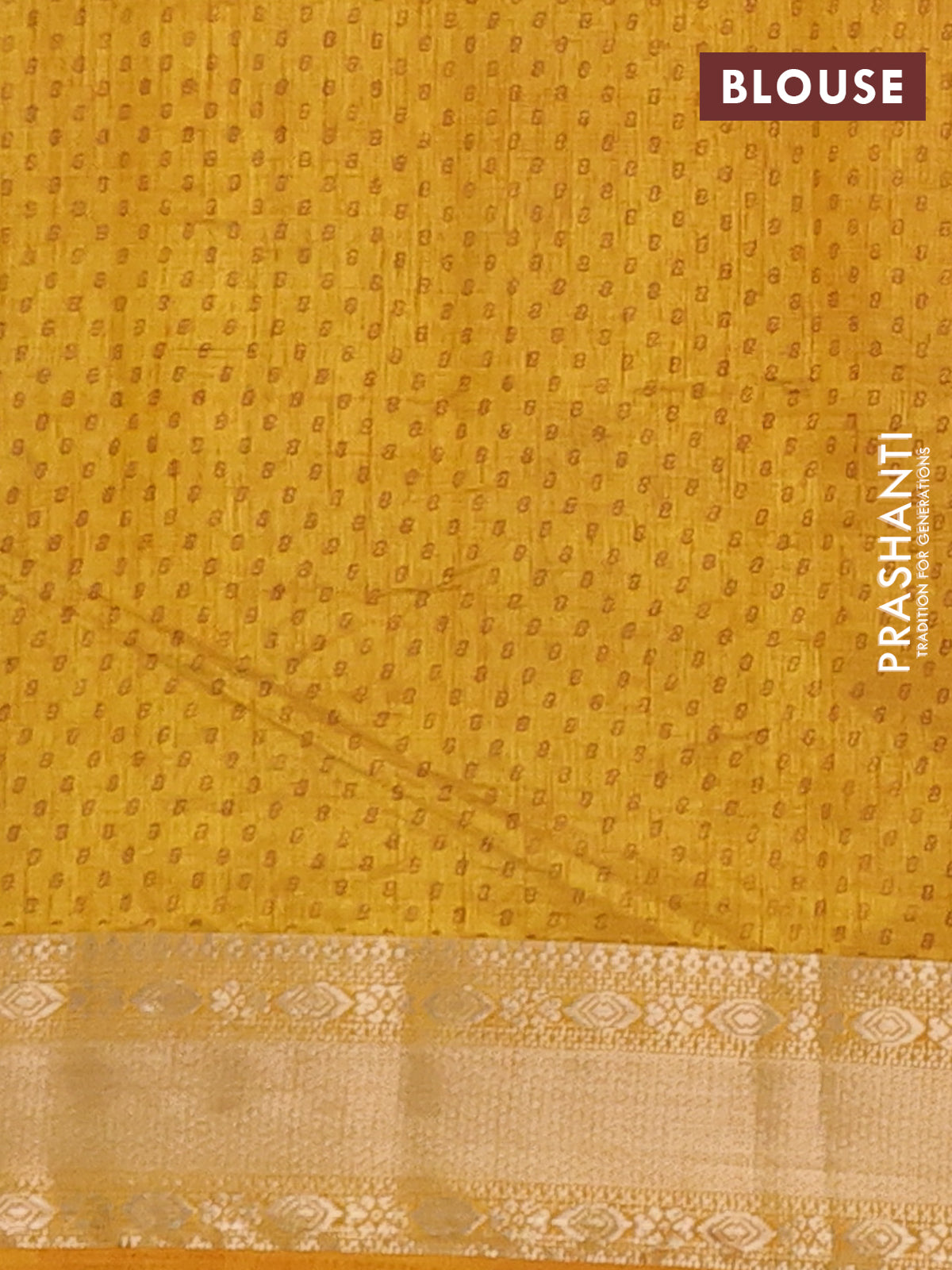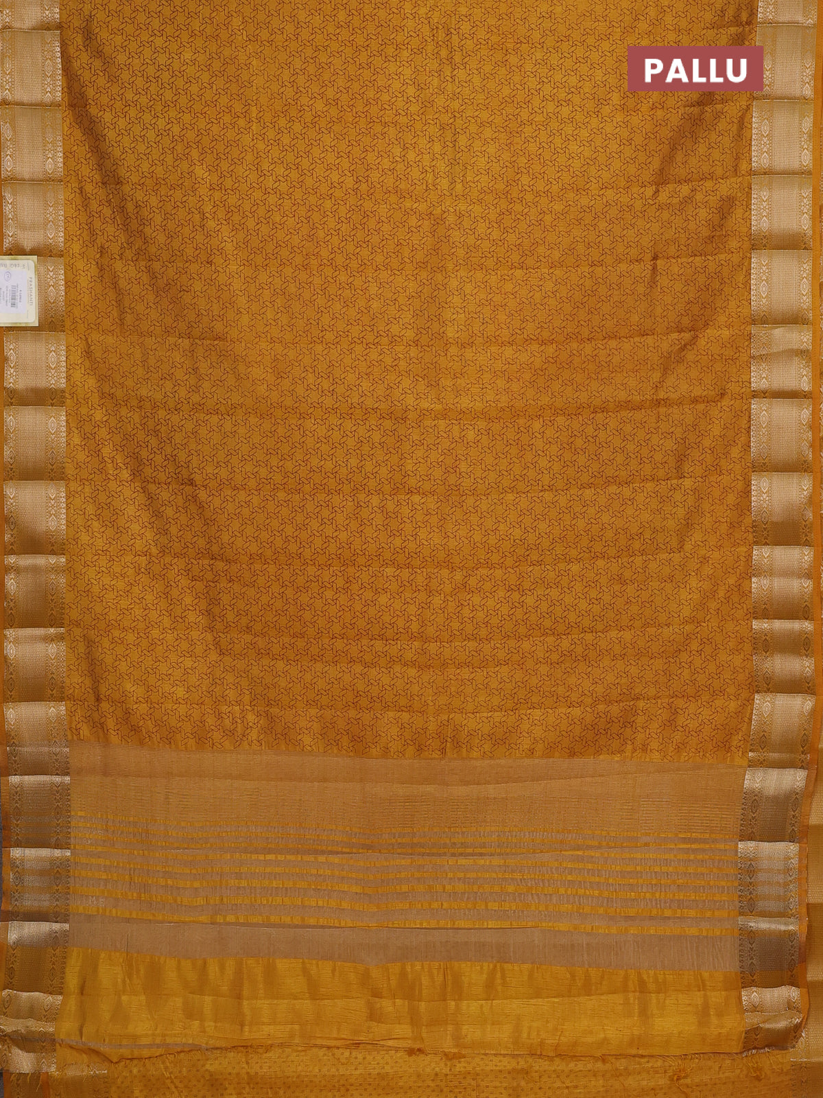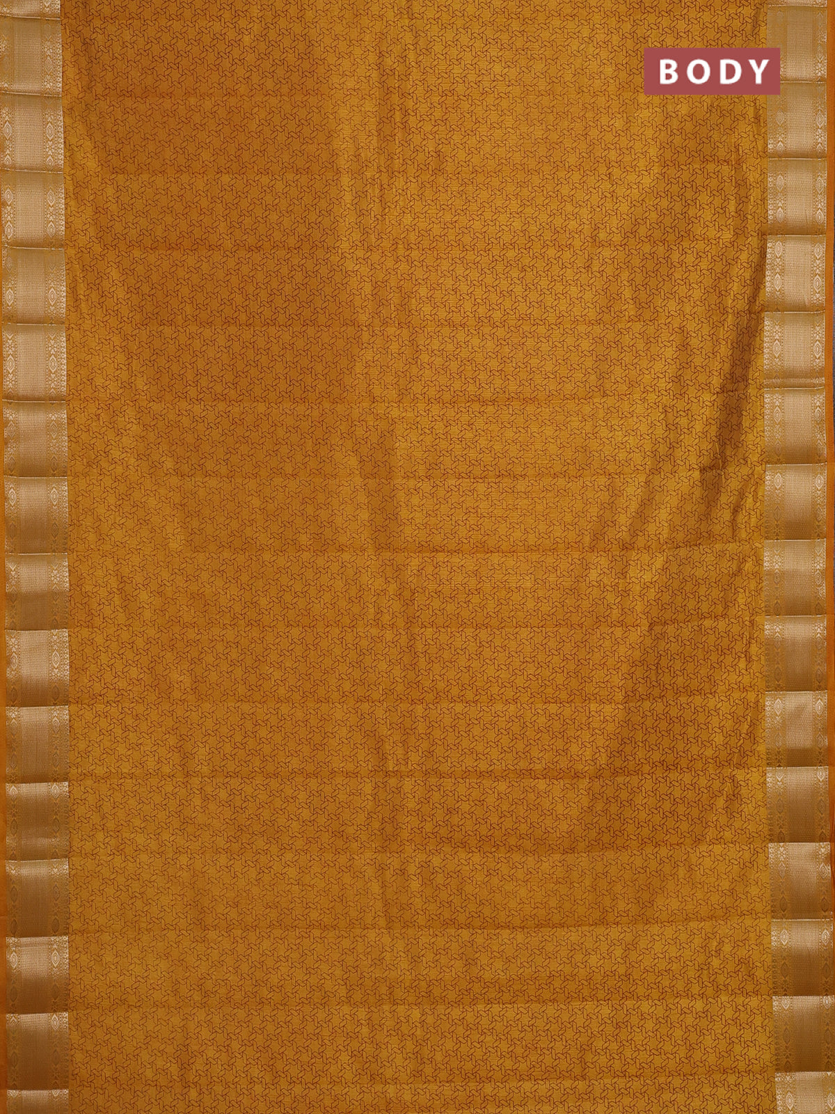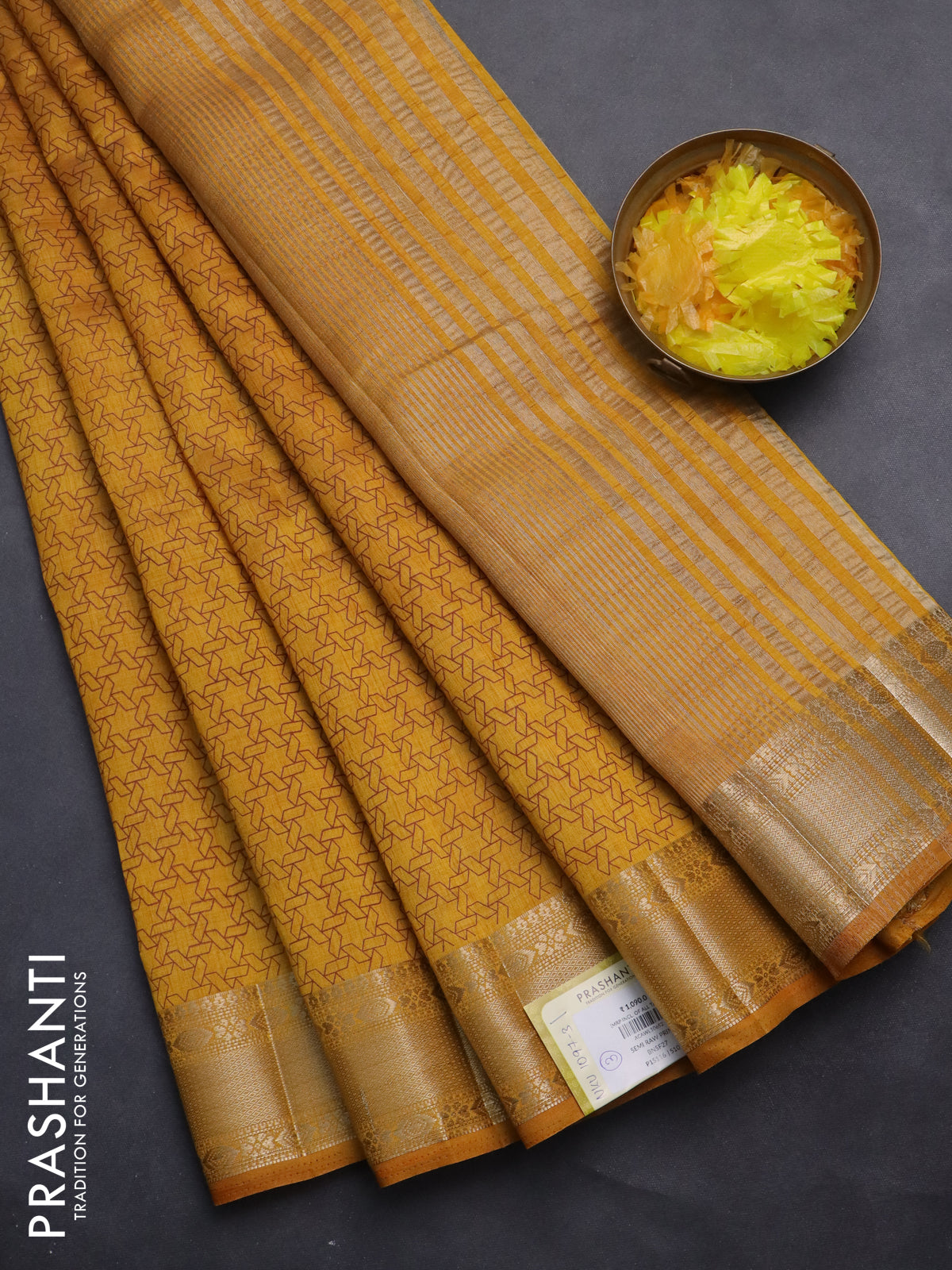 Semi raw silk saree dark mustard with allover geometric prints and zari woven border