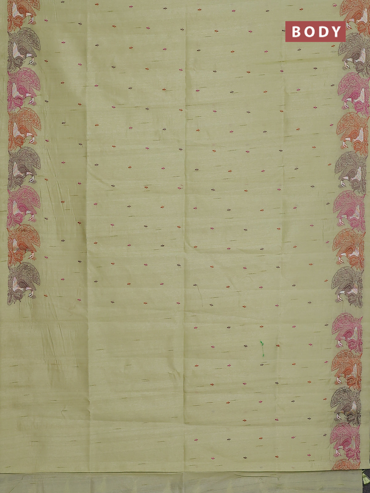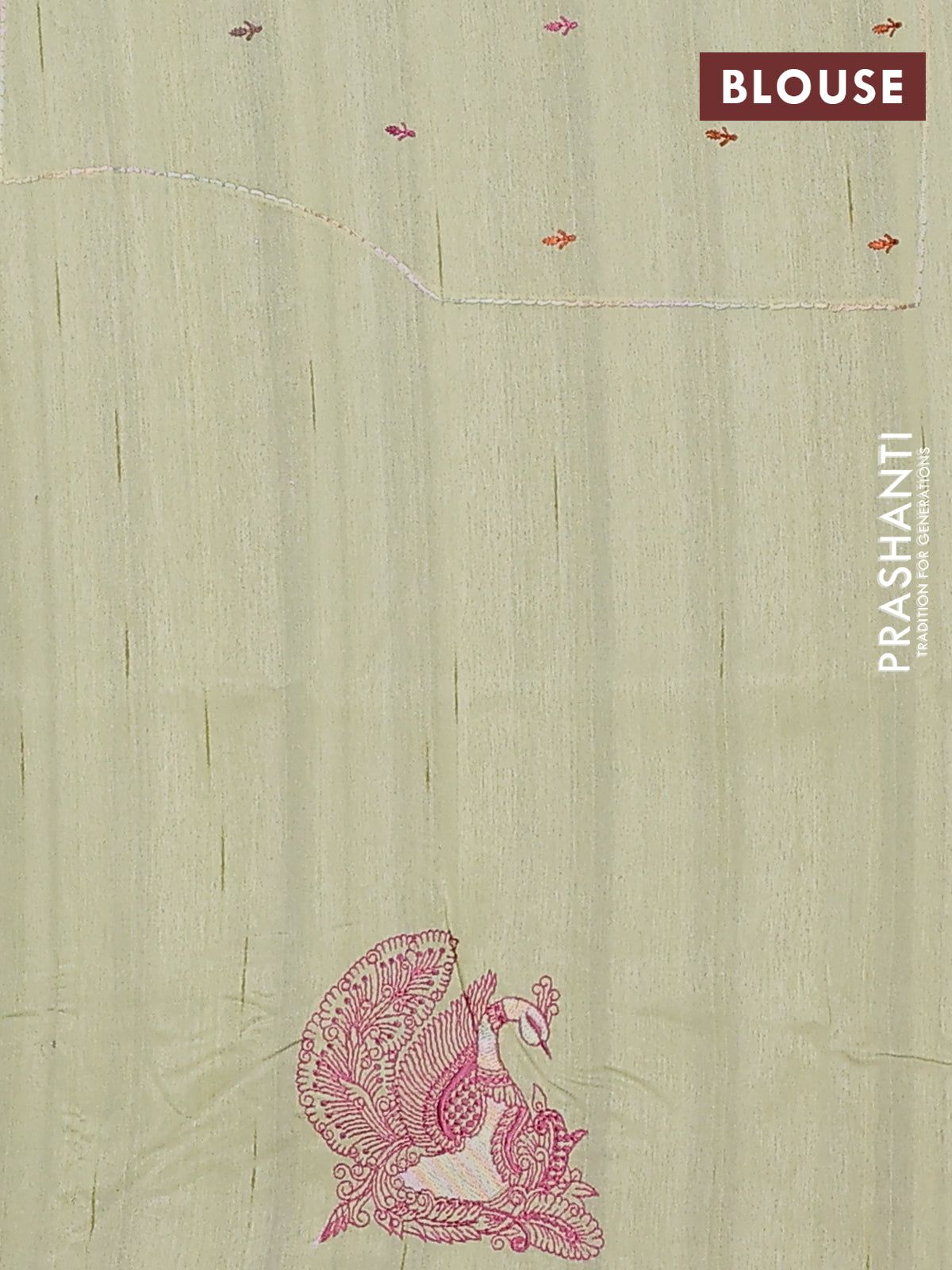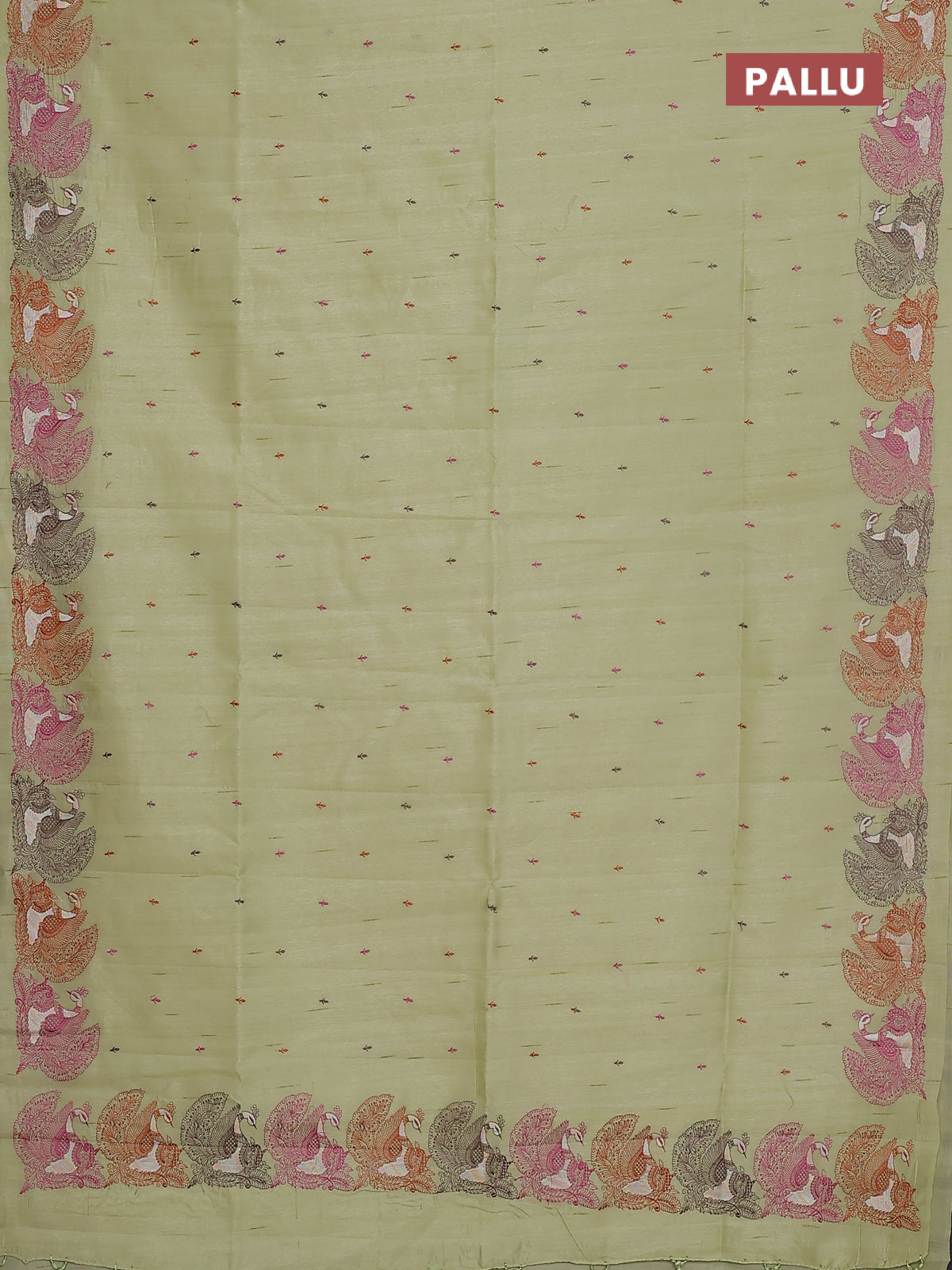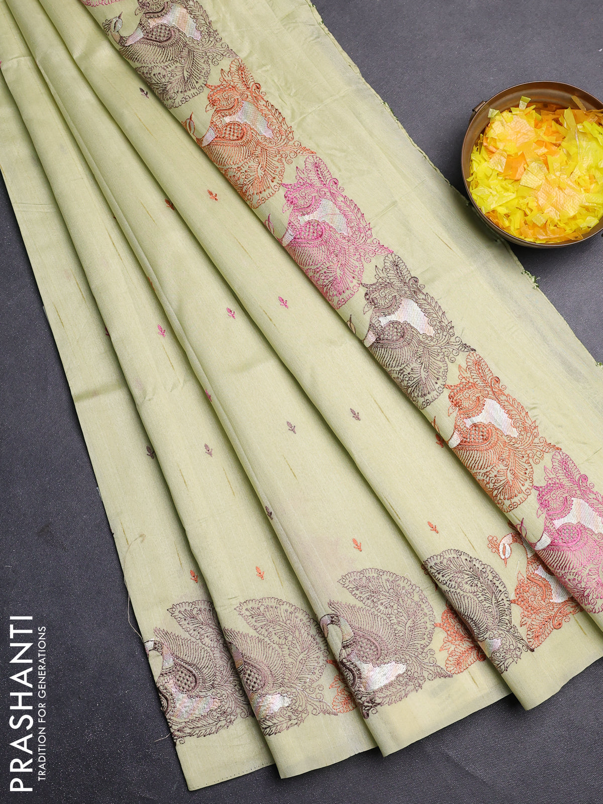 Semi raw silk saree mild pista green with allover embroidery work and peacock embroidery border