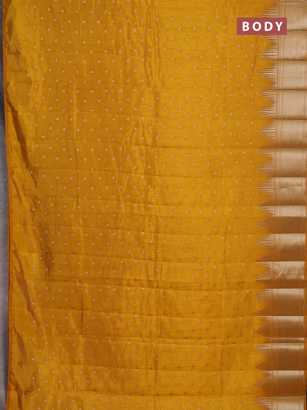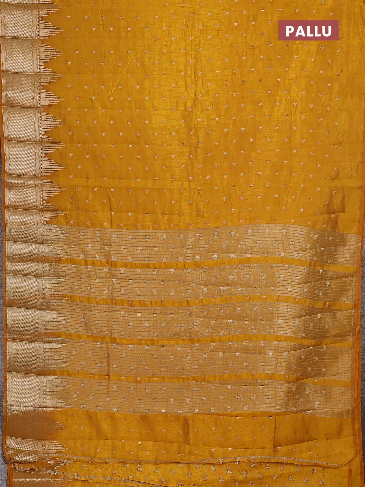 Semi raw silk saree mustard yellow with allover zari woven 1000 buttas and temple design zari woven border