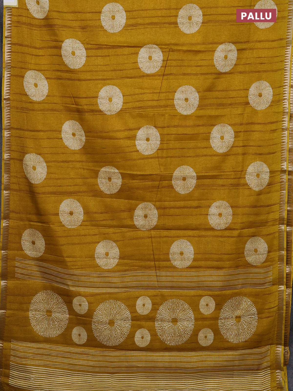 Semi raw silk saree mustard yellow with butta prints and temple design zari woven border