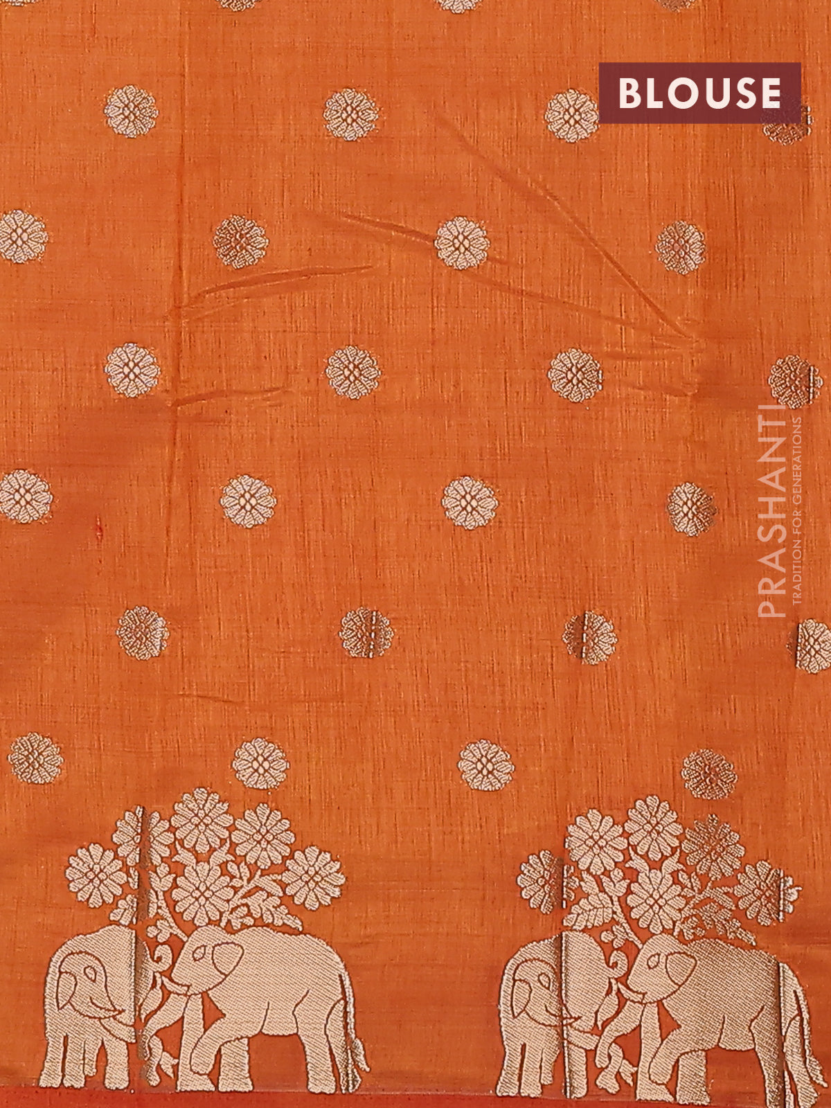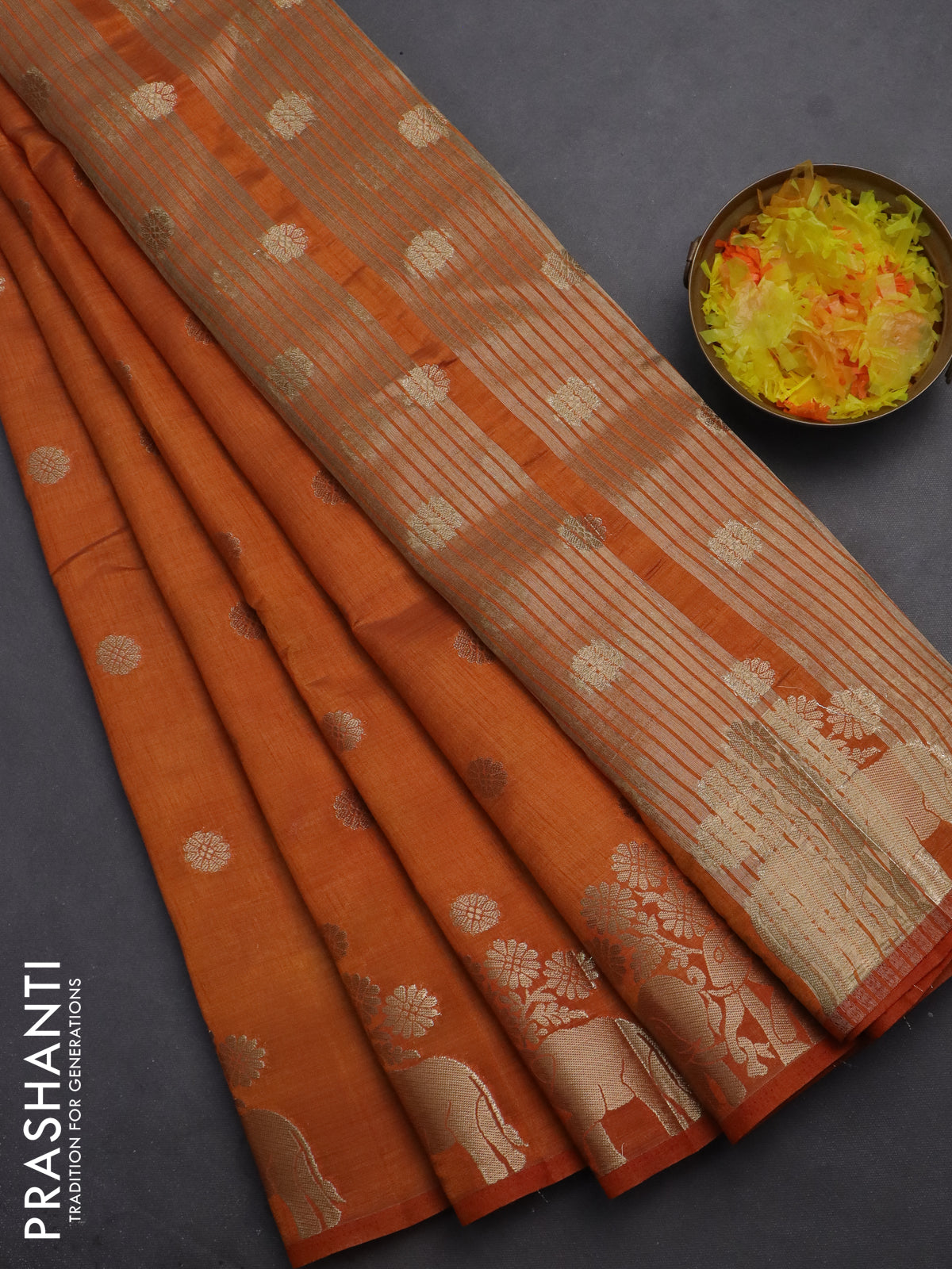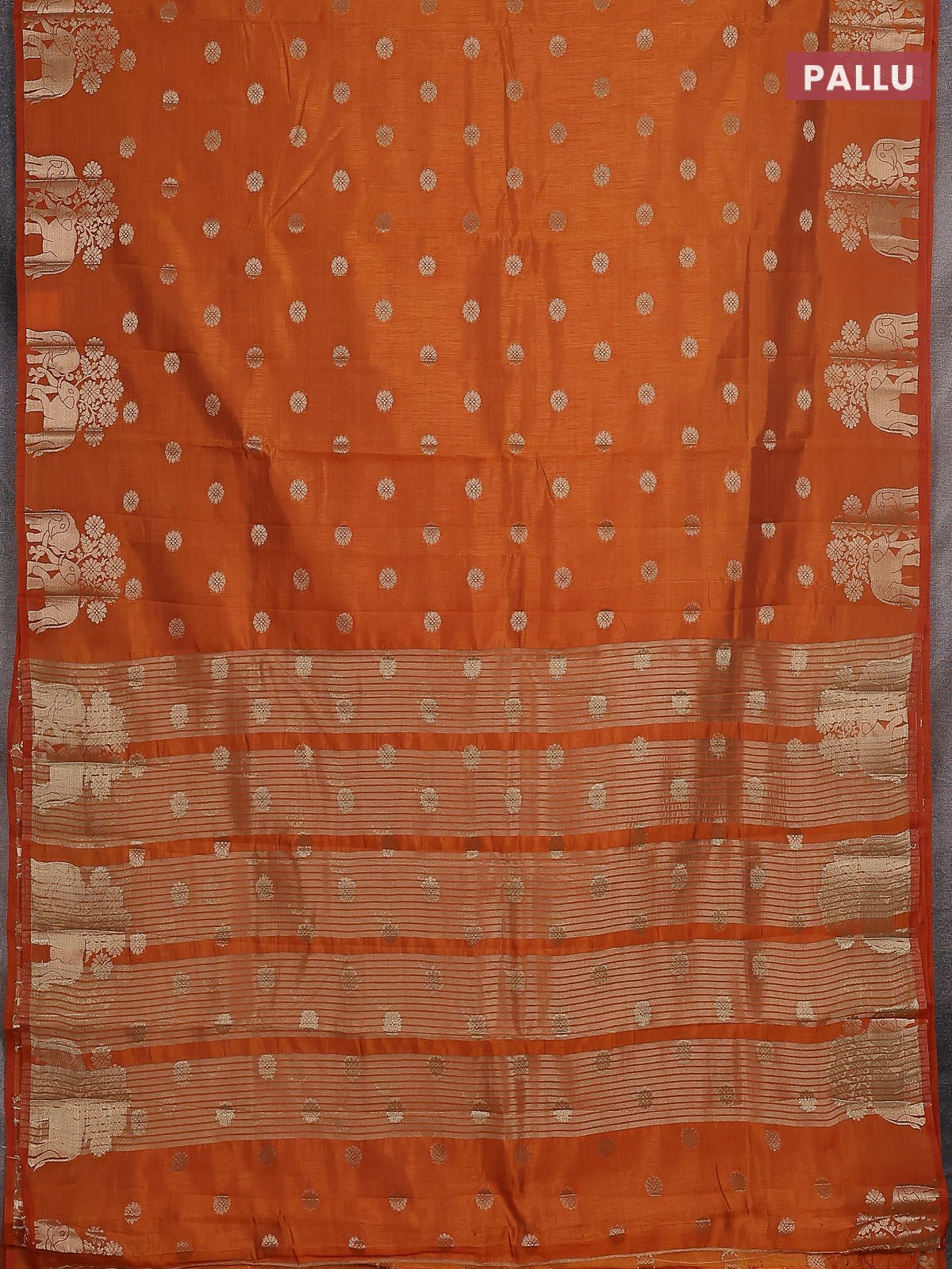 Semi raw silk saree orange with allover zari woven 1000 buttas and elephant design zari butta border
