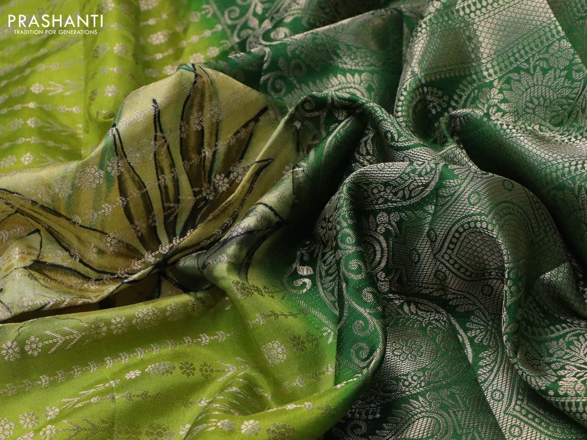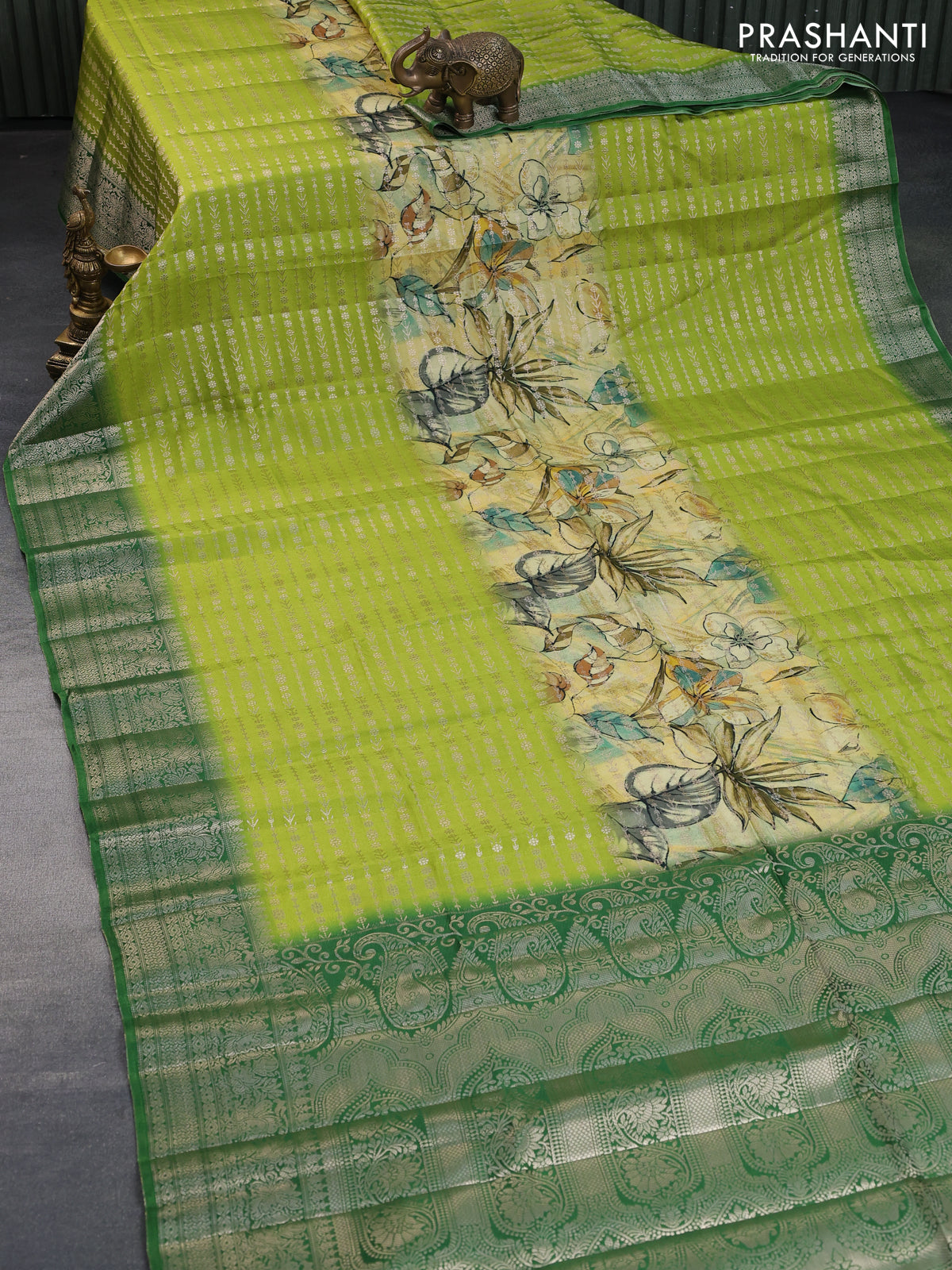 Semi raw silk saree pale yellow and lime green with allover zari weaves & floral digital prints and zari woven border