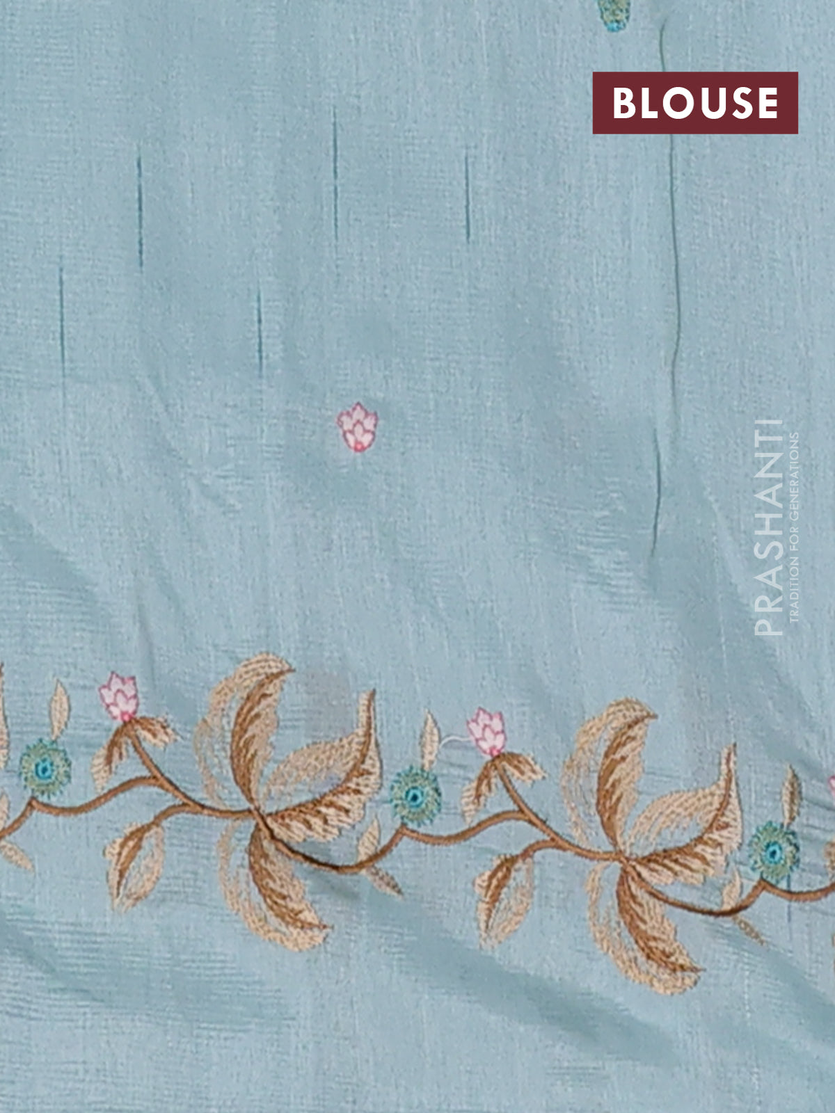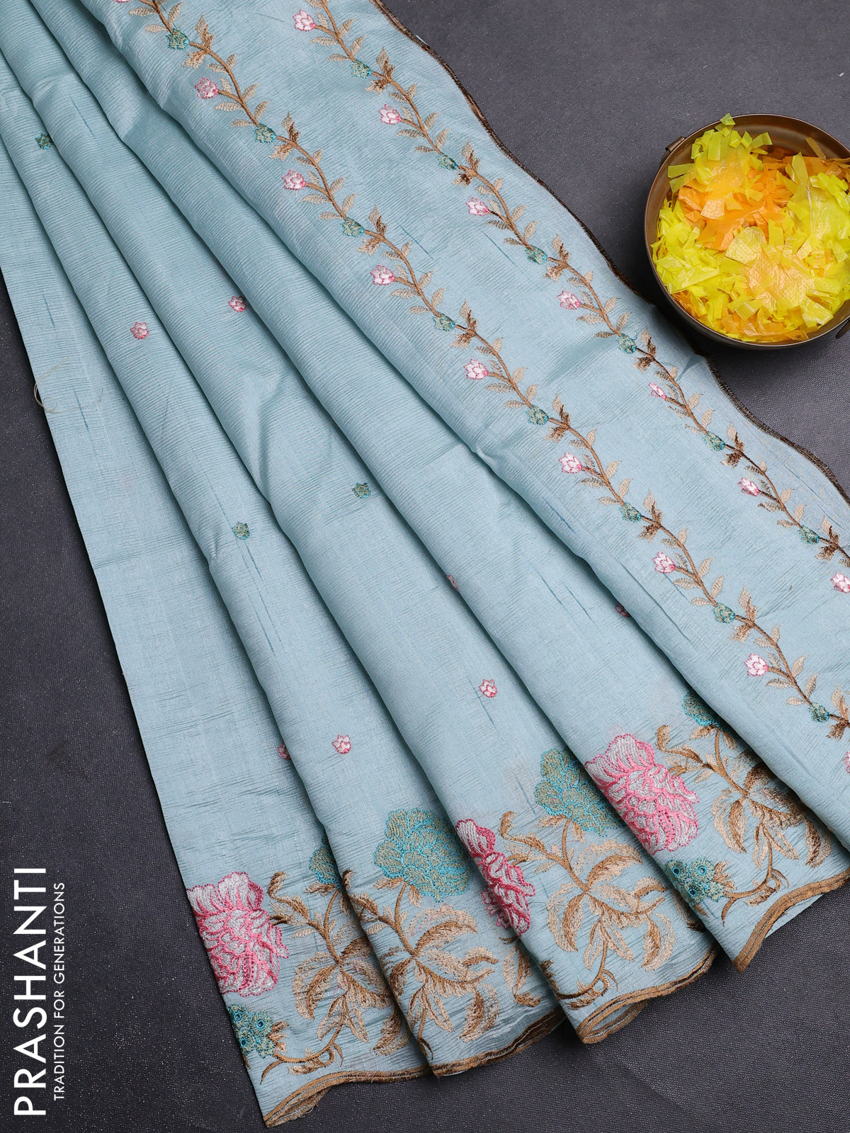 Semi raw silk saree pastel blue with embroidery buttas and floral embroidery border