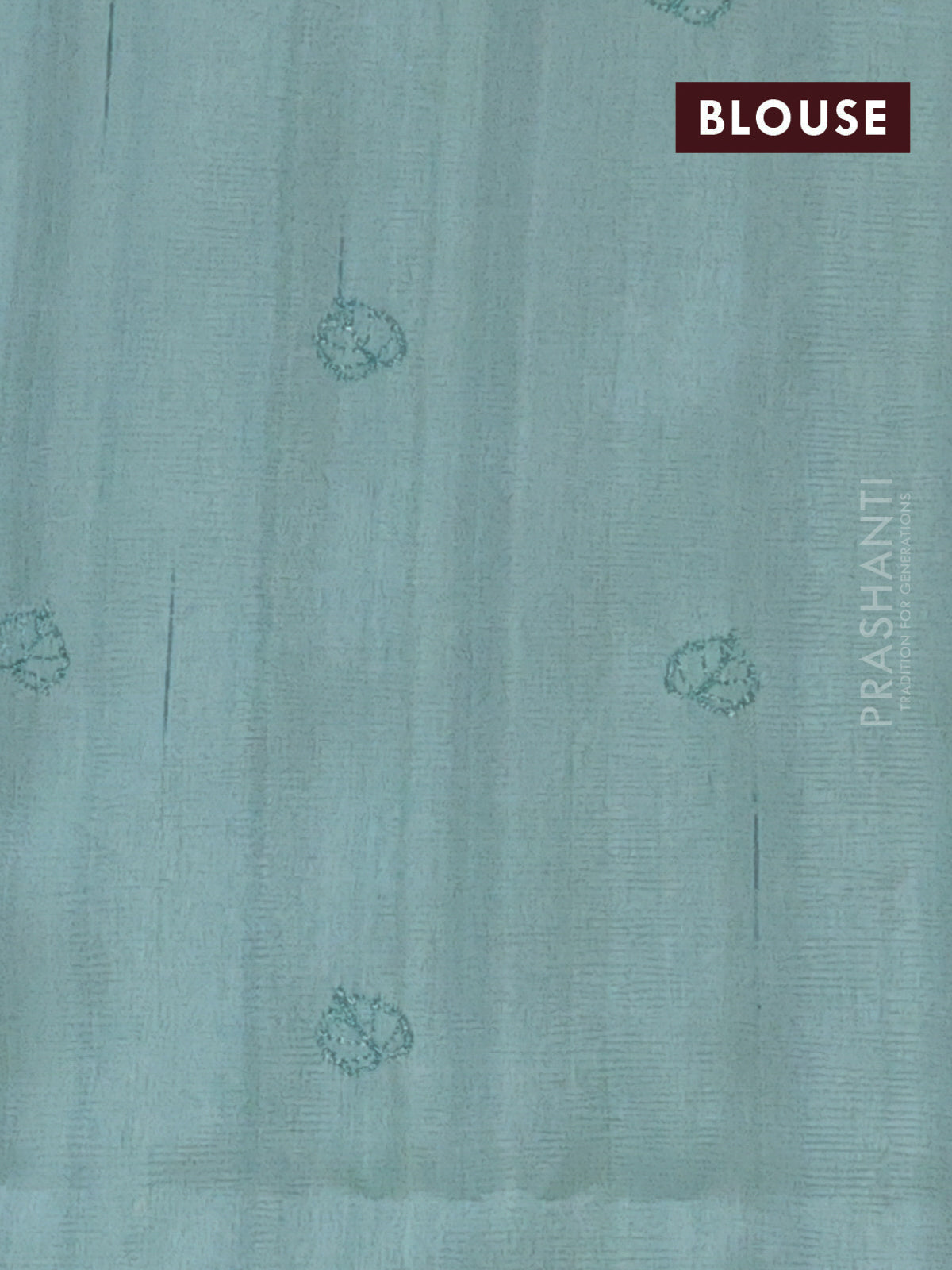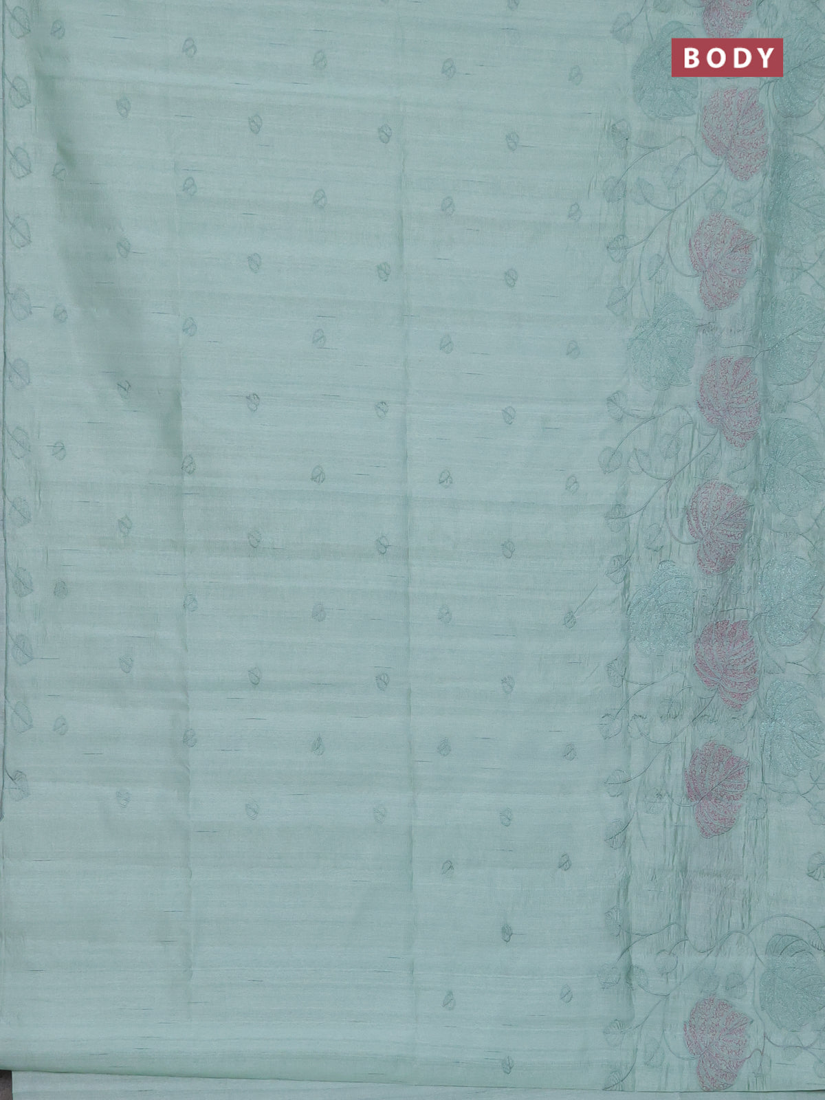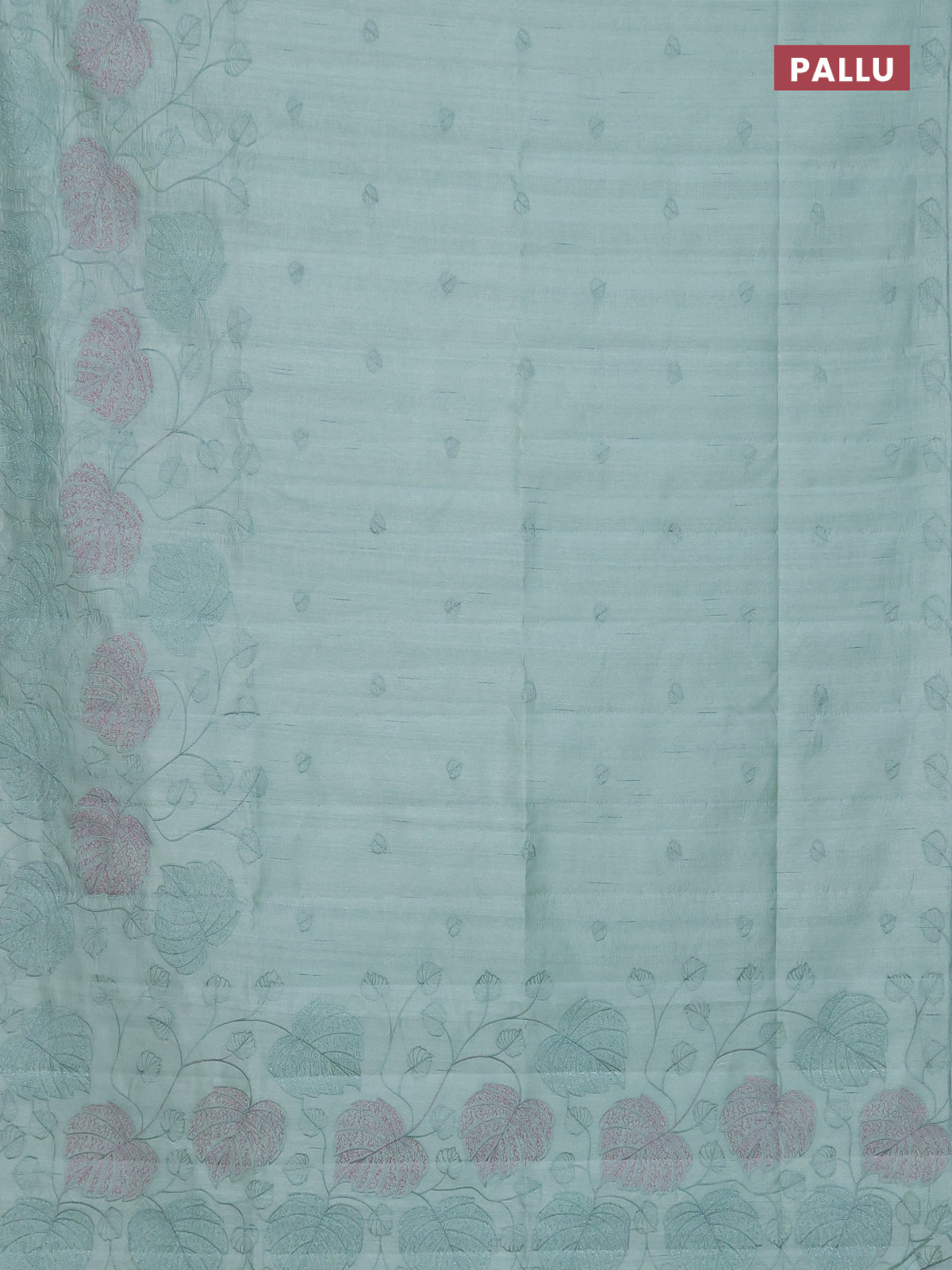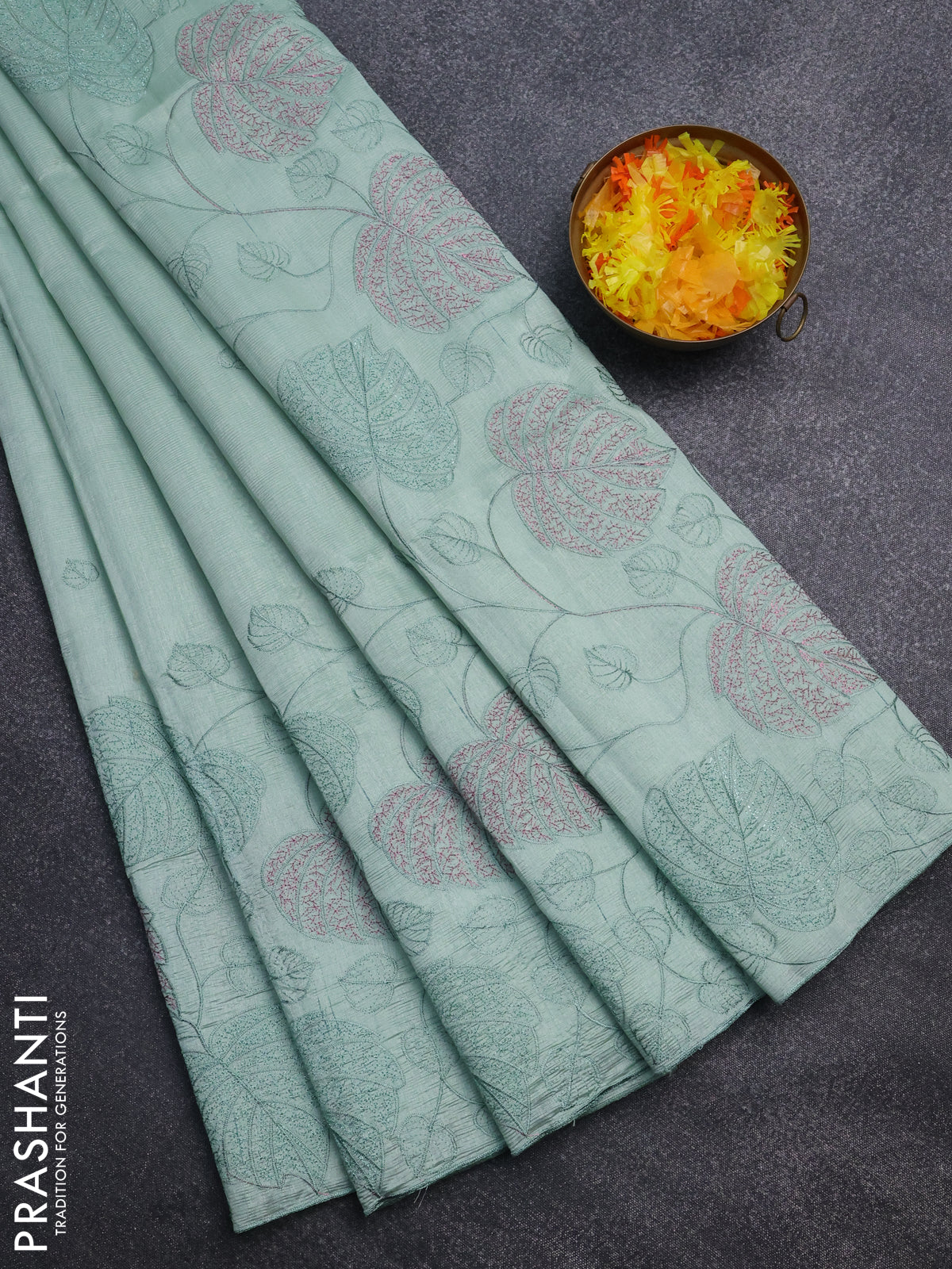 Semi raw silk saree pastel green with allover embroidery and leaf design embroidery border