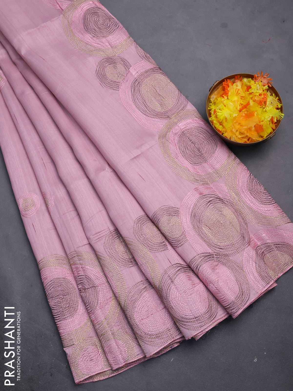 Semi raw silk saree pastel pink with embroidery work buttas and geometric design embroidery border