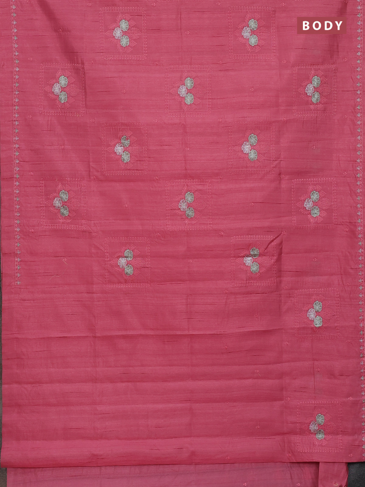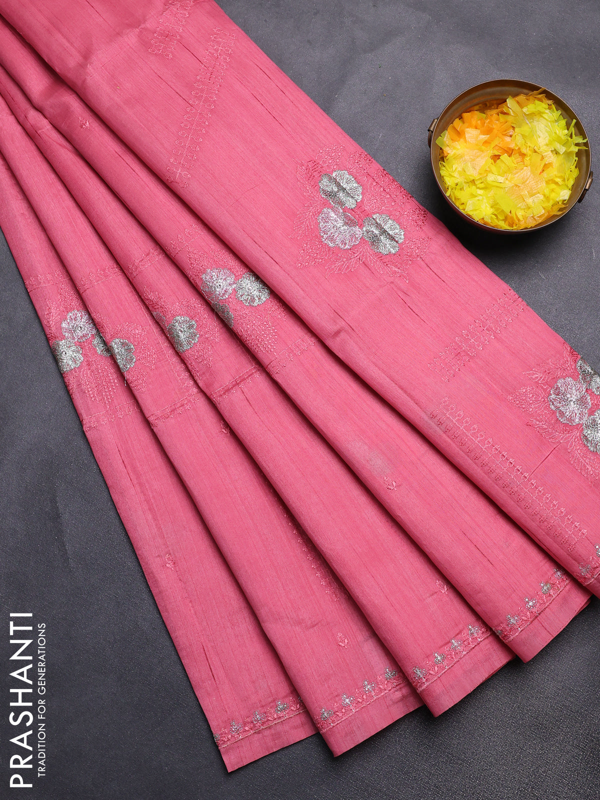 Semi raw silk saree peach pink with allover embroidery buttas and embroidery border
