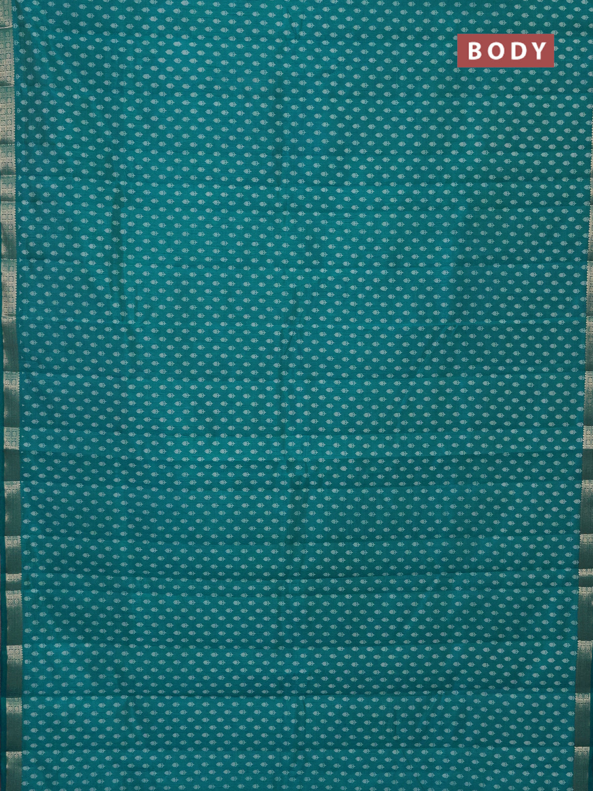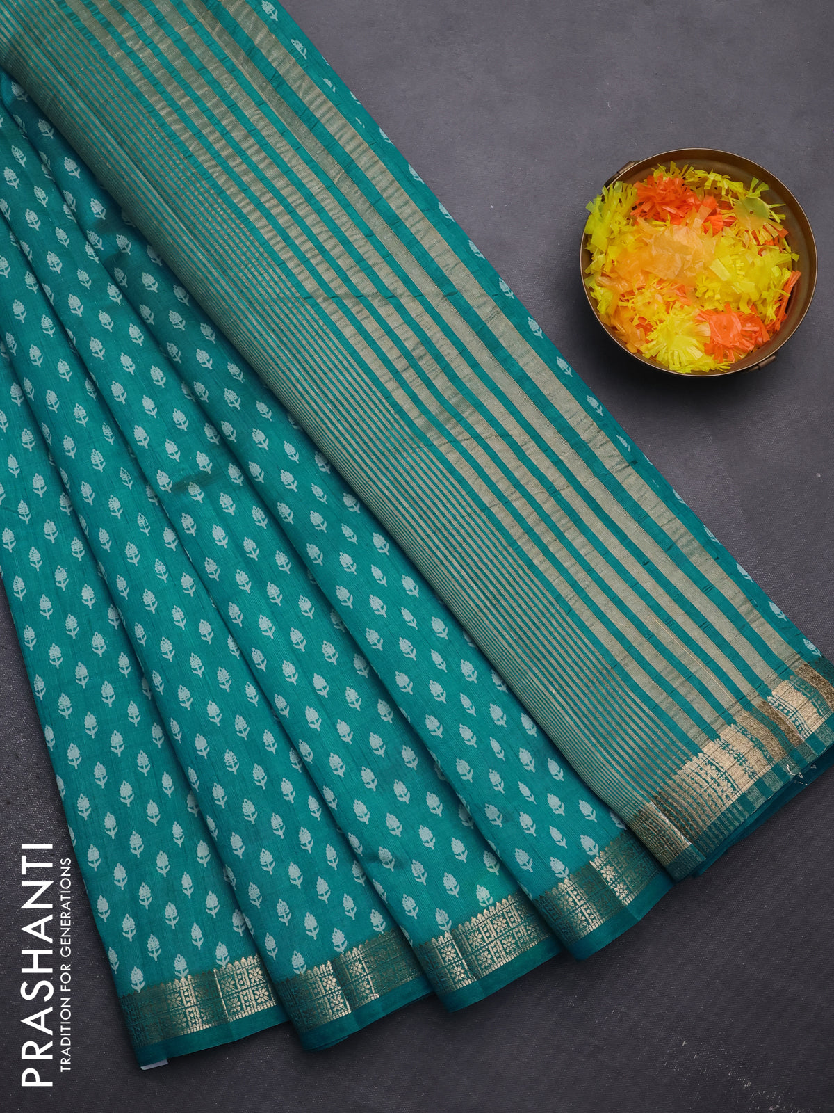 Semi raw silk saree teal blue with allover butta prints and zari woven border