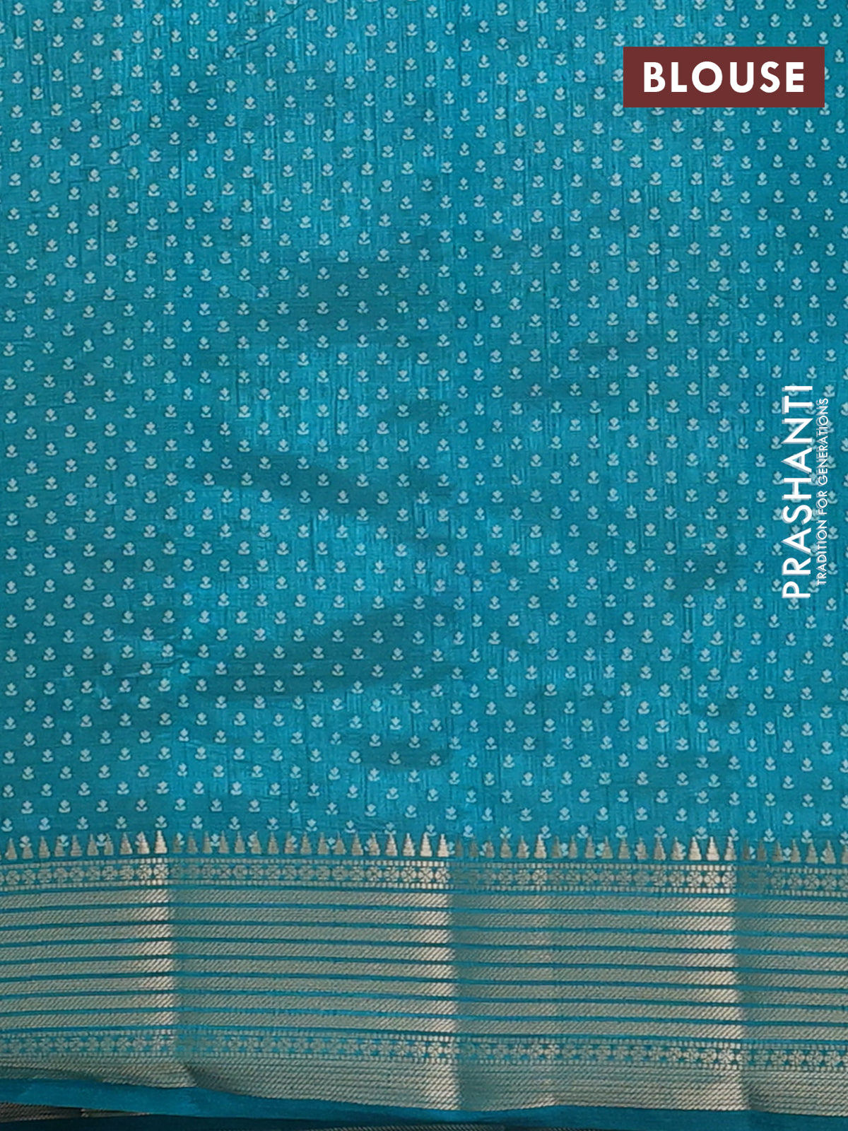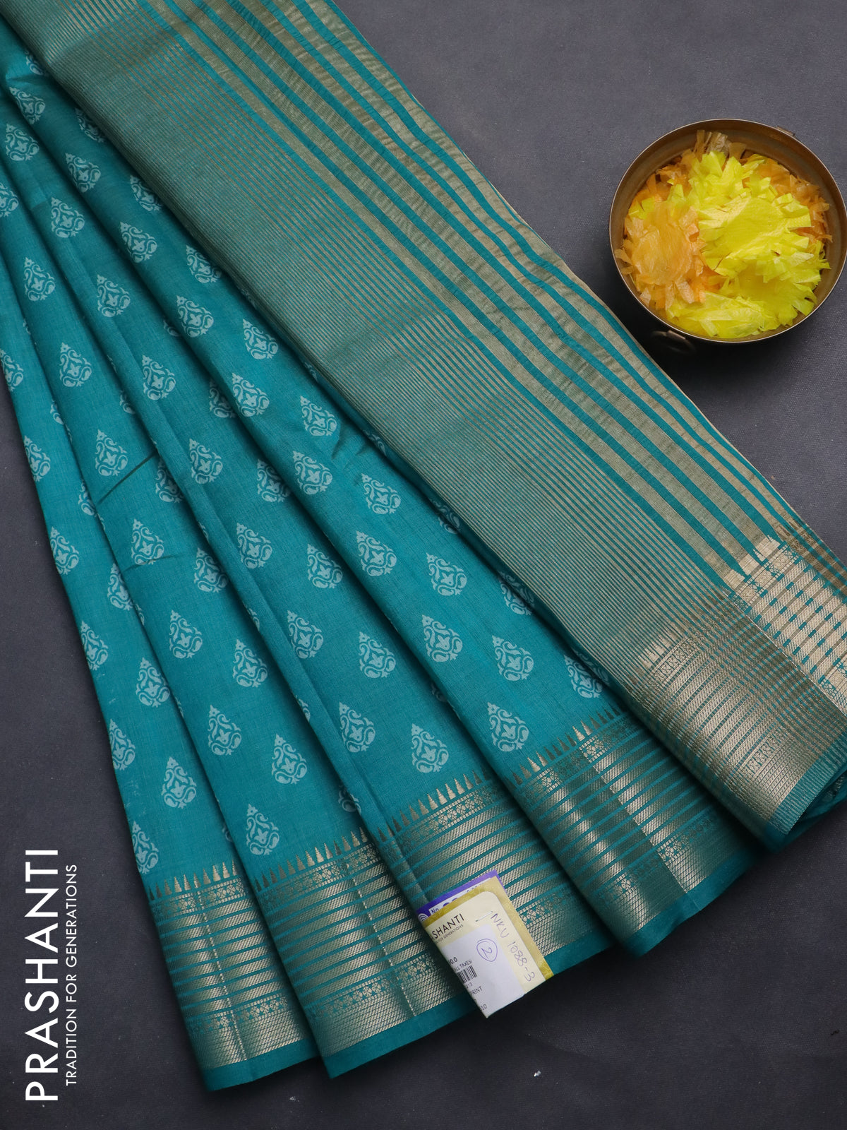 Semi raw silk saree teal green with allover butta prints and zari woven border